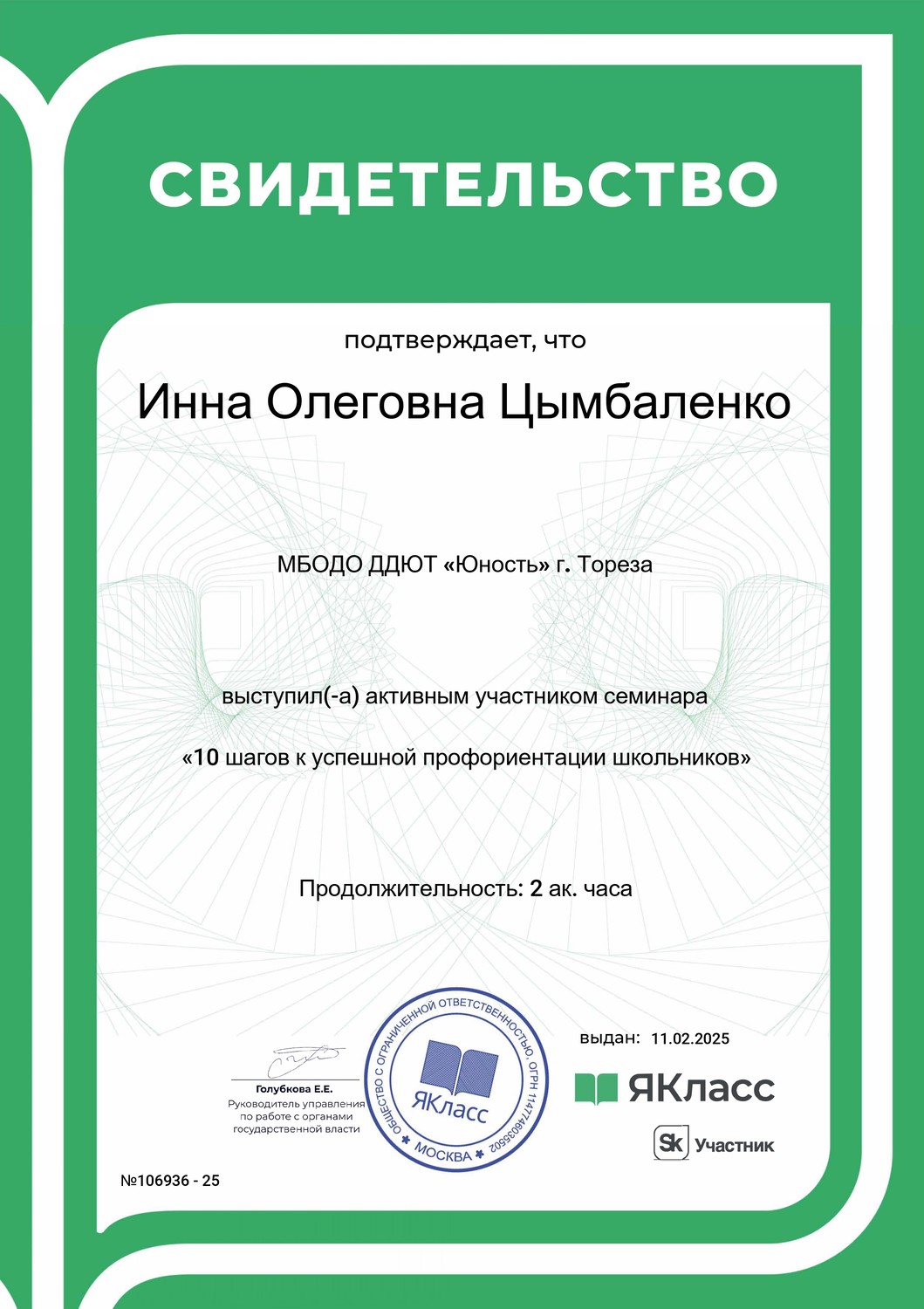 Педагог Дворца творчества приняла активное участие в семинаре «10 шагов к успешной профориентации школьников» на платформе ЯКласс. | |