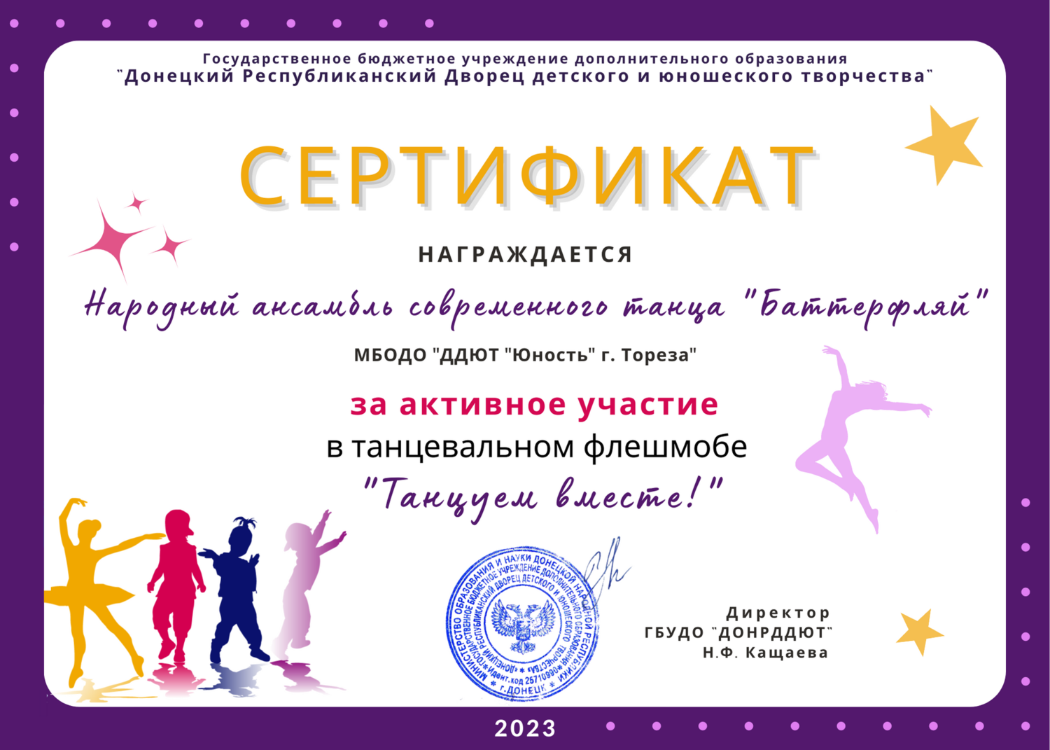 25-29 апреля народный ансамбль современного танца «Баттерфляй» (педагоги Степанова Ю.Э., педагог подготовительной группы Самарина К.В.) и школа раннего развития «Город друзей» (педагог Цымбаленко И.О.) приняли участие в танцевальном флешмобе "Танцуем вместе!" к Международному дню танца от Донецкого Республиканского Дворца творчества. Для участия в мероприятии надо было выложить на своей страничке ВК короткий видеоролик танцевальной композиции. Творческие объединения получили сертификаты за участие во флешмобе. Поздравляем! | |