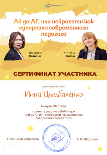 Педагог Дворца творчества Цымбаленко И.О. приняла участие в вебинаре «Ай да АI, или нейросети как суперсила современного педагога» от Обрсоюза.