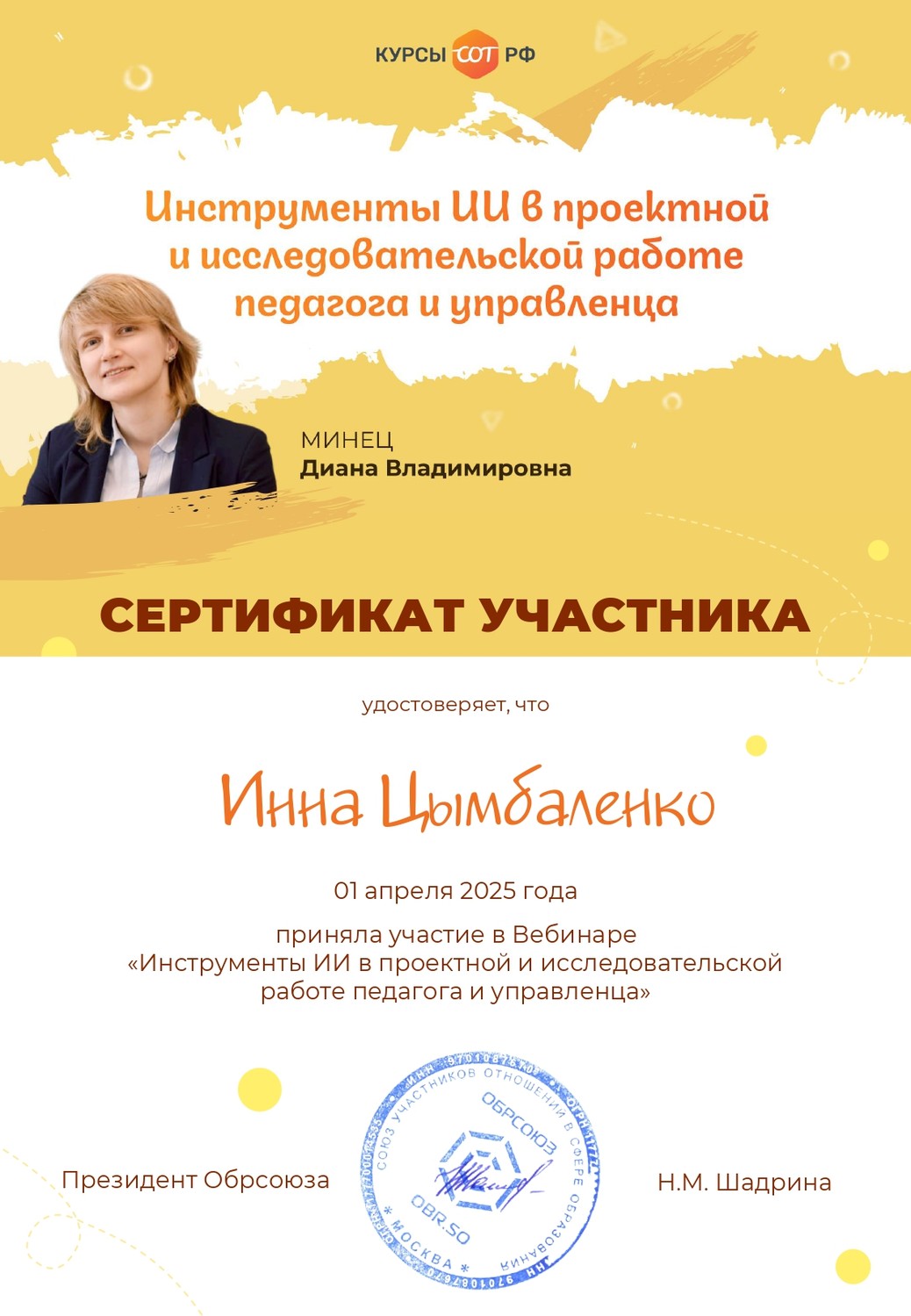Педагог Дворца творчества Цымбаленко И.О. приняла участие в вебинаре от Обрсоюза «Инструменты ИИ в проектной и исследовательской работе педагога и управленца». | |