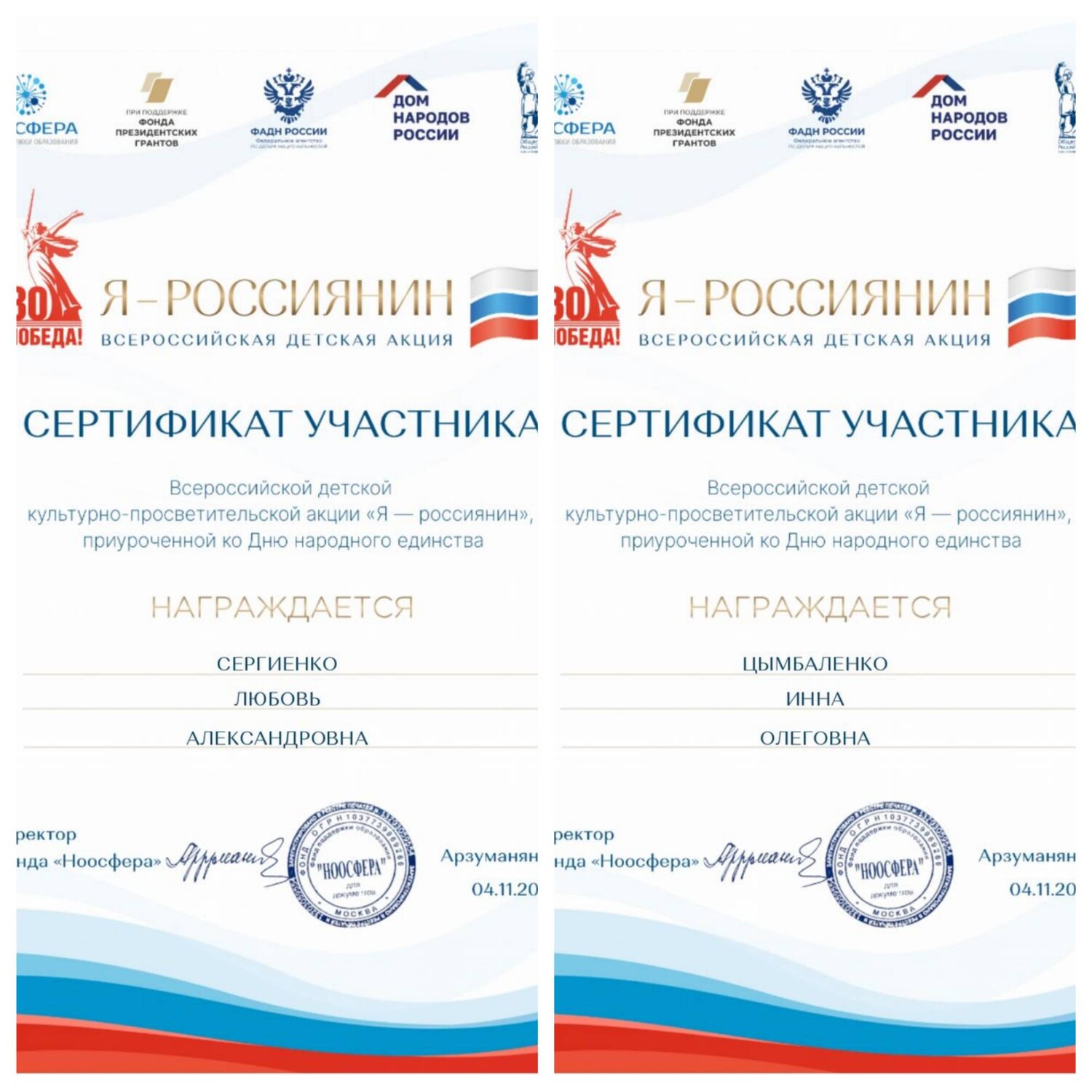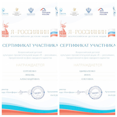 Педагоги Дворца творчества Сергиенко Л.А. и Цымбаленко И.О приняли участие во Всероссийской детской культурно-просветительской акции «Я – россиянин», приуроченной к Дню народного единства. Её цель — укрепить межнациональное и межрелигиозное единство граждан, а также рассказать подрастающему поколению о сути и истории Дня народного единства.