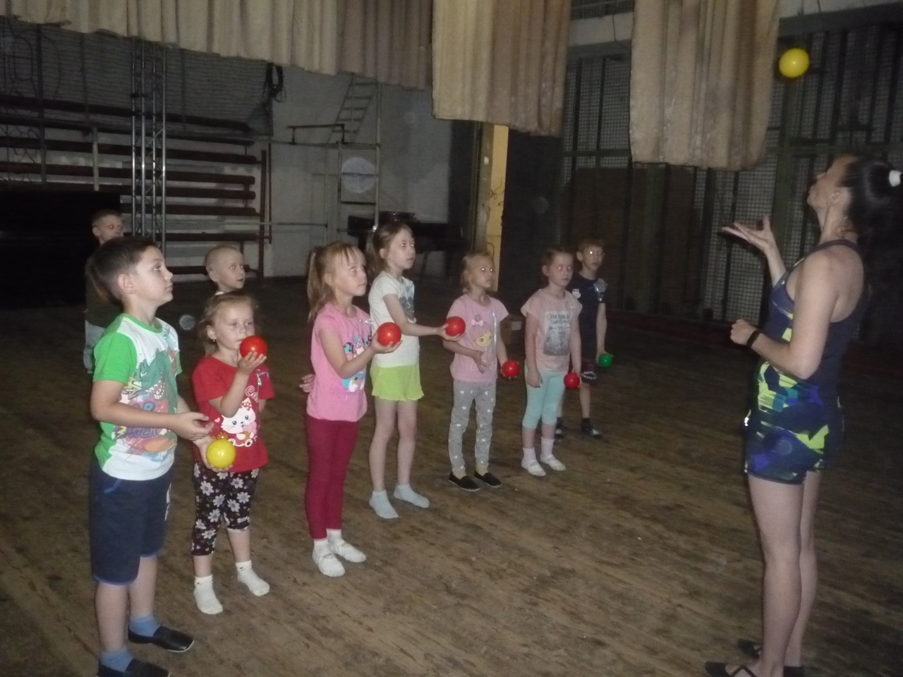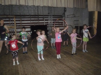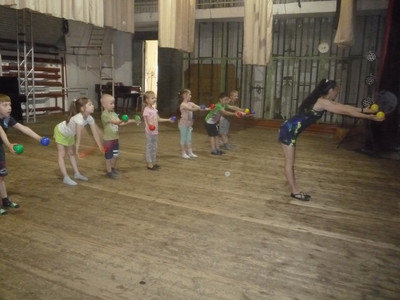 20 июня площадка досуга детей «Развлечёба» МБОДО «ДДЮТ «Юность» в рамках социального партнёрства побывала в гостях у народного циркового коллектива «Созвездие» (руководитель Лабзова В.А.) МУ «ДК им. В. Маяковского». Руководитель подготовила для малышей интересные упражнения. Дети попробовали поработать с обручами, научились вращать их в одной руке перед собой и над головой, а самые активные попробовали крутить обруч стопой. Следующее задание – упражнения с мячами: надо было подбросить и словить мяч сначала правой рукой, а потом левой, а ещё попробовать жонглировать двумя мячами. Было очень сложно, мячики не слушались, падали, но малыши упорно и терпеливо «боролись» с предметами. И последнее упражнение-прыжки через большую скакалку. Дети попробовали прыгать по одному, по парам и всей группой. Самым интересным для малышей было выполнение упражнений с обручами, мячами и скакалкой под музыку. Такое социальное партнёрство помогает познакомить детей и родителей с разнообразным миром культуры и искусства.