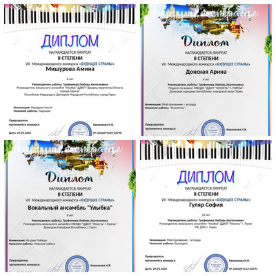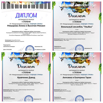 Вокальный ансамбль «Улыбка» принял участие в VII Международном конкурсе «Будущее страны» и завоевал 4 первых и 4 вторых места! Лауреаты 1-ой степени – дуэт (Высочин Михаил и Мишурова Амина, песня «Девчонка и хулиган», номинация «Ни дня без песни»); дуэт (Ангелина и Екатерина Таран, песня «Весенний джаз», номинация «Пою для вас»); старшая группа ансамбля («Кино идёт», номинация «В бой идут одни старики (конкурс военной песни)); Кравченко Давид («Мир детям», номинация «В бой идут одни старики (конкурс военной песни)). Лауреаты 2-ой степени - младшая группа ансамбля («Мирные небеса», номинация «Ко Дню Победы»); Гуляр София («Крокодил», номинация «Моё призвание - эстрада»); Донская Арина («Кнопочка», номинация «Моё призвание - эстрада»); Мишурова Амина («Ладошка», номинация «Народная песня»). Молодцы! Так держать!