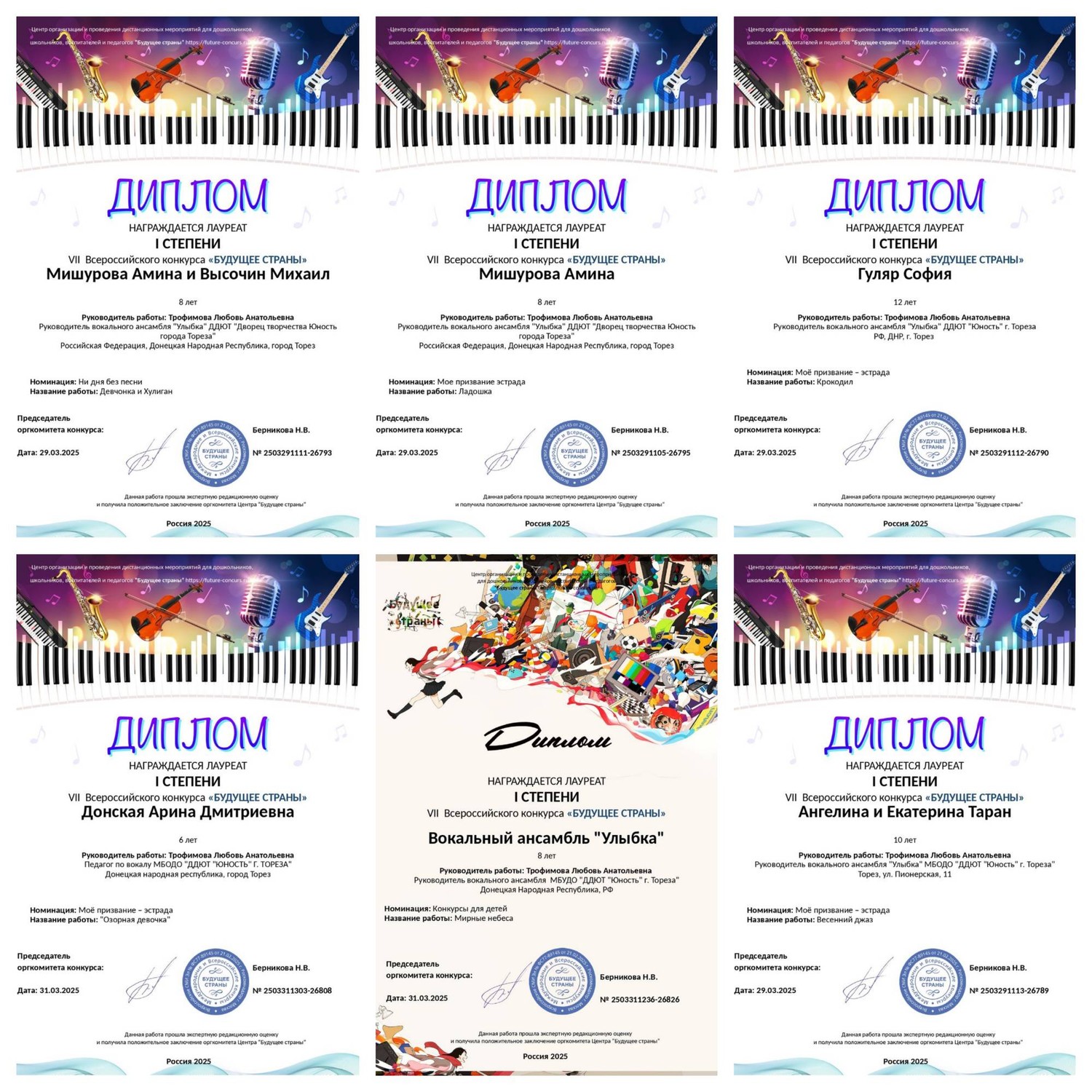 Вокальный ансамбль «Улыбка» принял участие в VII Всероссийском конкурсе «Будущее страны» и завоевал 6 призовых мест! Лауреаты 1-ой степени – дуэт (Высочин Михаил и Мишурова Амина, песня «Девчонка и хулиган», номинация «Ни дня без песни»); Мишурова Амина («Ладошка», номинация «Моё призвание - эстрада»); Гуляр София («Крокодил», номинация «Моё призвание - эстрада»); Донская Арина («Озорная девчонка», номинация «Моё призвание - эстрада»); младшая группа ансамбля («Мирные небеса», номинация «Конкурсы для детей»); дуэт (Ангелина и Екатерина Таран, песня «Весенний джаз», номинация «Моё призвание - эстрада»). Поздравляем и желаем дальнейших творческих успехов! | |