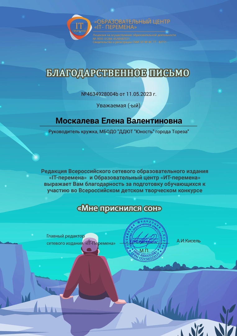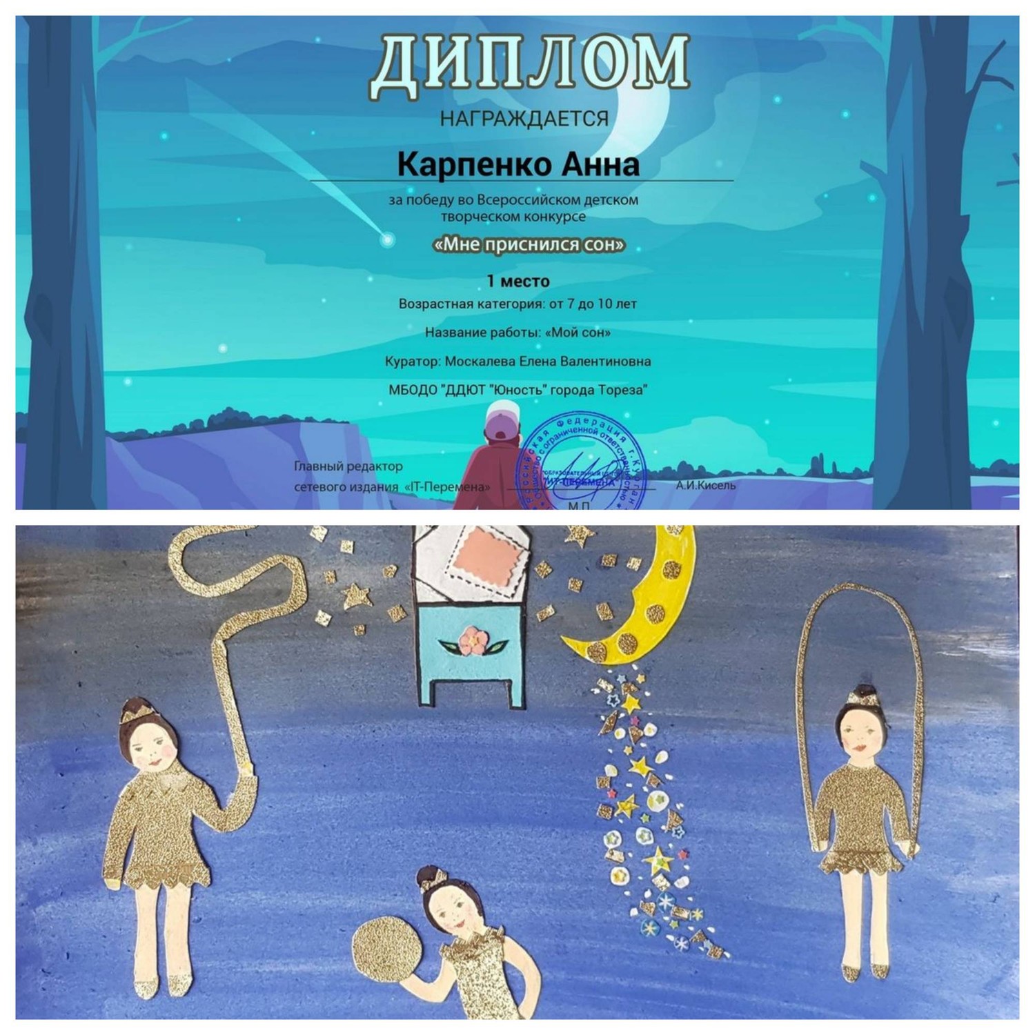 С 4 по 10 мая обучающаяся образцового художественного коллектива «Школа красоты» (педагог Москалева Е.В.) Карпенко Анна приняла участие во Всероссийском детском конкурсе аппликаций «Мне приснился сон». Организатор конкурса: «Образовательный центр «IT-Перемена». Цель конкурса: предоставление возможности демонстрации творческих способностей в конкурсной форме. Задачи конкурса: • конкурс направлен на стимулирование творческой деятельности; • выявление, сопровождение и поддержку талантливых участников конкурса в области декоративно-прикладного творчества. Часто сны детям кажутся слишком реалистичными и запоминаются надолго. На конкурс принимались работы детей на тему того, что снится им, когда они спят, какой сон им запомнился и понравился, как они его поняли и трактовали. Результаты конкурса – 1-е место! Педагог награждена благодарственным письмом. Поздравляем и желаем творческих успехов! | |
