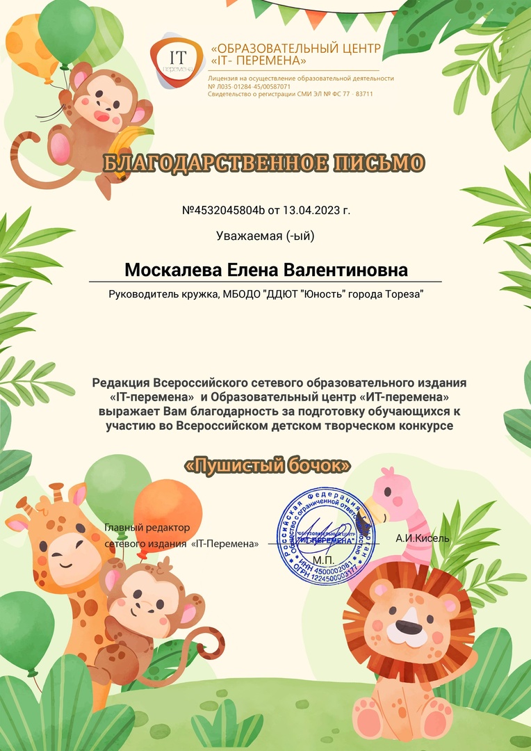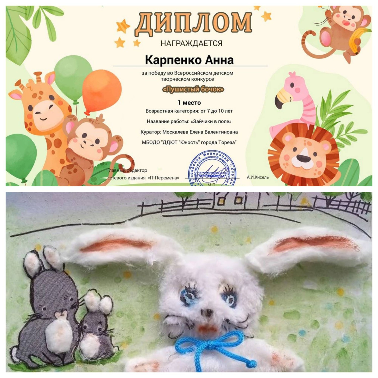 С 6 апреля по 12 апреля 2023 года обучающаяся образцового художественного коллектива «Школа красоты» (педагог Москалева Е.В.) Карпенко Анна приняла участие во Всероссийском детском конкурсе аппликаций «Пушистый бочок» (г. Курган). Организатор конкурса: «Образовательный центр «IT-Перемена». Цель конкурса: предоставление возможности демонстрации творческих способностей в конкурсной форме. Задачи конкурса: • конкурс направлен на стимулирование творческой деятельности; • выявление, сопровождение и поддержку талантливых участников конкурса в области декоративно-прикладного творчества.