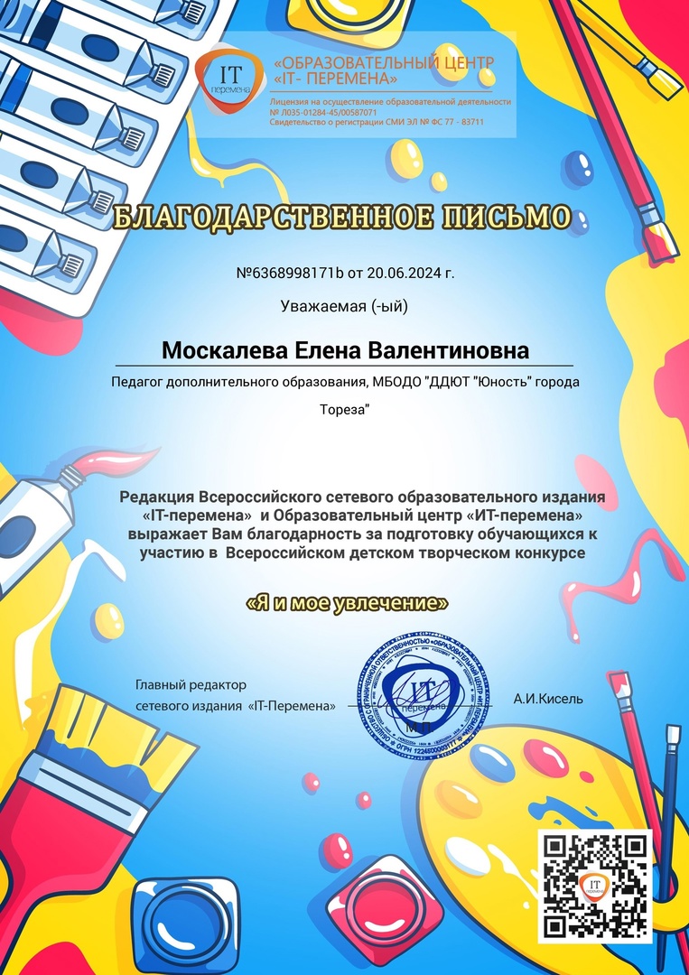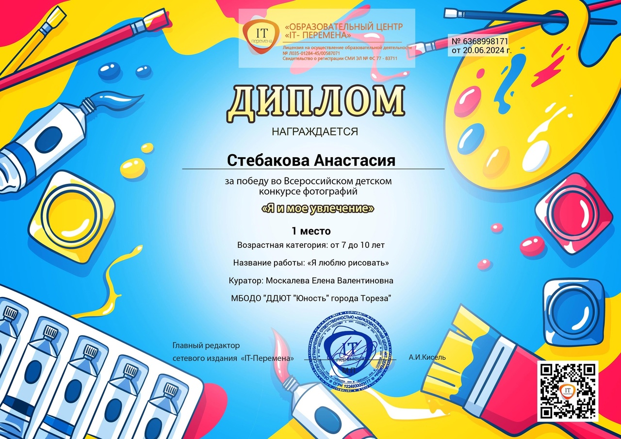 С 13 по 19 июня обучающаяся образцового художественного коллектива «Школа красоты» (педагог Москалева Е.В.) Стебакова Анастасия приняла участие во Всероссийском детском конкурсе фотографий «Я и моё увлечение» (ООО «Образовательный центр «ИТ-перемена», г. Курган). Цель конкурса: предоставление возможности демонстрации творческих способностей в конкурсной форме. Задачи конкурса: • конкурс направлен на стимулирование творческой деятельности; • выявление, сопровождение и поддержку талантливых участников конкурса в области декоративно-прикладного творчества. Забудь об обыденности и позволь миру увидеть свои грезы, страсти и невероятные таланты через объектив фотокамеры. Это уникальная возможность для детей поделиться тем, чем они живут и чему учатся каждый день. Итоги конкурса – первое место! Руководитель награждена благодарственным письмом. Поздравляем и желаем дальнейших творческих успехов!
