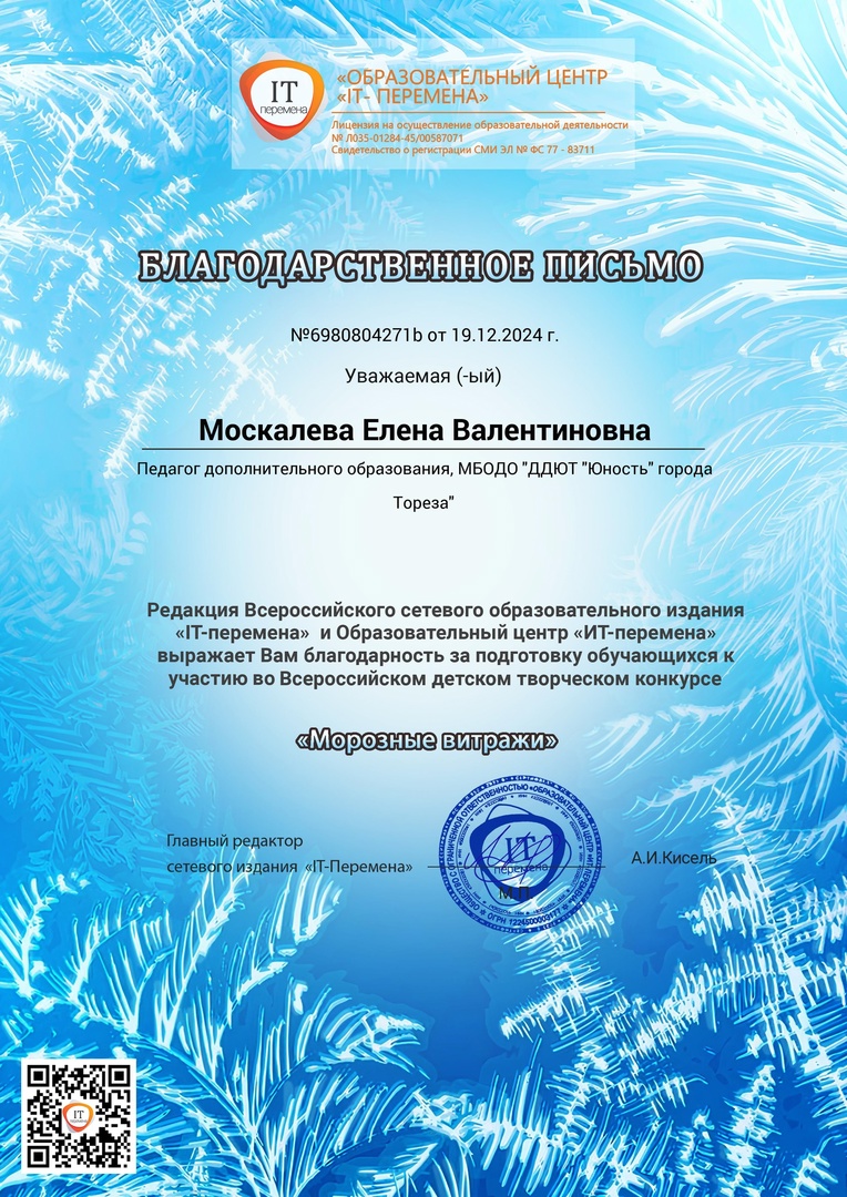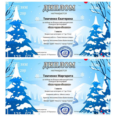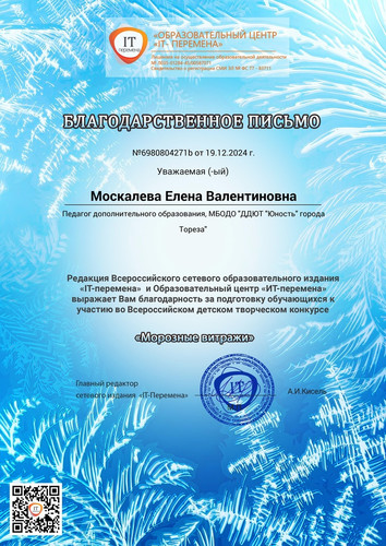 С 6 по 12 февраля 2025 обучающиеся образцового художественного коллектива «Школа красоты» (педагог Москалева Е.В.) приняли участие во Всероссийском детском конкурсе фотографий «Зима через объектив» (ИТ-Перемена, г. Курган) Конкурс фотографий "Зима через объектив" приглашает детей запечатлеть всю красоту и магию зимы! Каждый участник может показать, как он видит зиму — будь то снежные пейзажи, веселые зимние игры, заснеженные деревья или волшебные зимние рассветы. Через объектив фотоаппарата мы можем увидеть, как преображается мир зимой: как искрится снег, как тянутся к солнцу зимние ветви, как красиво и тихо падают снежинки. Пусть ваши снимки передавали атмосферу зимнего волшебства и радости! Цель конкурса: предоставление возможности демонстрации творческих способностей в конкурсной форме. Задачи конкурса: • конкурс направлен на стимулирование творческой деятельности; • выявление, сопровождение и поддержку талантливых участников конкурса в области декоративно-прикладного творчества. Итоги конкурса – 2 первых места! 1 места – Тимченко Маргарита и Тимченко Екатерина. Педагог награждена благодарственным письмом. Молодцы!