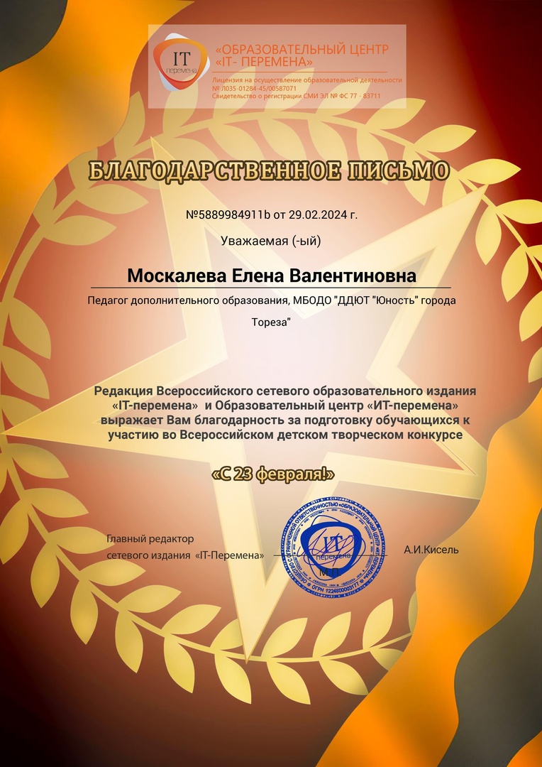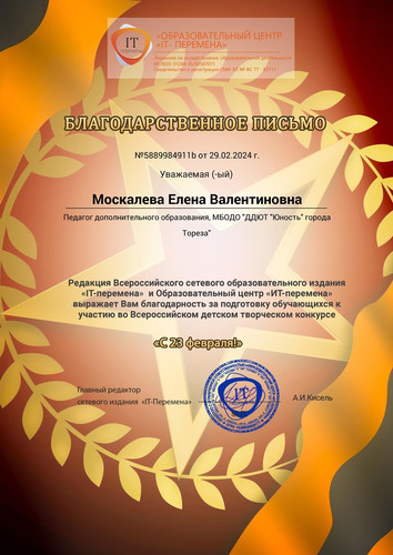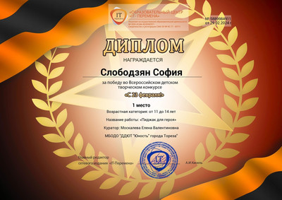 С 22 по 28 февраля 2024 обучающаяся образцового художественного коллектива «Школа красоты» (педагог Москалева Е.В.) Слободзян София приняла участие во Всероссийском детском конкурсе поздравительных открыток «С 23 февраля» (Образовательный центр «ИТ-Перемена, г. Курган). На конкурс предлагалось сделать поздравительную открытку своими руками, которой после конкурса можно было поздравить папу, дедушку или брата! Цель конкурса: предоставление возможности демонстрации творческих способностей в конкурсной форме. Задачи конкурса: • конкурс направлен на стимулирование творческой деятельности; • выявление, сопровождение и поддержку талантливых участников конкурса в области декоративно-прикладного творчества. Итоги конкурса – 1 место! Педагог награждена благодарственным письмом. Поздравляем Софию и желаем успехов!