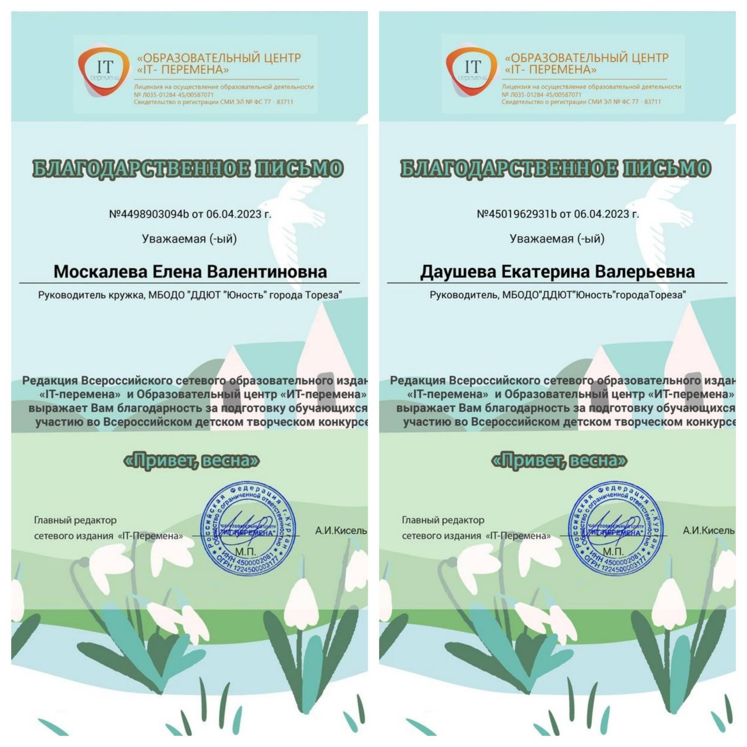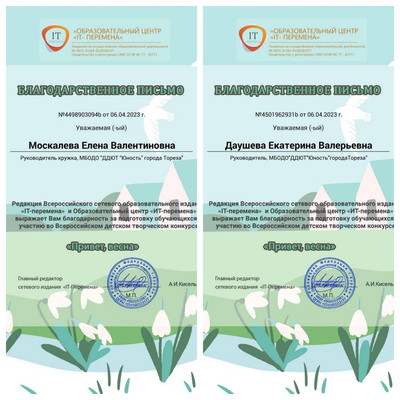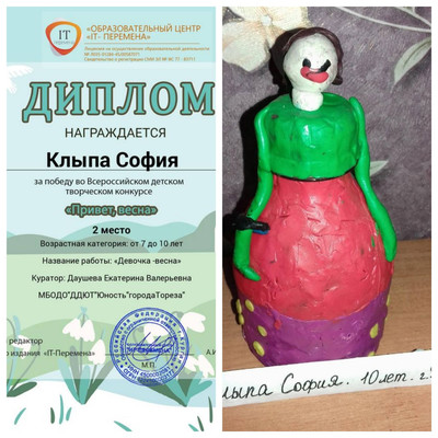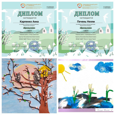 С 30 марта по 5 апреля 2023 года обучающиеся МБОДО «ДДЮТ «Юность» приняли участие во Всероссийском детском конкурсе работ из пластилина «Привет, весна» (г. Курган, образовательный центр «ИТ-перемена»). Цель конкурса: предоставление возможности демонстрации творческих способностей в конкурсной форме. Задачи конкурса: • конкурс направлен на стимулирование творческой деятельности; • выявление, сопровождение и поддержку талантливых участников конкурса в области декоративно-прикладного творчества. Конкурс лепки из пластилина проводится для развития мелкой моторики детей, расширения кругозора и получения новых знаний о форме и свойствах предметов. На конкурс было предложено слепить символ весны на взгляд ребенка: снегири и грачи, подснежники и даже лужи, первые листочки и кораблики в ручейках — показать, какой весна пришла к вам. Итоги конкурса – 2 первых и 1 второе место. Образцовый художественный коллектив «Школа красоты» (педагог Москалева Е.В.): 1-е места – Печень Нелли и Карпенко Анна. Народный художественный коллектив «Живопись и графика» (педагог Даушева Е.В.): 2-е место – Клыпа София. Педагоги награждены благодарственными письмами. Поздравляем и желаем творческого вдохновения! | |