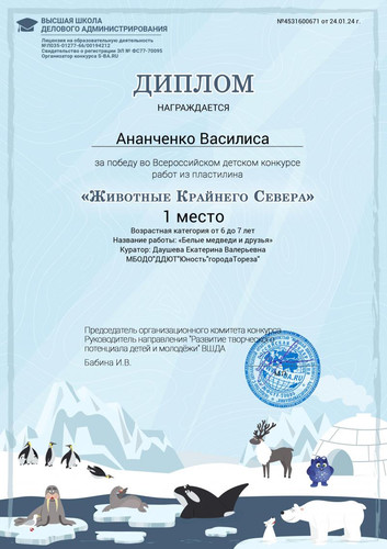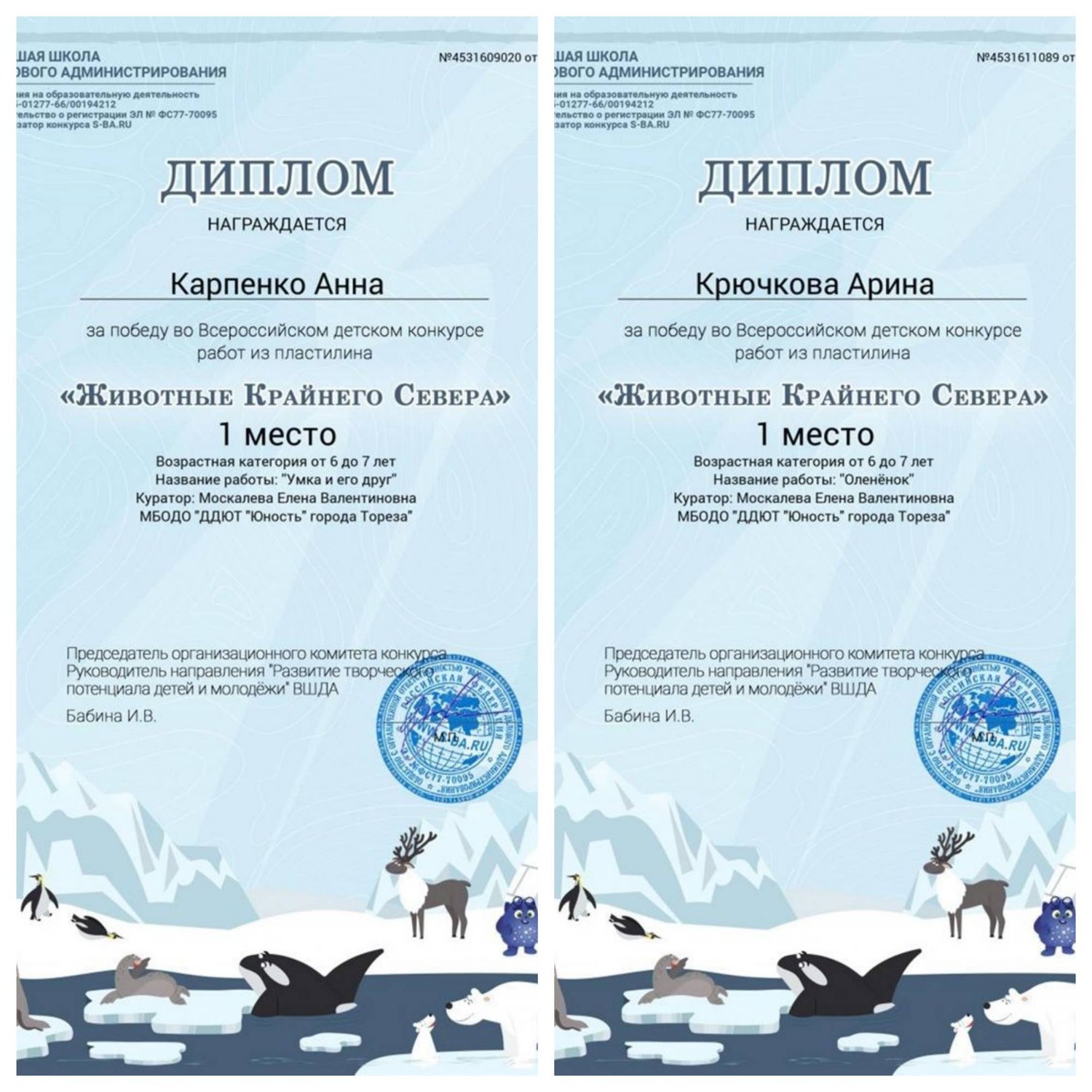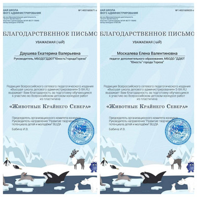 С 18 по 23 января 2024 обучающиеся ТО Дворца творчества приняли участие во Всероссийском детском конкурсе работ из пластилина «Животные Крайнего Севера» (ВШДА, г. Екатеринбург). Крайний Север – удивительный заснеженный мир с суровой погодой и вечными льдами. И среди этих вечных льдов можно повстречать немало животных, которые смогли привыкнуть к таким нелёгким условиям. Основные цели и задачи Конкурса: • всестороннее содействие развитию детского изобразительного и декоративно-прикладного творчества; • предоставление участникам возможности в состязательной форме развить и продемонстрировать свои творческие способности; • вовлечение детей в изучение природы и животного мира Крайнего Севера. Итоги конкурса – 3 первых места! Образцовый художественный коллектив «Школа красоты» (педагог Москалева Е.В.) – 2 первых места: 1-е место – Карпенко Анна, Крючкова Арина. Народный художественный коллектив «Живопись и графика» (педагог Даушева Е.В.) – 1 первое место: 1-е место – Ананченко Василиса. Педагоги награждены благодарственными письмами. Поздравляем участников и педагогов! | |