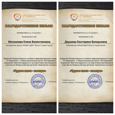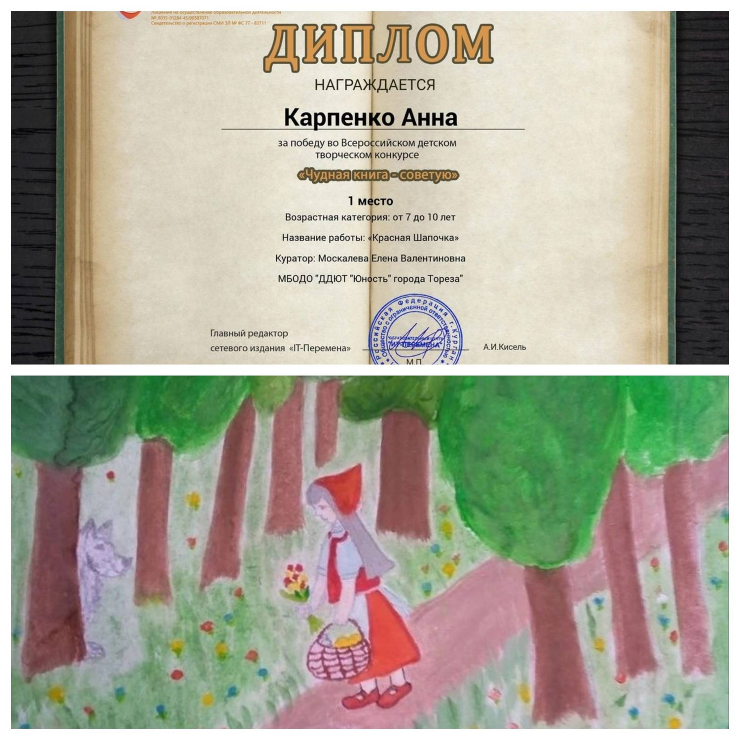 С 20 по 26 апреля обучающиеся ТО МБОДО «ДДЮТ «Юность» приняли участие во Всероссийском детском конкурсе рисунков «Чудная книга - советую». Организатор конкурса: «Образовательный центр «IT-Перемена», г. Курган. Цель конкурса: предоставление возможности демонстрации творческих способностей в конкурсной форме. Задачи конкурса: • конкурс направлен на стимулирование творческой деятельности; • выявление, сопровождение и поддержку талантливых участников конкурса в области декоративно-прикладного творчества. Конкурс иллюстраций к любимым сказкам, повестям, стихам и рассказам: надо было изобразить своих любимых героев так, чтобы любой зритель догадался, о каком произведении идет речь. На конкурс принимались иллюстрации, выполненные в различных техниках, которые бы полно отражали сюжет любимой книги. Итоги конкурса – 1 первое и 1 второе место. Образцовый художественный коллектив «Школа красоты» (педагог Москалева Е.В.): 1-е место – Карпенко Анна. Народный художественный коллектив «Живопись и графика» (педагог Даушева Е.В.): 2-е место – Гатаулина София. Педагоги награждены благодарственными письмами. Молодцы! Так держать! | |