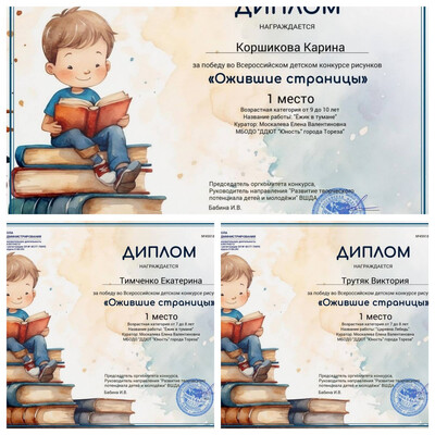 С 10 по 16 сентября 2025 года обучающиеся образцового художественного коллектива «Школа красоты» (педагог Москалева Е.В.) приняли участие во Всероссийском детском конкурсе рисунков «Ожившие страницы» (ВШДА, г. Екатеринбург). Это замечательная возможность проявить свою фантазию и творческое мастерство, вдохновившись любимыми книгами и героями. Создавайте яркие и оригинальные иллюстрации к страницам вашего читательского дневника, делитесь своими впечатлениями и открывайте новые грани мира литературы. Пусть ваши рисунки оживут и расскажут о самых волшебных историях, которые вы читаете! Итоги конкурса – 3 первых места! 1 –е место – Трутяк Виктория, Тимченко Екатерина и Коршикова Карина. Педагог награждена благодарственным письмом. Поздравляем!
