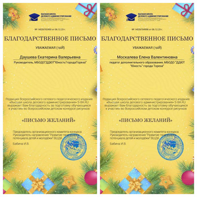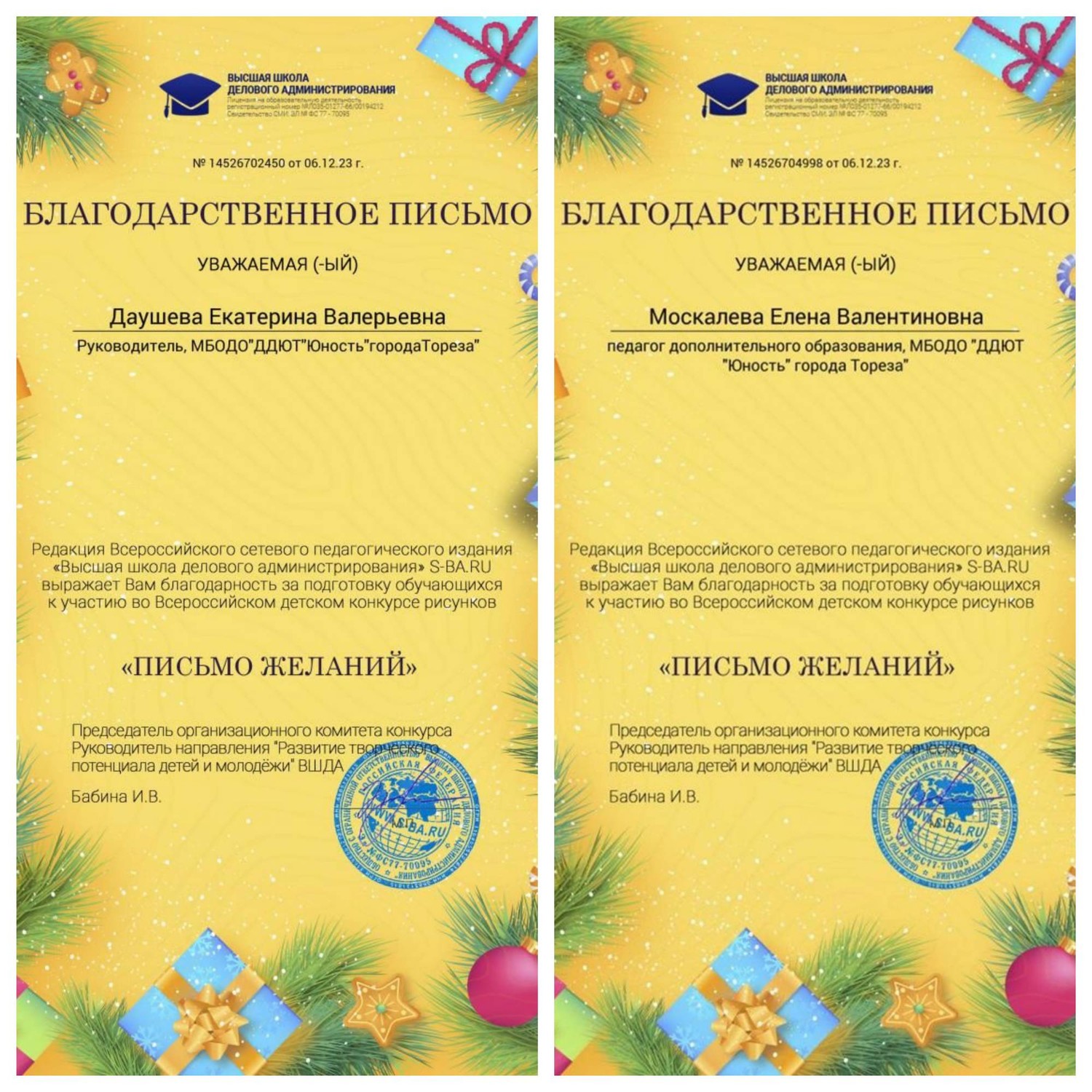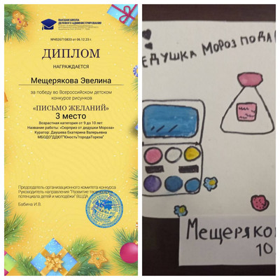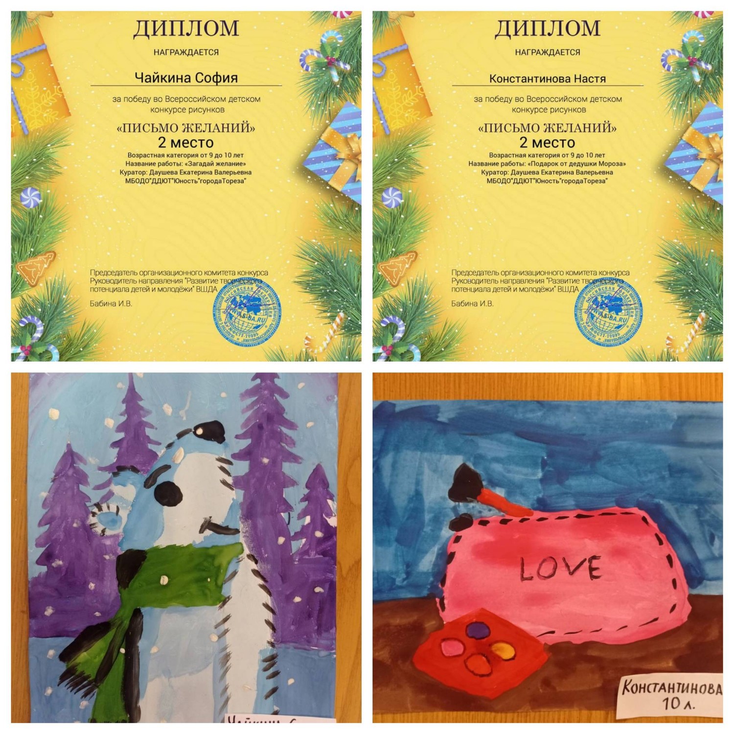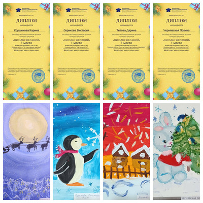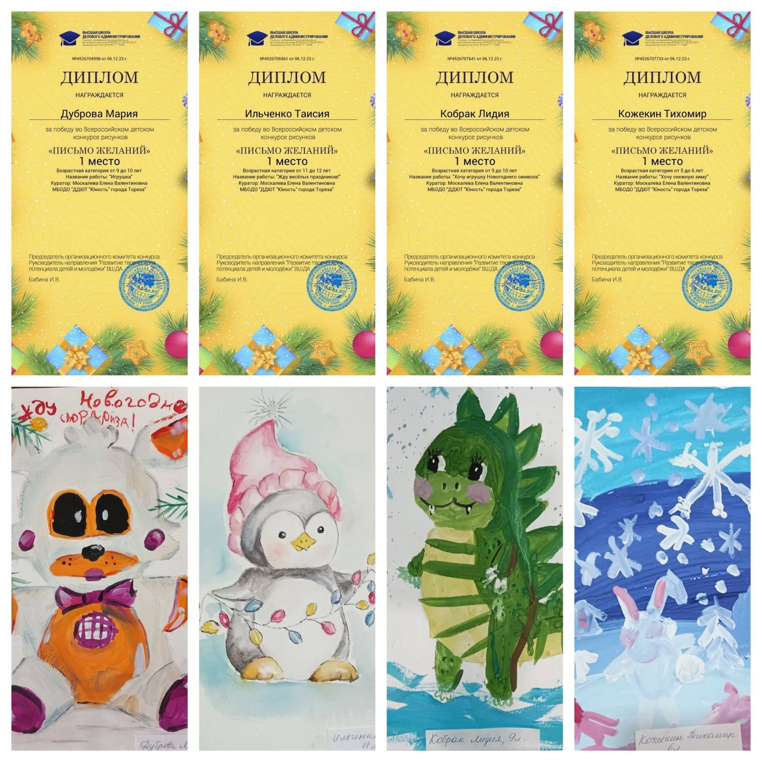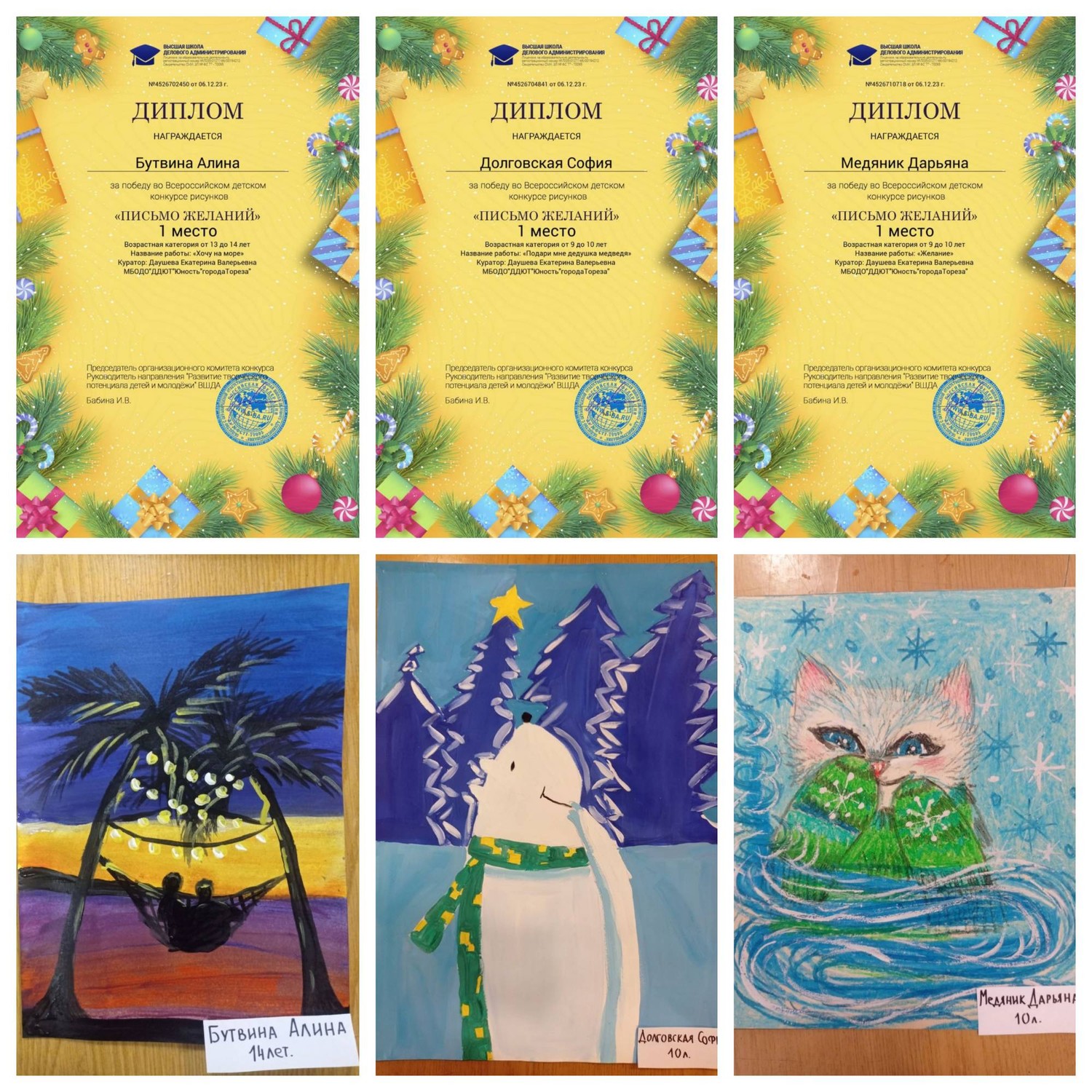 С 30 ноября 2023 года по 5 декабря 2023 года обучающиеся народного художественного коллектива «Живопись и графика» (педагог Даушева Е.В.) и образцового художественного коллектива «Школа красоты» (педагог Москалева Е.В.) приняли участие во Всероссийском детском конкурсе рисунков «Письмо желаний» (г. Екатеринбург, ВШДА). Дед Мороз, в красивой шубе, Приходи! Тебя мы любим! Приноси подарки детям. Мы тебя у елки встретим. Чтобы стало интересней, Пропоем с тобой все песни: Про снежинку, и про елку, Про зайчишку, и про волка. У вас уже появилось новогоднее настроение? Постепенно дома пополняются наряженными ёлками, сверкающими гирляндами и пушистой мишурой. Новый год подкрадывается к нам всё ближе и ближе. Уже выбрали, что хотите получить в качестве подарка от деда Мороза? Ещё нет? Тогда самое время подумать об этом! Обучающиеся нарисовали то, что хотят получить от Дедушки Мороза. Итоги конкурса – 11 первых, 2 вторых и 1 третье место! Образцовый художественный коллектив «Школа красоты» - 8 первых мест – Дуброва Мария, Чернявская Полина, Титова Дарина, Серикова Виктория, Кобрак Лидия, Ильченко Таисия, Кожекин Тихомир и Коршикова Карина. Народный художественный коллектив «Живопись и графика» - 3 первых, 2 вторых и 1 третье место: 1-е места – Бутвина Алина, Долговская София, Медяник Дарьяна; 2-е места – Константинова Настя, Чайкина София; 3-е место – Мещерякова Эвелина. Педагоги награждены благодарственными письмами. Поздравляем наших юных художников!