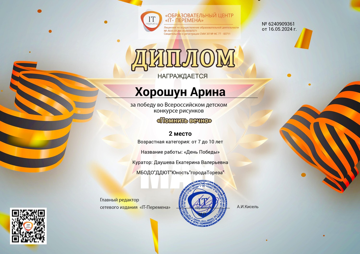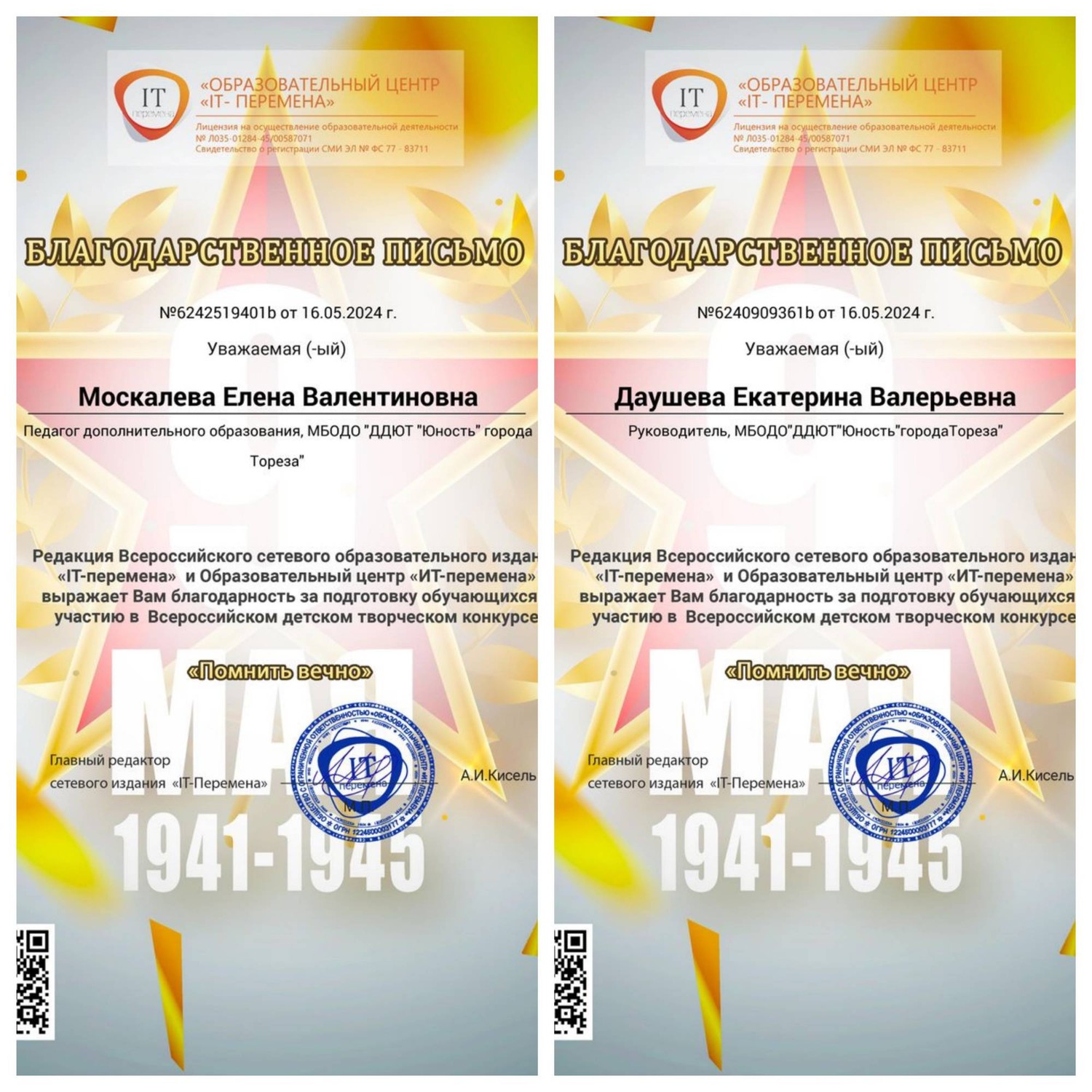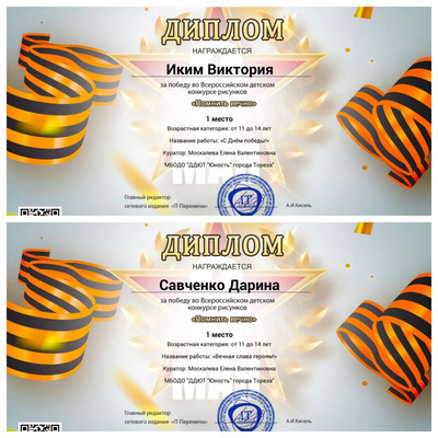 С 9 по 15 мая обучающиеся ТО «Школа красоты» и «Живопись и графика» приняли участие во Всероссийском детском конкурсе рисунков «Помнить вечно» (ООО «Образовательный центр «ИТ-перемена», г. Курган). Цель конкурса: предоставление возможности демонстрации творческих способностей в конкурсной форме. Задачи конкурса: • конкурс направлен на стимулирование творческой деятельности; • выявление, сопровождение и поддержку талантливых участников конкурса в области декоративно-прикладного творчества. Новый детский конкурс рисунков был объявлен в честь дня Победы. 9 мая, чтобы выразить своё уважение и благодарность к героям Великой Отечественной войны через творческие работы. Итоги конкурса – 2 первых и 1 второе место. Народный художественный коллектив «Живопись и графика» (педагог Даушева Е.В.): 2-е место – Хорошун Арина. Образцовый художественный коллектив «Школа красоты» (педагог Москалева Е.В.): 1-е место – Иким Виктория и Савченко Дарина. Педагоги награждены благодарственными письмами. Так держать! Молодцы! | |