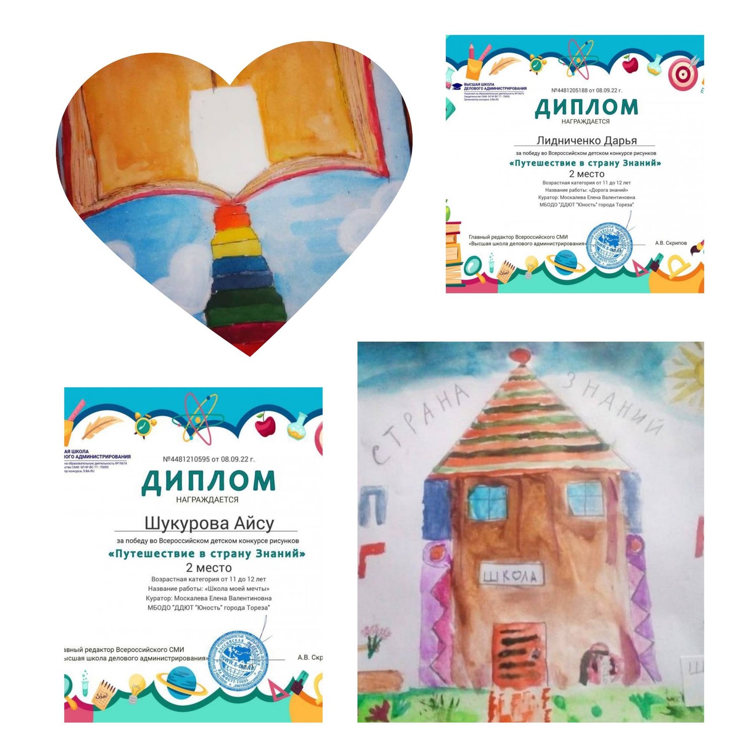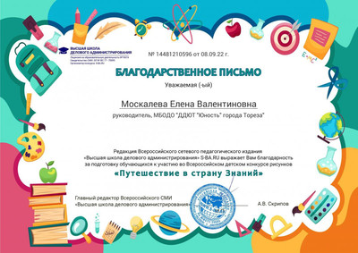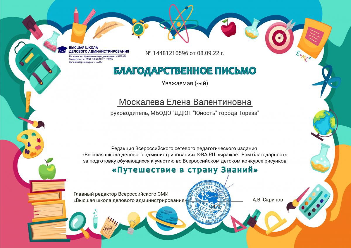 1 сентября — праздник Первого звонка. Это самый долгожданный день для тех, кто впервые переступает школьный порог. День знаний – это не только любимый праздник школьников, но также этот праздник с удовольствием отмечают и дошколята в детских садах. Со 2 по 7 сентября 2022 обучающиеся образцового художественного коллектива «Школа красоты» (педагог Москалева Е.В.) приняли участие в дистанционном Всероссийском детском конкурсе рисунков «Путешествие в страну Знаний» от Высшей школы делового администрирования. Цель Конкурса — развитие творческого мышления, фантазии и воображения; расширение кругозора детей. Участники Конкурса — воспитанники дошкольных образовательных учреждений, учащиеся общеобразовательных школ и учреждений дополнительного образования. Итоги конкурса: 1-е места– Савченко Дарина, Чернявская Полина, Шеина Анастасия и Шукурова Нурай; 2-е места – Лидниченко Дарья и Шукурова Айсу. Руководитель награждена благодарственным письмом за подготовку участников конкурса. Поздравляем и желаем в новом учебном году вдохновения и побед! | |