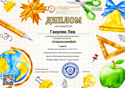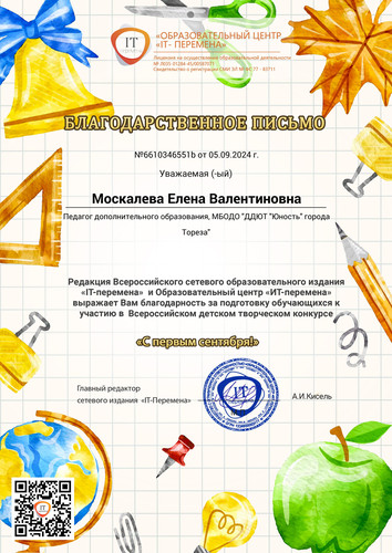 С 29 августа по 4 сентября обучающийся образцового художественного коллектива «Живопись и графика» (педагог Москалева Е.В.) Гануляк Лев принял участие во Всероссийском детском конкурсе рисунков «С 1 сентября!» Организатор конкурса: «Образовательный центр «IT-Перемена» (г. Курган). Цель конкурса: предоставление возможности демонстрации творческих способностей в конкурсной форме. Детский творческий конкурс рисунков «С первым сентября!», посвящен удивительному и волнующему моменту в жизни каждого школьника – Дню знаний! Этот день символизирует начало нового учебного года, новых достижений и встреч с любимыми учителями и друзьями. Надо было нарисовать, как дети видят этот день — будь то школа, учитель, друзья или веселая линейка и поделиться своими впечатлениями и мечтами о новом учебном году! Итоги конкурса – 1 место! Педагог награждена благодарственным письмом. Поздравляем! | |