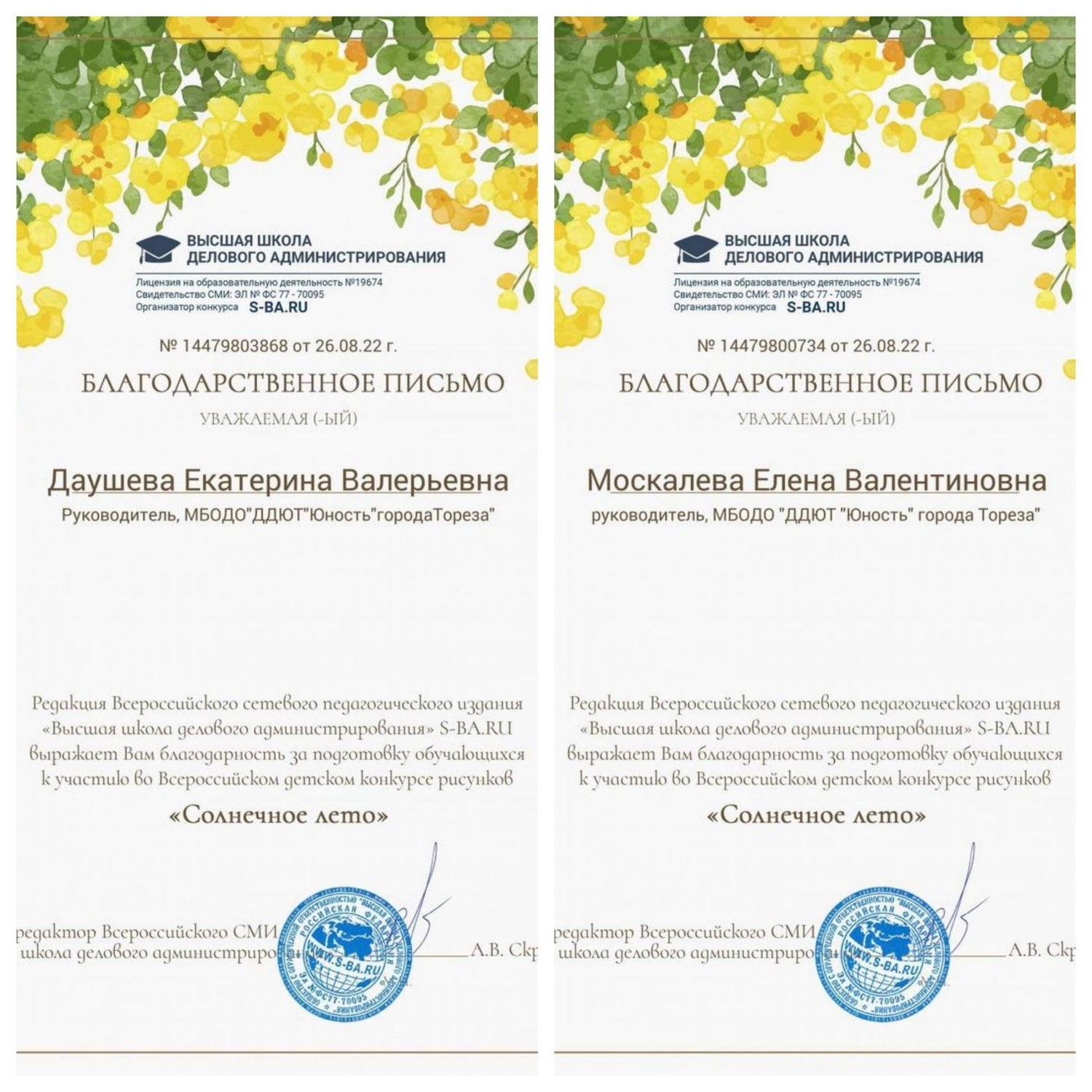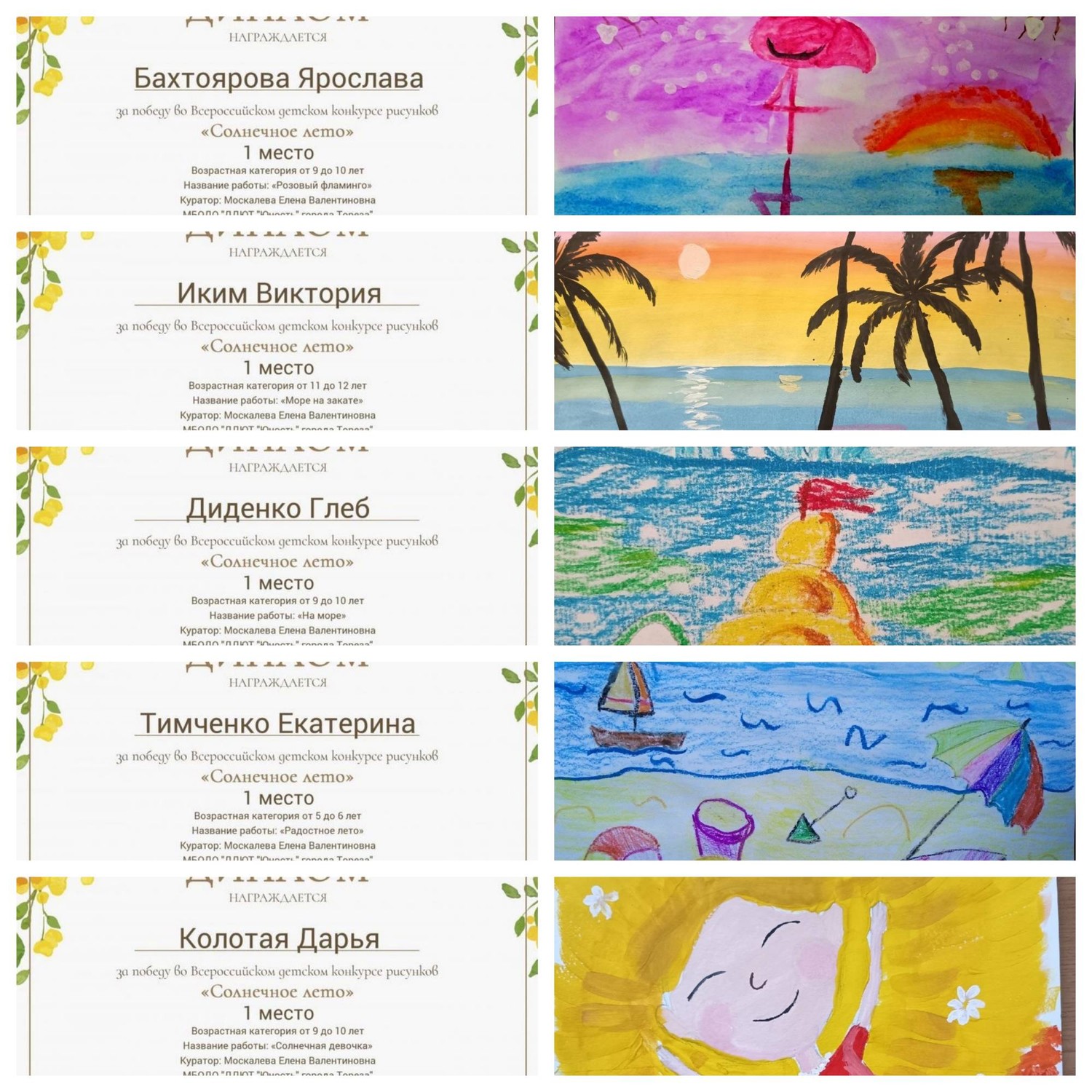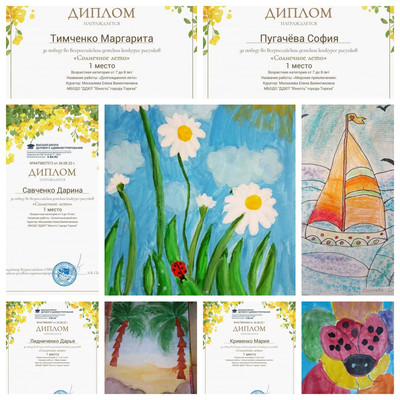 Лето - это каникулы! Каникулы – это отдых, путешествия, приключения и открытия! Лето - это солнце, жара, встреча с бабушкой и дедушкой: жизнь на даче, исследование леса и его обитателей, купание в море, объедание мороженым, прогулки в кафе и кино. Лето - это веселье, радость, движение, новые ощущения и впечатления! С 19 по 24 августа обучающиеся МБОДО «ДДЮТ «Юность» приняли участие во Всероссийском детском конкурсе рисунков «Солнечное лето» от Высшей школы делового администрирования. Цель Конкурса — развитие творческого мышления, фантазии и воображения; расширение кругозора детей. По итогам конкурса обучающиеся завоевали 14 первых мест! Образцовый художественный коллектив «Школа красоты (педагог Москалева Е.В.): Победители – Тимченко Маргарита, Тимченко Екатерина, Диденко Глеб, Колотая Дарья, Савченко Дарина, Пугачёва София, Лидниченко Дарья, Иким Виктория, Кривенко Мария и Бахтоярова Ярослава; Народный художественный коллектив «Живопись и графика» (педагог Дайшева Е.В.): Победители – Афтений Полина, Букаева Владислава, Киселёва Кристина и Клименко Полина. Руководители награждены благодарственными письмами. Поздравляем участников и педагогов с победой!