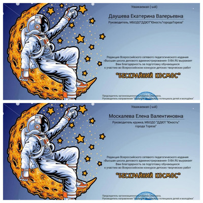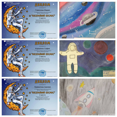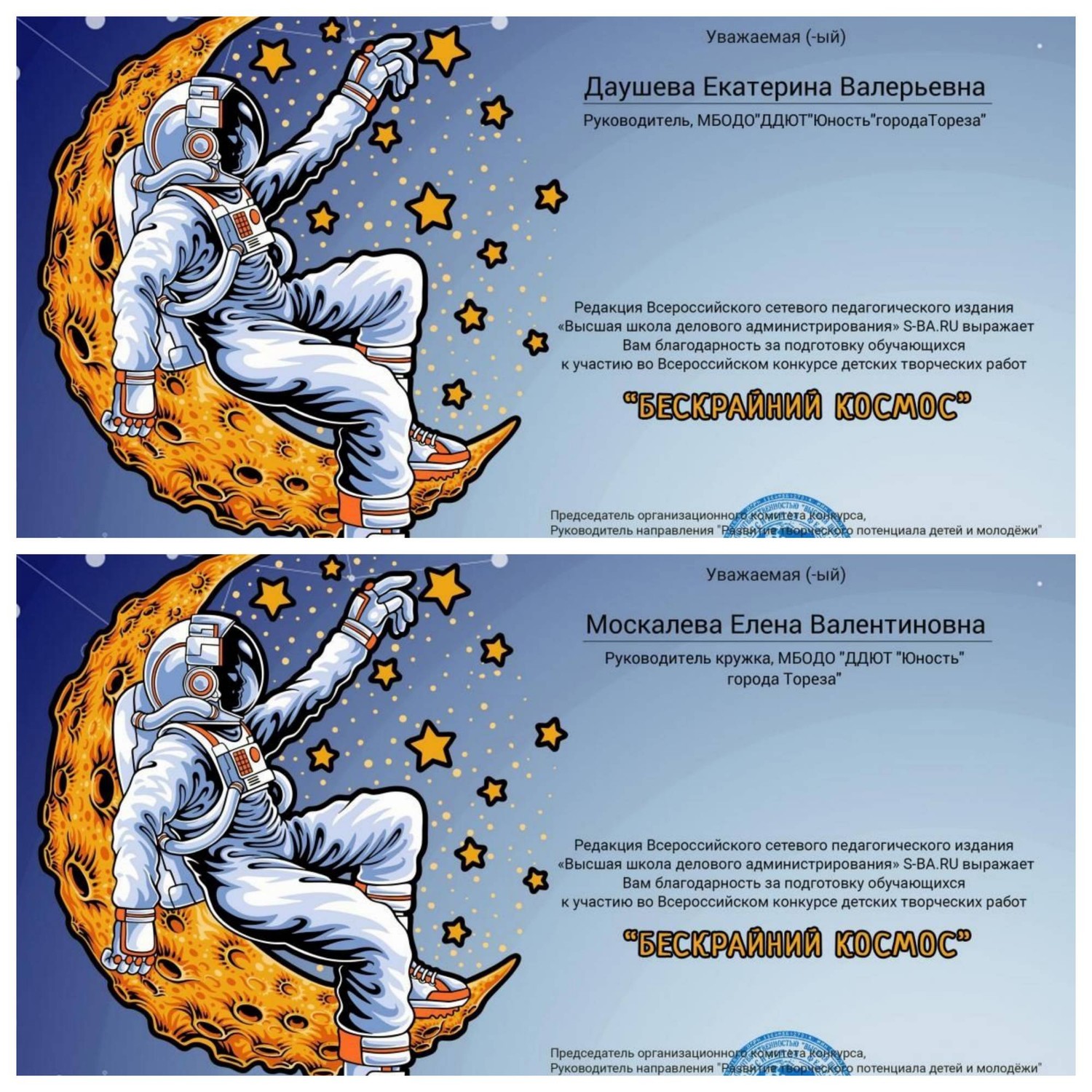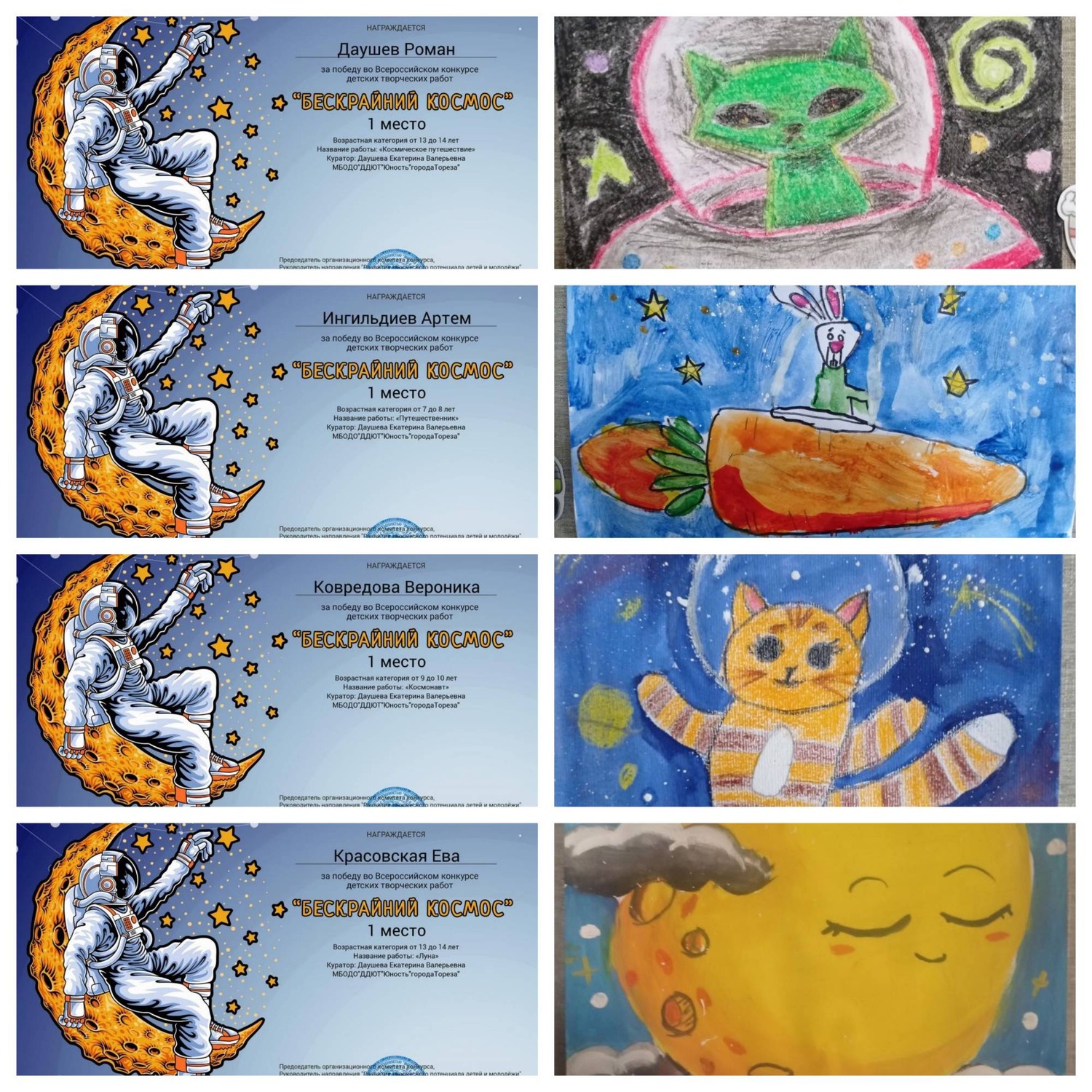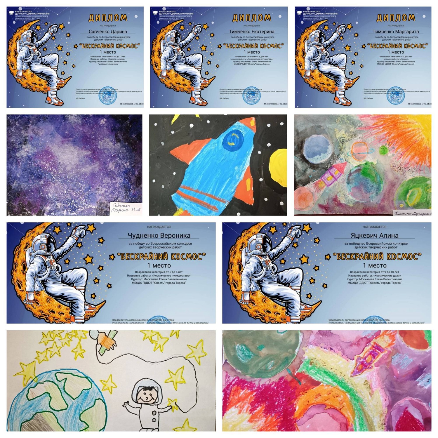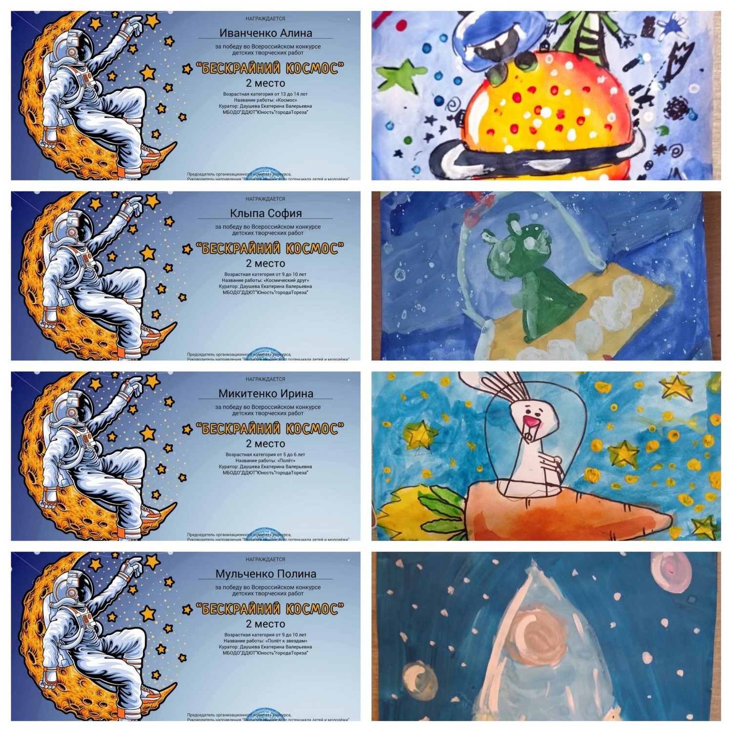 С 7 апреля по 12 апреля 2023 года обучающиеся творческих объединений МБОДО «ДДЮТ «Юность» приняли участие во Всероссийском детском конкурсе творческих работ «Бескрайний космос» (г. Екатеринбург) от Высшей школы делового администрирования. Цель Конкурса — содействовать расширению знаний участников конкурса в области астрономии. Итоги конкурса – 14 первых и 7 вторых мест! Народный художественный коллектив «Живопись и графика» (педагог Даушева Е.В.) – 4 первых и 4 вторых места: 1-е места – Красовская Ева, Ковредова Вероника, Ингильдеев Артём и Даушев Роман, 2-е места – Клыпа София, Микитенко Ирина, Мульченко Полина и Иванченко Алина. Образцовый художественный коллектив «Школа красоты» (педагог Москалева Е.В.) – 10 первых и 3 вторых места: 1-е места – Иким Виктория, Тимченко Екатерина, Тимченко Маргарита, Гануляк Ксения, Матвиенко Кристина, Печень Нелли, Савченко Дарина, Чудненко Вероника, Карпенко Анна и Яцкевич Алина, 2-е места – Гомонова Мария, Коршенко София и Привалова Амелия. Педагоги награждены благодарственными письмами. Поздравляем!