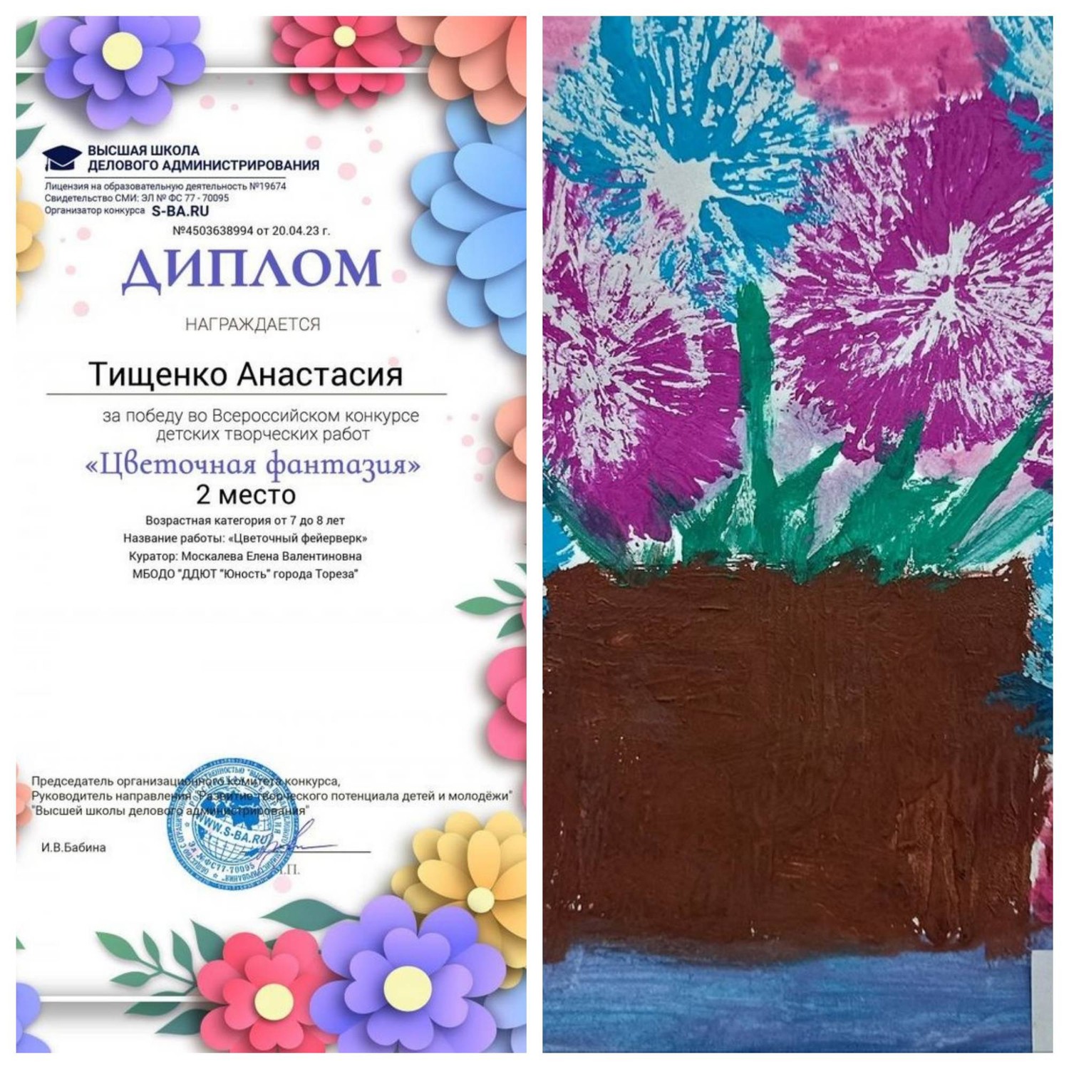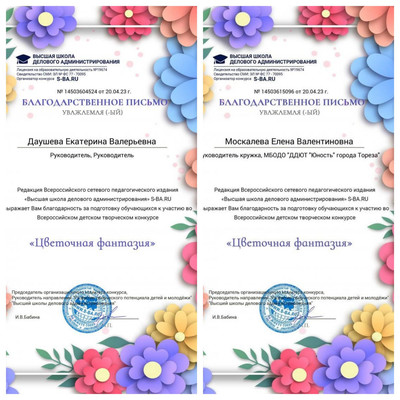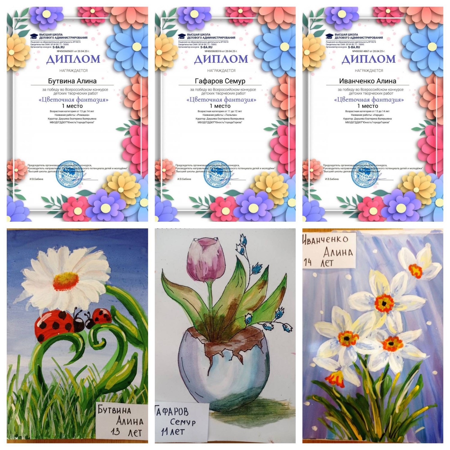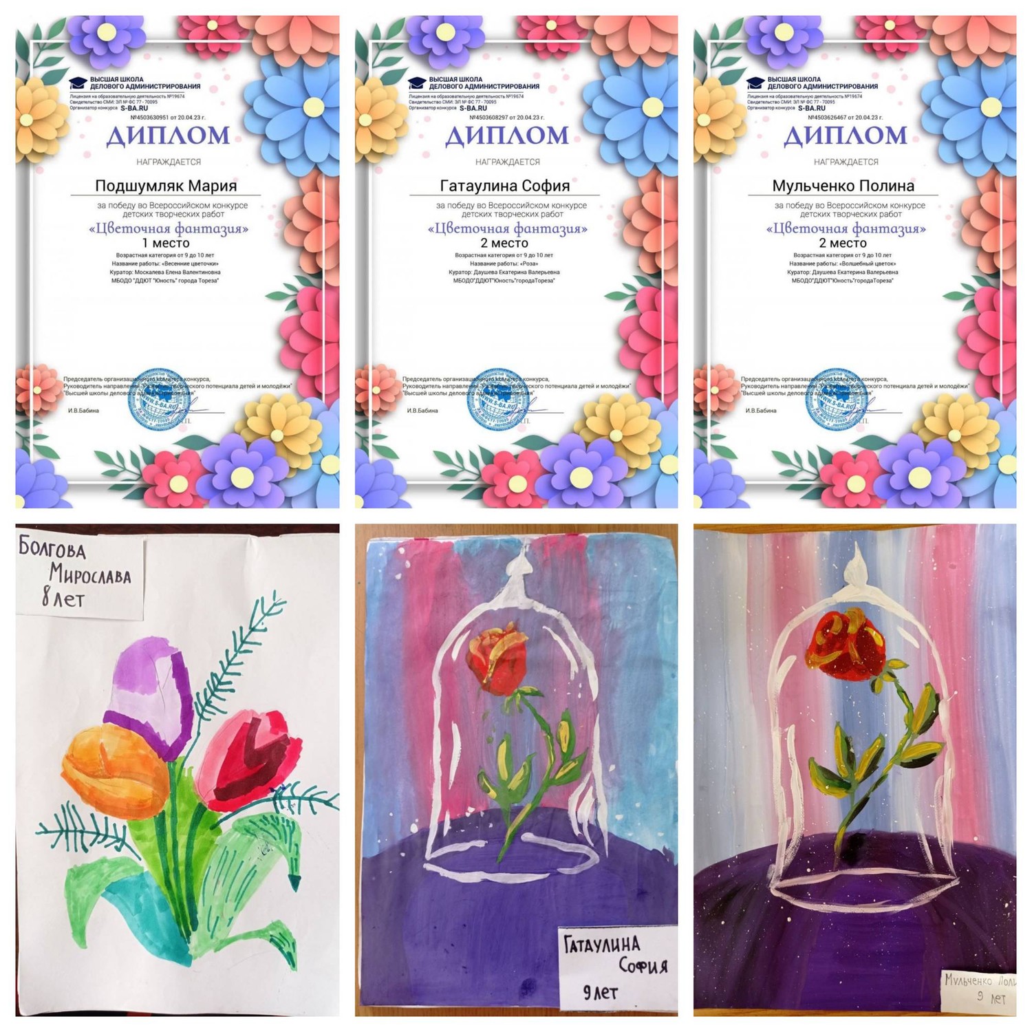 С 14 апреля по 19 апреля 2023 года обучающиеся МБОДО «ДДЮТ «Юность» приняли участие во Всероссийском детском конкурсе творческих работ «Цветочная фантазия» от Высшей школы делового администрирования (г. Екатеринбург). Ежегодно 19 апреля во многих странах мира отмечается уже ставший традиционным красивый весенний праздник — День подснежника. Подснежники – первые цветы, которые появляются после зимних холодов и символизируют весну, победу тепла над холодом. Всего насчитывается около 20 видов этих цветов, практически все они занесены в Красную книгу. Основные задачи конкурса: • активизировать познавательную деятельность детей; • познакомить участников с миром цветов и растений. Цель конкурса — реализация и поддержка творческого потенциала участников. Итоги конкурса – 15 первых и 4 вторых места! Образцовый художественный коллектив «Школа красоты» (педагог Москалева Е.В.) –12 первых и 1 второе место. 1-е места – Тимченко Маргарита, Тимченко Екатерина, Иким Виктория, Савченко Дарина, Пунтус Юлия, Акулова Полина, Карпенко Анна, Салаткина Леля, Подшумляк Мария, Корниец Полина, Коршикова Карина, Олейник Арина. 2-е место –Тищенко Анастасия. Народный художественный коллектив «Живопись и графика» (педагог Даушева Е.В.) – 3 первых и 3 вторых места. 1-е места – Гафаров Семур, Бутвина Алина, Иванченко Алина, 2-е места – Мульченко Полина, Болгова Мирослава, Гатаулина София. Педагоги награждены благодарственными письмами. Поздравляем! | |