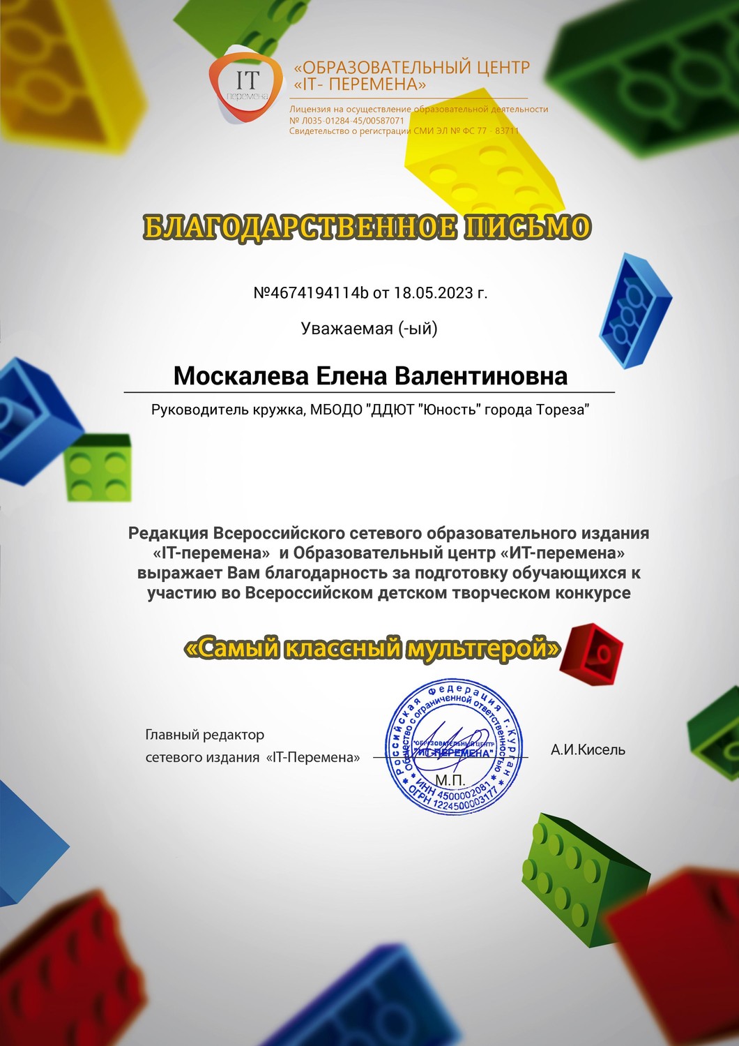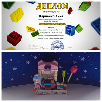 С 11 по 17 мая обучающаяся образцового художественного коллектива «Школа красоты» (педагог Москалева Е.В.) Карпенко Анна приняла участие во Всероссийском детском lego-конкурсе «Самый классный мультгерой» (г. Курган). Организатор конкурса: «Образовательный центр «IT-Перемена». Цель конкурса: предоставление возможности демонстрации творческих способностей в конкурсной форме. Задачи конкурса: • конкурс направлен на стимулирование творческой деятельности; • выявление, сопровождение и поддержку талантливых участников конкурса в области декоративно-прикладного творчества. Почему дети хотят быть супергероями или днями напевают песни из мультиков? Что их поражает и восхищает, или наоборот — пугает в мультгероях? Побеседуйте с участниками, расскажите, почему в сказках есть и хорошие и плохие персонажи и почему добро в конечном итоге всегда побеждает зло. А после своеобразного разбора попросите построить любимого мультипликационного героя из деталей конструкта Лего и рассказать — какие черты в нем нравятся. Итоги конкурса – первое место. Педагог награждена благодарственным письмом. Поздравляем! | |