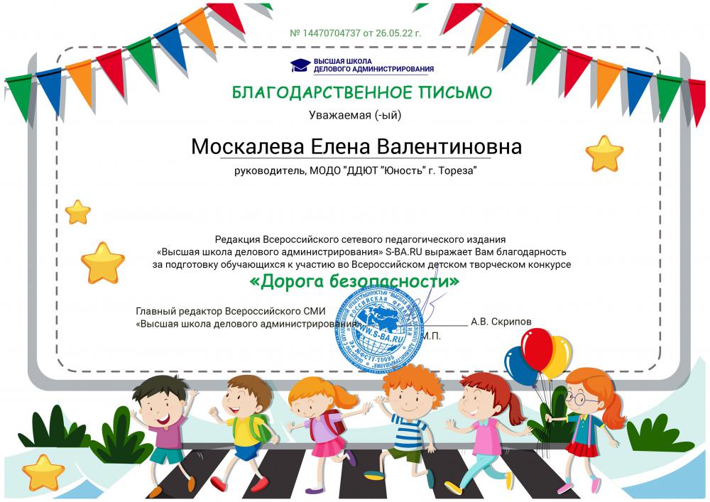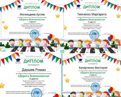 Обучающиеся творческих объединений МОДО «ДДЮТ «Юность» приняли участие в дистанционном Всероссийском детском творческом конкурсе «Дорога безопасности». Цель Конкурса — закрепление знании дорожных знаков и их назначения, изучение правил дорожного движения и культуры поведения на дороге и улице. Основные задачи Конкурса: • активизировать познавательную деятельность детей; • создания условий для развития творческого потенциала детей; • изучение, закрепление и соблюдение правил дорожного движения; Организатор конкурса - Высшая школа делового администрирования. Итоги конкурса: Народный художественный коллектив «Живопись и графика» (педагог Даушева Е.В.): 1 место – Ингильдеев Артём, 2-е места – Даушев Роман и Баларченко Виктория. Образцовый художественный коллектив «Школа красоты» (педагог Москалева Е.В.): 1-е место – Гануляк Лев, 2-е место – Тимченко Маргарита. Руководители награждены благодарственными письмами за подготовку участников конкурса. Сегодня безопасность наших детей на дороге - проблема первоочередная, особенно для жителей больших городов. Первое, с чем сталкивается ребенок в своем ежедневном походе за знаниями, - дорога, автотранспорт и не всегда осознающие опасность своего поведения для окружающих водители. Даже до школы, расположенной внутри жилого квартала, ребенку приходится добираться среди припаркованных на тротуарах автомобилей. Быть пешеходом – это очень ответственно. Дорожное движение – сложный процесс, но его безопасность зависит от поступков каждого человека, а значит, и от ВАС. Вы должны строго соблюдать правила дорожного движения. Особенно важно уметь вести себя на улице, переходить дорогу и знать правила дорожного движения.