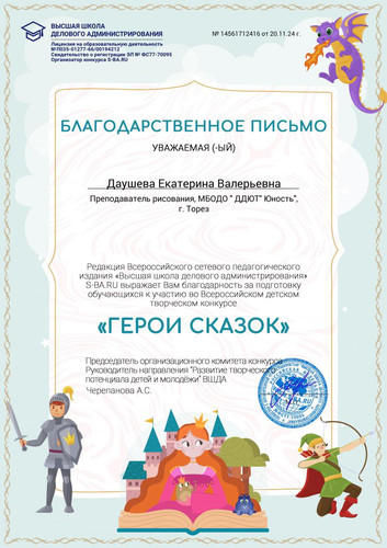 С 14 по 19 ноября 2024 обучающийся народного художественного коллектива «Живопись и графика» (педагог Даушева Е.В.) Карпачёв Иван принял участие во Всероссийском детском творческом конкурсе «Герои сказок» (ВШДА, г. Екатеринбург) и занял 2-е место! Наверняка у каждого есть любимый сказочный герой. Он либо спас от врагов целое королевство, либо владеет магией и тайными знаниями, либо наоборот ничем выдающимся не отличается, но зато своим добром и честью подаёт хороший пример. А кто ваш любимый сказочный герой? Педагог награждена благодарственным письмом. Поздравляем! | |