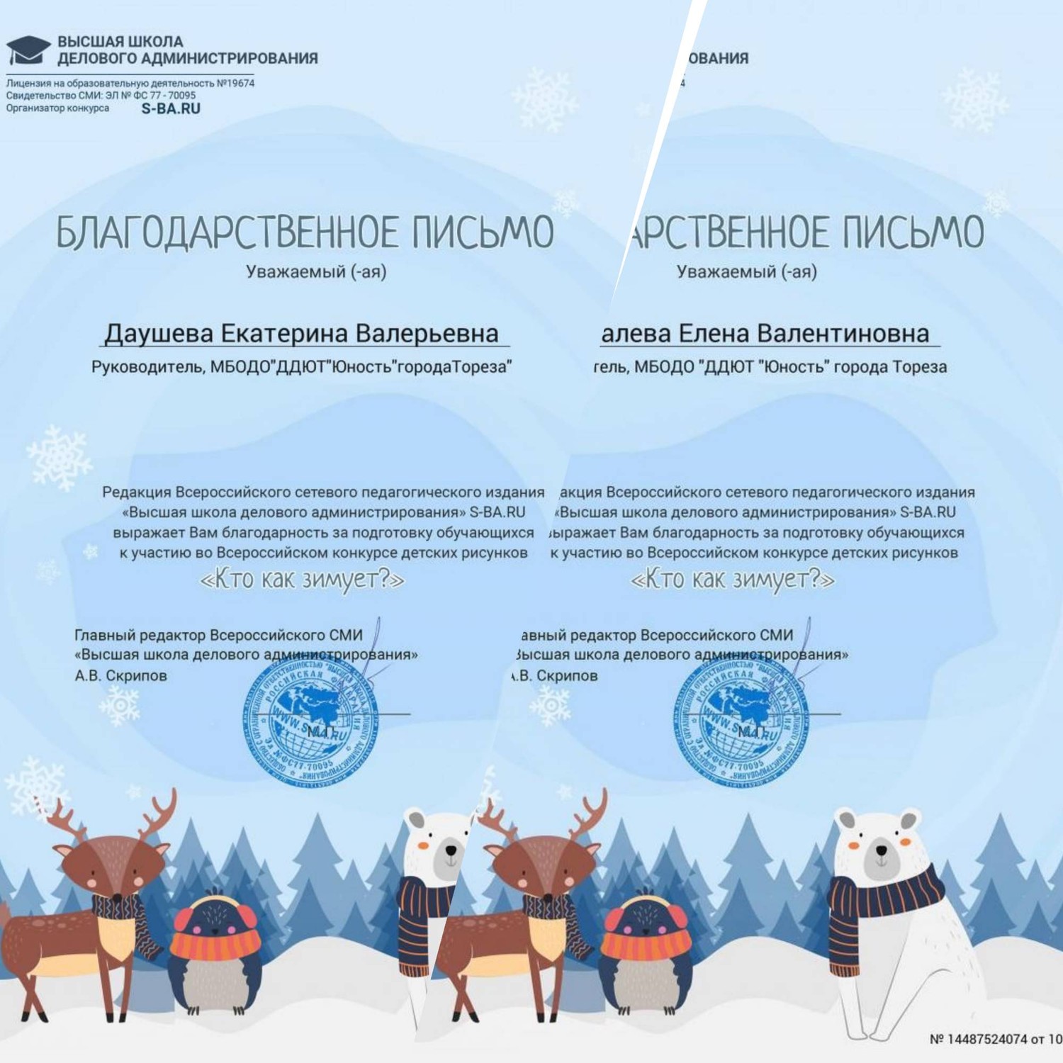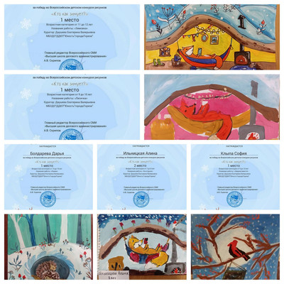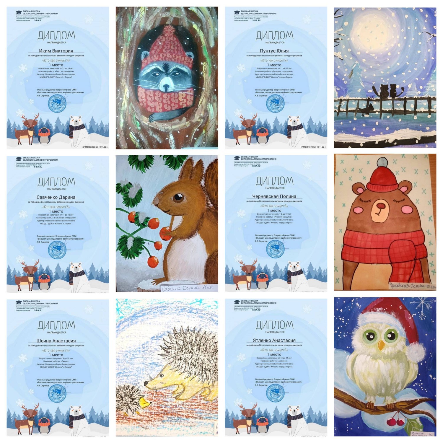 Зима – пора суровая и к ней нужно готовиться заранее. Животные также, как и люди, проводят подготовительные мероприятия к зиме. Некоторые крупные млекопитающие (медведи, барсуки, еноты) впадают в зимний сон. Другие одеваются потеплей в зимние шубы, и не страшны им тогда вьюги и морозы. Это – зайцы, белочки, песцы, лисы, волки и многие другие животные. С 4 по 9 ноября прошёл дистанционный Всероссийский детский творческий конкурс «Кто как зимует?», в котором приняли участие обучающиеся образцового художественного коллектива «Школа красоты» (педагог Москалева Е.В.) и народного художественного коллектива «Живопись и графика» (педагог Даушева Е.В.). Цель Конкурса — развитие творческого мышления, фантазии и воображения; расширение кругозора детей. Конкурс проходил на Интернет-платформе Высшей школы делового администрирования. Итоги конкурса – 10 первых мест и 1 второе! Народный художественный коллектив «Живопись и графика»: 1-е места – Баланюк Ангелина, Болдарева Дарья, Клыпа София, Беляева Валерия; 2-е место - Ильницкая Алина; Образцовый художественный коллектив «Школа красоты»: 1-е места – Чернявская Полина, Савченко Дарина, Шеина Анастасия, Пунтус Юлия, Иким Виктория, Ятленко Анастасия. Руководители награждены благодарственными письмами. Поздравляем! Молодцы!