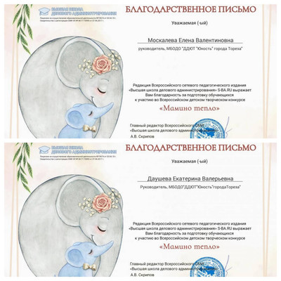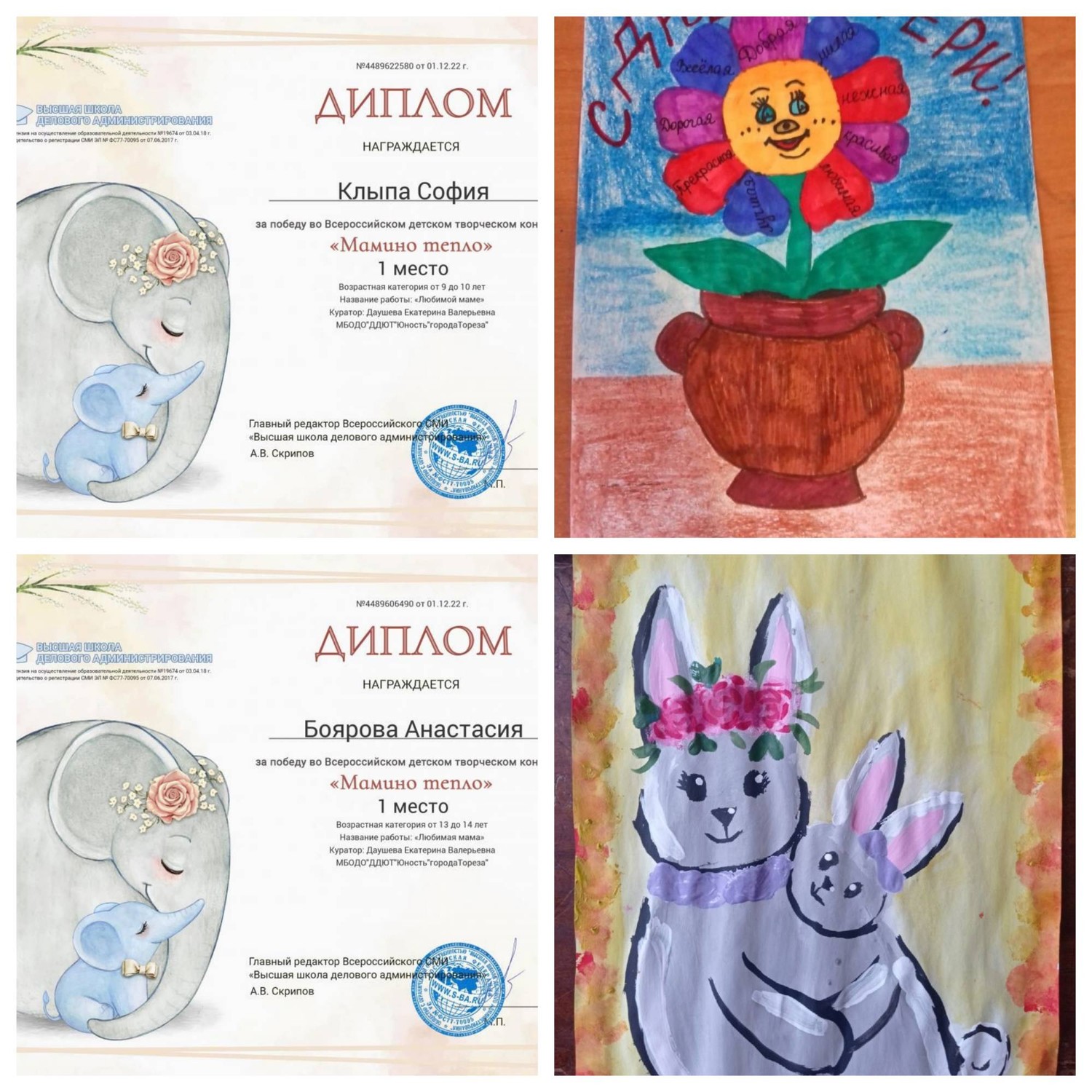 С 25 ноября по 30 ноября 2022 прошёл Всероссийский детский творческий конкурс «Мамино тепло» от Высшей школы делового администрирования, в котором приняли участие обучающиеся творческих коллективов Дворца творчества. День матери – международный праздник, в который чтят матерей. В этот день принято поздравлять матерей и беременных женщин. К этому празднику приурочивают концерты, проводят утренники в школах и детских садах, устраивают социальные акции и флешмобы. В России День матери отмечается в последнее воскресенье ноября. В 2022 году он выпадает на 27 ноября и справляется на официальном уровне 25-й раз. К одному из самых добрых и нежных праздников, Дню Матери, все детишки готовят для своих мам подарки, ну и, конечно же, рисунки. Что нарисовать на День Матери? В этот праздник, День Матери, принято признаваться своим мамочкам в любви и говорить самые добрые и теплые слова. Можно нарисовать большое любящее сердце. Все мамы обожают цветы! Нарисуйте для мамы рисунок с изображением ее любимых цветов. Вы можете нарисовать отдельные цветки на очень красочном фоне, цветки в вазе или огромный букет цветов. Или нарисуйте свою любимую и самую дорогую маму. Изобразите ее за ее любимым занятием. А еще маму можно нарисовать с роскошным букетом ее любимых цветов! Итоги конкурса – 10 первых, 2 вторых и 1 третье место! Образцовый художественный коллектив «школа красоты» (педагог Москалев Е.В.) – 8 первых и 1 второе место. 1-е место – Диденко Назар, Иким Виктория, Шеина Анастасия, Карпенко Анна, Куденко Анастасия, Привалова Амелия, Чернявская Полина, Ятленко Анастасия;