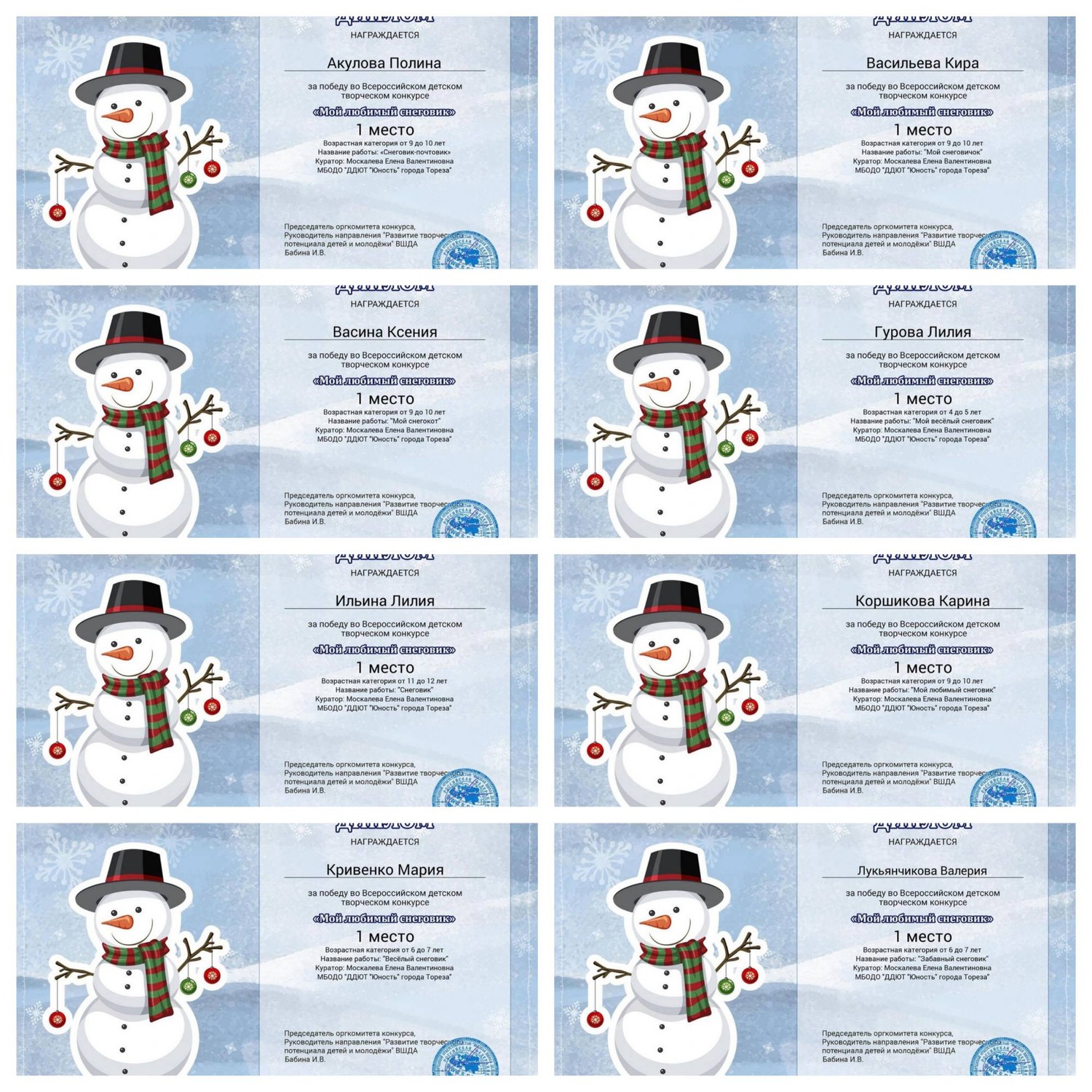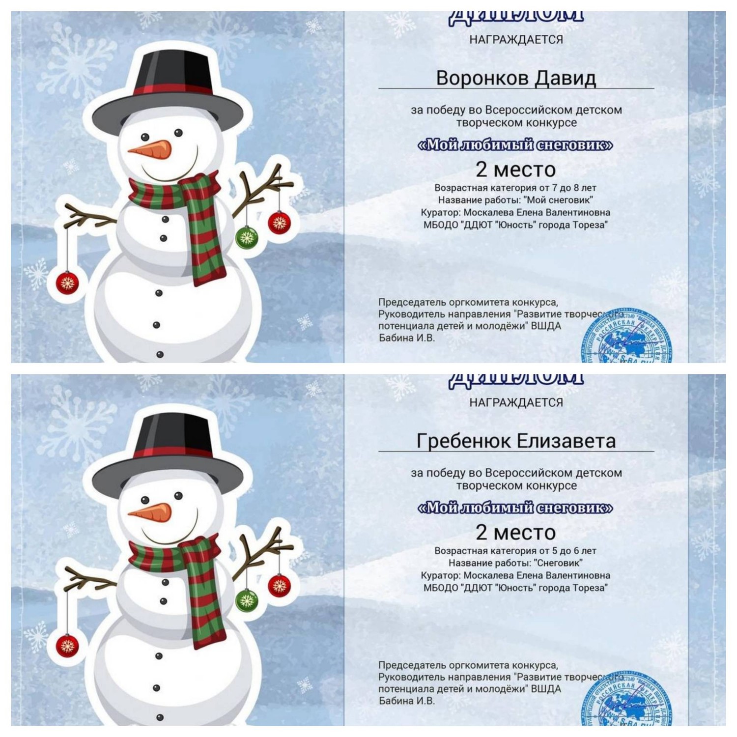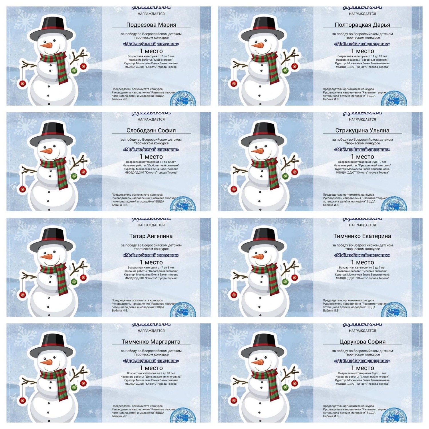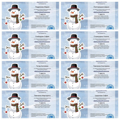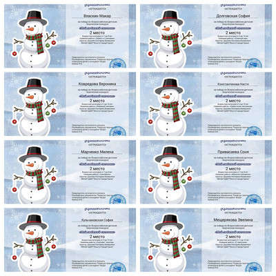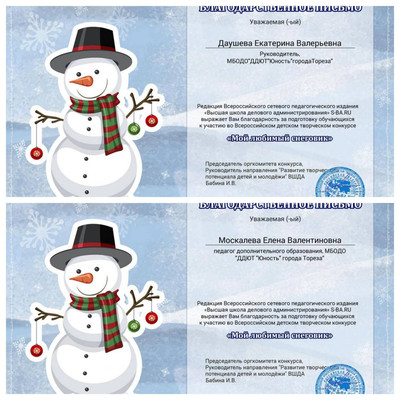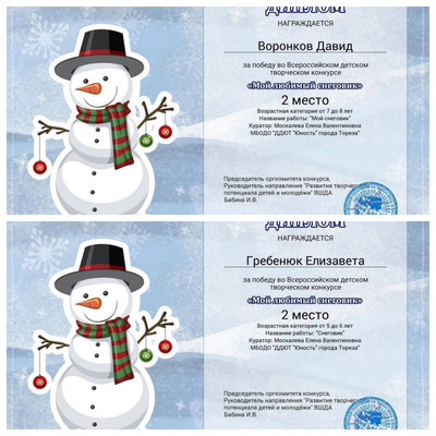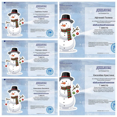 С 11.01.2024 по 16.01.2024 обучающиеся ТО МБОДО «ДДЮТ «Юность» приняли участие во Всероссийском детском творческом конкурсе «Мой любимый снеговик» (ВШДА, г. Екатеринбург). Оказывается, снеговикам посвящён целый праздник, представляете! И если бы снеговики могли разговаривать и внезапно ожили, то мы бы их всех поздравляли с их днём 18 января! Итоги конкурса – 29 первых, 10 вторых и 2 третьих места! Народный художественный коллектив «Живопись и графика» (педагог Даушева Е.В.) - 13 первых, 8 вторых, 2 третьих места: 1-е место – Ананченко Василиса, Афтений Полина, Высоцкая Арина, Гатаулина София, Киселёва Кристина, Коновалова Вероника, Медяник Дарьяна, Нилова Мария, Олейник Арина, Плахтюк Таисия, Самущик София, Серёгина Ульяна, Хорошун Арина. 2-е место – Власкин Макар, Долговская София, Ковредова Вероника, Константинова Настя, Кульчановская София, Марченко Милена, Мещерякова Эвелина, Припасаева Соня. 3-е место – Защипкина Таисия, Мануйко Илья. Образцовый художественный коллектив «Школа красоты» (педагог Москалева Е.В.) - 16 первых, 2 вторых места: 1-е место – Царукова София, Тимченко Маргарита, Тимченко Екатерина, Татар Ангелина, Стрикуцина Ульяна, Слободзян София, Полторацкая Дарья, Подрезова Мария, Лукьянчикова Валерия, Кривенко Мария, Коршикова Карина, Ильина Лилия, Гурова Лилия, Васина Ксения, Васильева Кира, Акулова Полина. 2-е место – Гребенюк Елизавета, Воронков Давид. Педагоги награждены благодарственными письмами за подготовку участников конкурса. Поздравляем и ждём новых достижений! | |