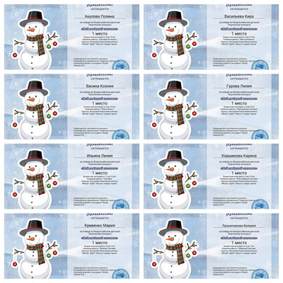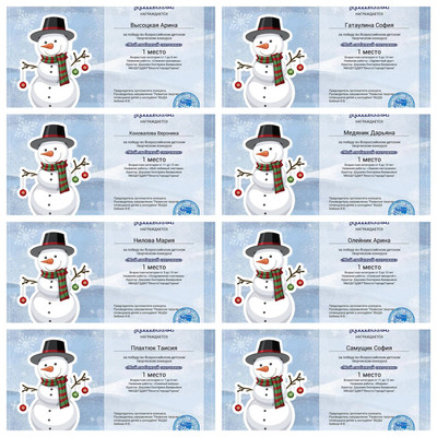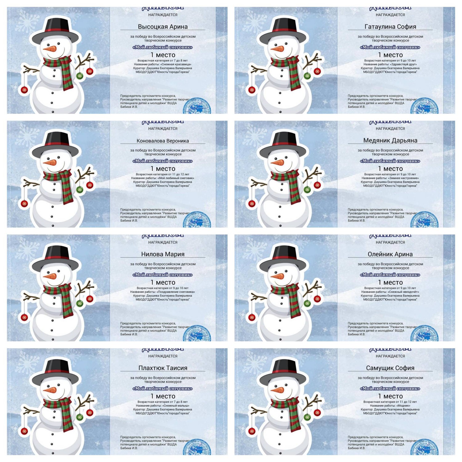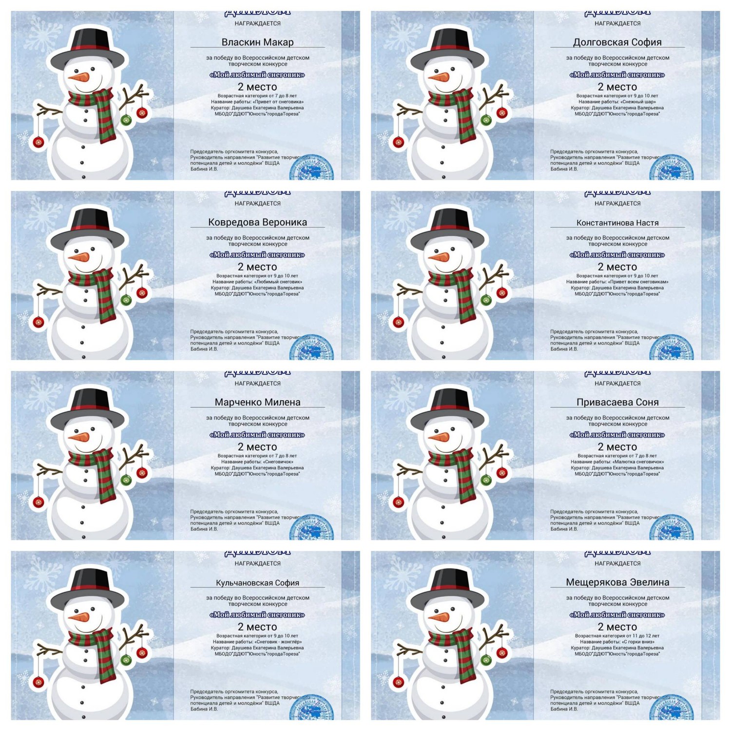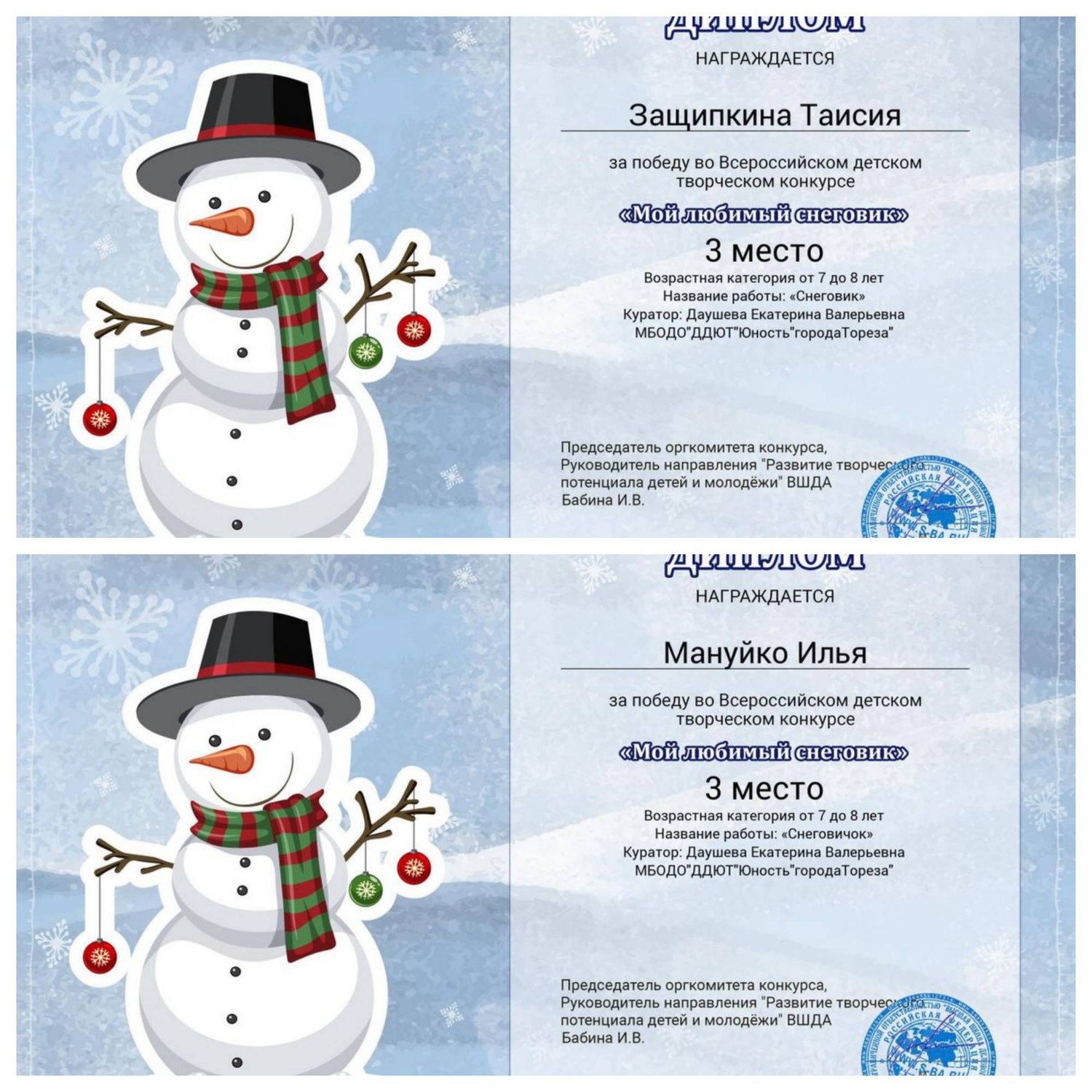 С 11.01.2024 по 16.01.2024 обучающиеся ТО МБОДО «ДДЮТ «Юность» приняли участие во Всероссийском детском творческом конкурсе «Мой любимый снеговик» (ВШДА, г. Екатеринбург). Оказывается, снеговикам посвящён целый праздник, представляете! И если бы снеговики могли разговаривать и внезапно ожили, то мы бы их всех поздравляли с их днём 18 января! Итоги конкурса – 29 первых, 10 вторых и 2 третьих места! Народный художественный коллектив «Живопись и графика» (педагог Даушева Е.В.) - 13 первых, 8 вторых, 2 третьих места: 1-е место – Ананченко Василиса, Афтений Полина, Высоцкая Арина, Гатаулина София, Киселёва Кристина, Коновалова Вероника, Медяник Дарьяна, Нилова Мария, Олейник Арина, Плахтюк Таисия, Самущик София, Серёгина Ульяна, Хорошун Арина. 2-е место – Власкин Макар, Долговская София, Ковредова Вероника, Константинова Настя, Кульчановская София, Марченко Милена, Мещерякова Эвелина, Припасаева Соня. 3-е место – Защипкина Таисия, Мануйко Илья. Образцовый художественный коллектив «Школа красоты» (педагог Москалева Е.В.) - 16 первых, 2 вторых места: 1-е место – Царукова София, Тимченко Маргарита, Тимченко Екатерина, Татар Ангелина, Стрикуцина Ульяна, Слободзян София, Полторацкая Дарья, Подрезова Мария, Лукьянчикова Валерия, Кривенко Мария, Коршикова Карина, Ильина Лилия, Гурова Лилия, Васина Ксения, Васильева Кира, Акулова Полина. 2-е место – Гребенюк Елизавета, Воронков Давид. Педагоги награждены благодарственными письмами за подготовку участников конкурса. Поздравляем и ждём новых достижений! | |