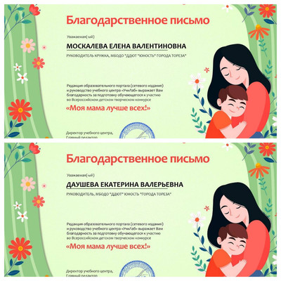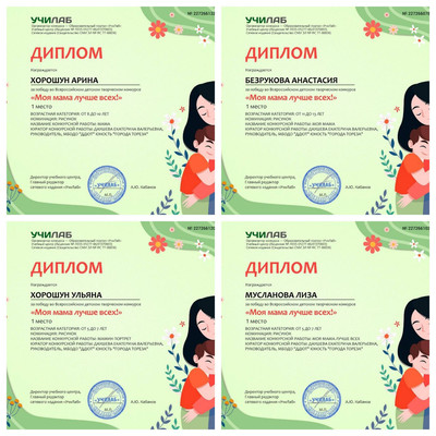 Обучающиеся образцового художественного коллектива «Школа красоты» (педагог Москалева Е.В.) и народного художественного коллектива "Живопись и графика" (педагог Дацшева Е.В.) приняли участие во Всероссийском детском творческом конкурсе «Моя мама лучше всех!» (портал УчиЛаб). Итоги конкурса – 16 первых мест! 1-е места – Чудненко Вероника, Мустафин Дмитрий, Перевозчикова Кира, Подрезова Мария, Полищук Эля, Сорокина Полина, Стрикуцина Ульяна, Татар Ангелина, Шевченко Александр, Шукурова Айсу, Шукурова Нурай, Гурова Лилия (ТО "Школа красоты"). 1-е места -Хорошун Ульяна, Хорошун Лиза, Безрукова Анастасия, Мусланова Лиза (ТО "Живопись и графика"). Руководители награждены благодарственными письмами. Поздравляем! | |