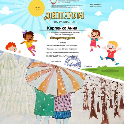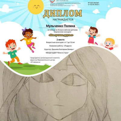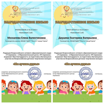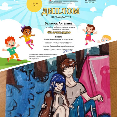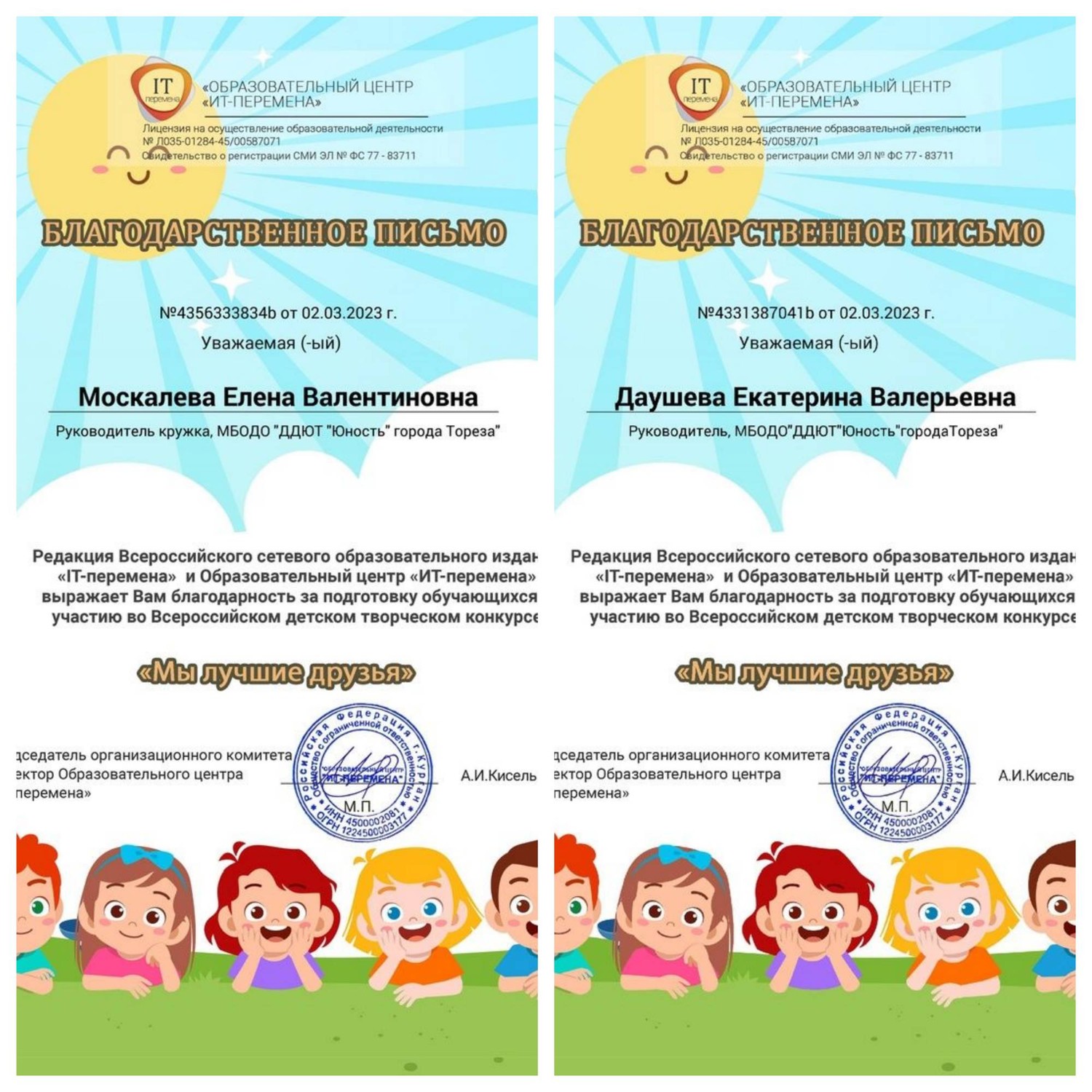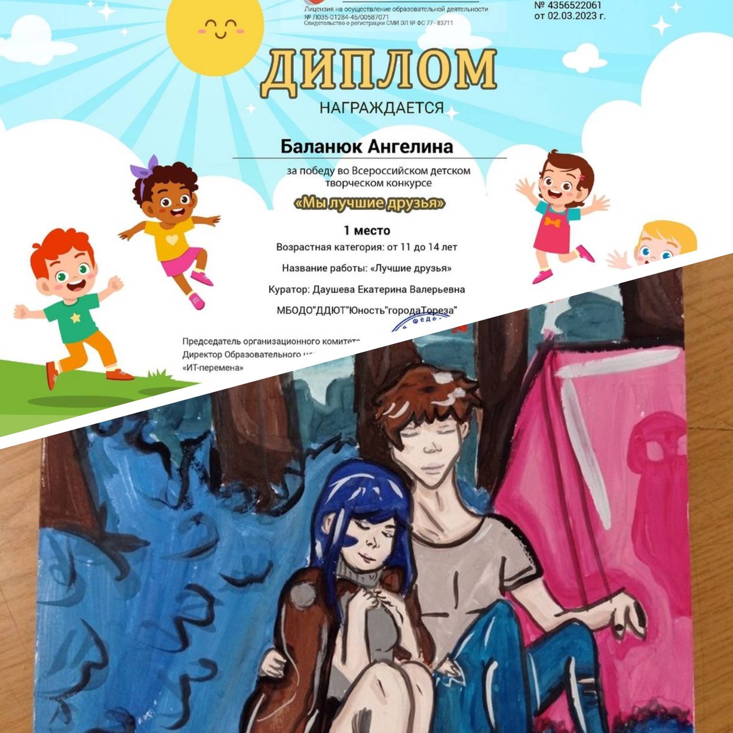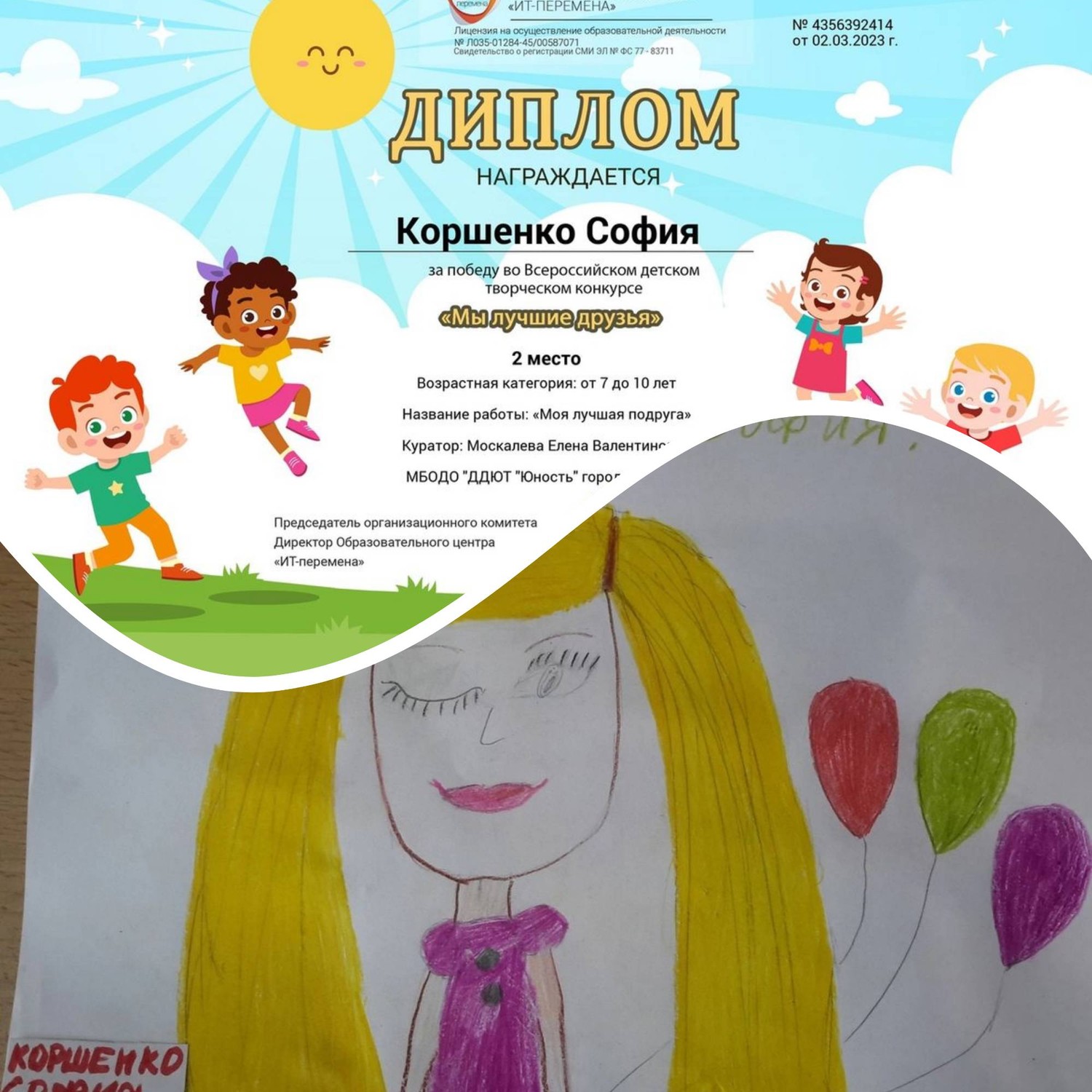 С 17 февраля по 2 марта обучающиеся ТО МБОДО «ДДЮТ «Юность» приняли участие во Всероссийском детском творческом конкурсе «Мы лучшие друзья» от ООО «Образовательный центр «ИТ-перемена», г.Курган. Надежные друзья — это большое сокровище. Учиться этому сложному и важному для развития личности взаимодействию дети начинают с дошкольного возраста, ценить настоящую дружбу — гораздо позже. Общие интересы или соседние подъезды — объединить может что угодно, но как сохранить такие отношения и отличить дружбу от приятельства — объяснить это задача взрослых. Мы предлагаем начать с малого: изобразить лучшего друга в любой технике. Если портрет получится — он станет ещё и отличным подарком на любой праздник. Итоги конкурса – 2 первых и 2 вторых места. Образцовый художественный коллектив «Школа красоты» (педагог Москалева Е.В.): 1-е место – Карпенко Анна; 2-е место – Коршенко София. Народный художественный коллектив «Живопись и графика» (педагог Даушева Е.В.): 1-е места – Баланюк Ангелина; 2-е место – Мульченко Полина. Педагоги награждены благодарственными письмами. Поздравляем!
