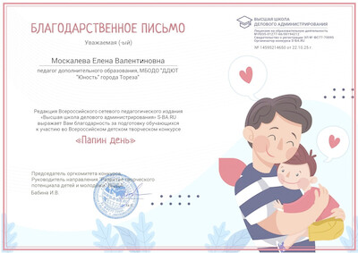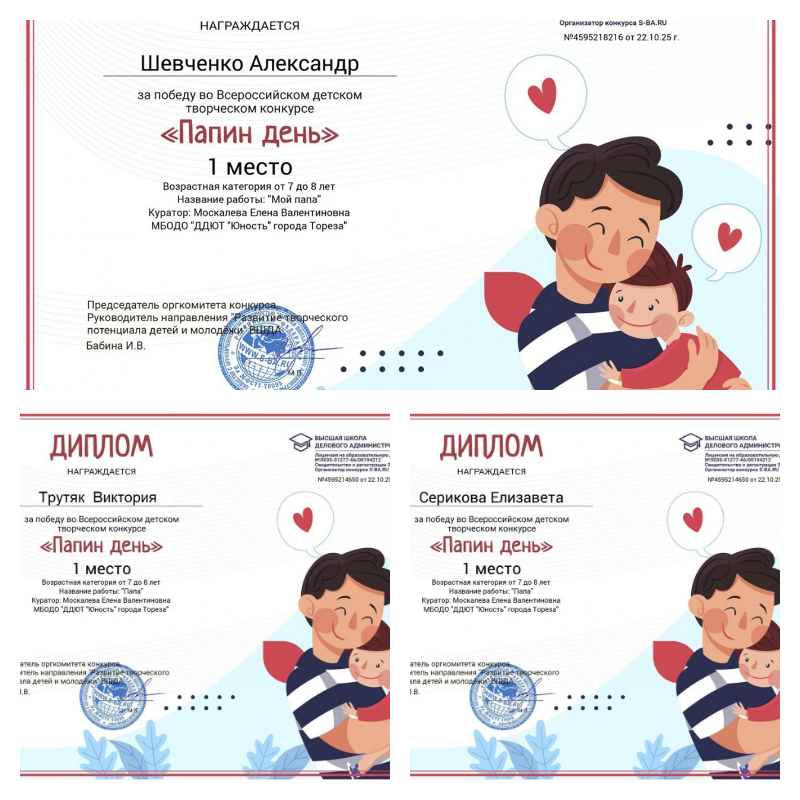 С 16 по 23 октября 2025 года обучающиеся образцового художественного коллектива «Школа красоты» (педагог Москалева Е.В.) приняли участие во Всероссийском детском творческом конкурсе «Папин день» (ВШДА, г. Екатеринбург). В этом году День отца выпал на 19 октября! Ваши шедевры – это прекрасный подарок для наших замечательных пап! Итоги конкурса – 3 первых места! 1 место - Серикова Елизавета, Трутяк Виктория, Шевченко Александр. Педагог награждена благодарственным письмом. Молодцы! Так держать! | |
