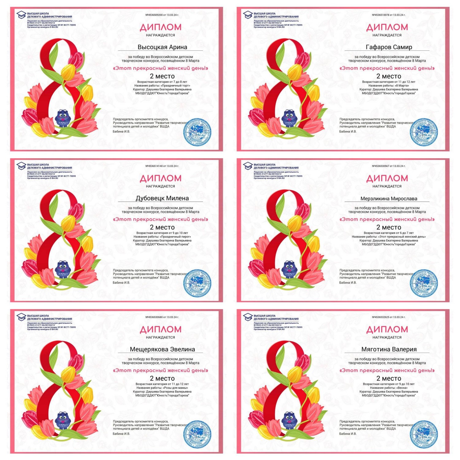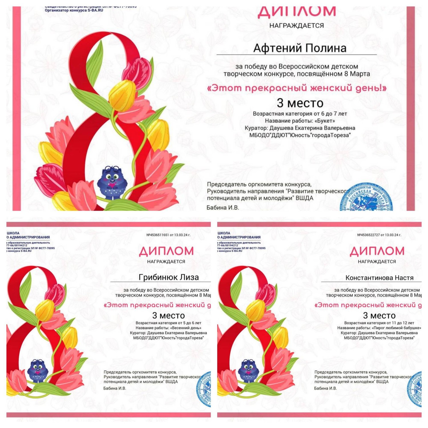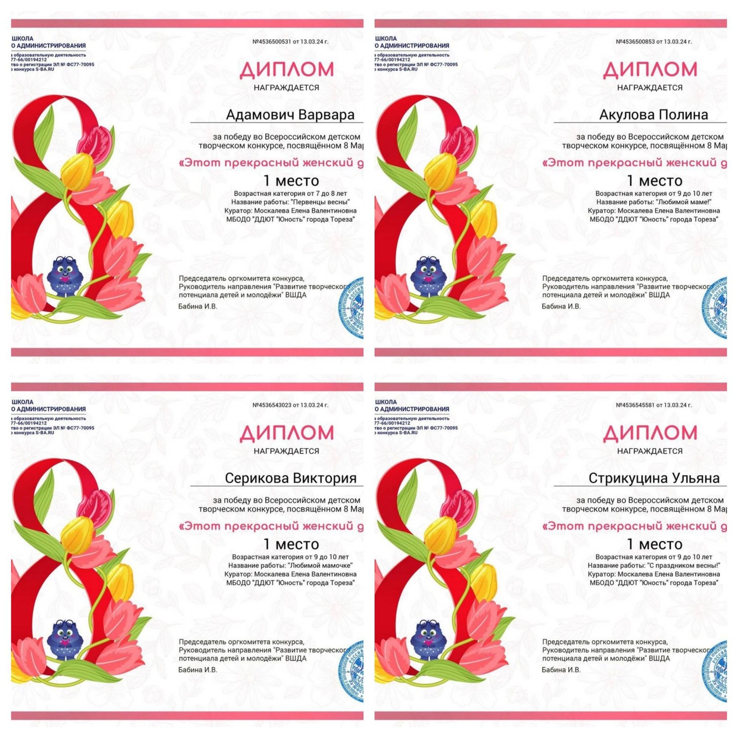 С 5 по 13 марта 2024 обучающиеся ТО МБОДО «ДДЮТ «Юность» приняли участие во Всероссийском детском творческом конкурсе, посвящённом 8 Марта «Этот прекрасный женский день!» (ВШДА г. Екатеринбург). Основные цели и задачи Конкурса: • всестороннее содействие развитию детского изобразительного и декоративно-прикладного творчества; • предоставление участникам возможности в состязательной форме развить и продемонстрировать свои творческие способности. Итоги конкурса – 12 первых, 6 вторых и 3 третьих места! Народный художественный коллектив «Живопись и графика» (педагог Даушева Е.В.) – 8 первых, 6 вторых и 3 третьих мест: 1-е место – Ананченко Василиса, Гафаров Семур, Грунь София, Ковредова Вероника, Медяник Дарьяна, Припасаева Соня, Самущик София, Серёгина Ульяна; 2-е место – Высоцкая Арина, Гафаров Самир, Дубовецк Милена, Мерзликина Мирослава, Мещерякова Эвелина, Мяготина Валерия; 3-е место – Афтений Полина, Грибинюк Лиза, Константинова Настя. Образцовый художественный коллектив «Школа красоты» (педагог Москалева Е.В.) – 4 первых места: 1-е место – Адамович Варвара, Акулова Полина, Серикова Виктория, Стрикуцинв Ульяна. Педагоги награждены благодарственными письмами. Молодцы! Так держать! | |