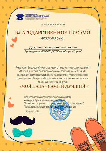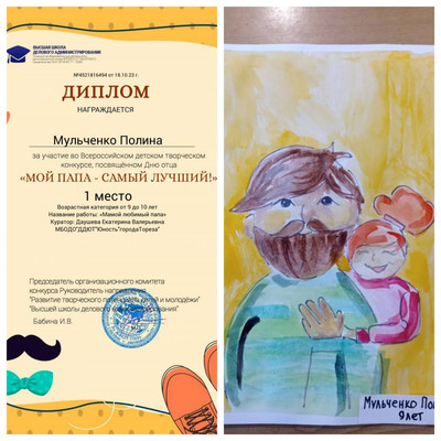С 12.10.2023 по 17.10.2023 прошёл Всероссийский детский творческий конкурс, посвящённый Дню отца «Мой папа -самый лучший!», в котором приняла участие Мульченко Полина, обучающаяся народного художественного коллектива «Живопись и графика» (педагог Даушева Е.В.). В этом году 15 октября (третье воскресенье месяца) в России празднуется День отца. Официально этот праздник был учреждён лишь в 2021 году, однако его праздновали и до этого, а некоторые регионы ещё раньше ввели День отца на законодательном уровне. Основные цели и задачи Конкурса: • всестороннее содействие развитию детского изобразительного и декоративно-прикладного творчества; • предоставление участникам возможности в состязательной форме развить и продемонстрировать свои творческие способности; • популяризация семейных ценностей. Итоги конкурса – 1 место! Руководитель награждена благодарственным письмом. Поздравляем!