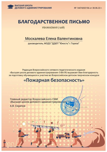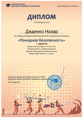Диденко Назар, обучающийся образцового художественного коллектива «Школа красоты» (педагог Москалева Е.В.), принял участие во Всероссийском детском творческом конкурсе «Пожарная безопасность» (всероссийское СМИ «Высшая школа делового администрирования»). По итогам конкурса Назар завоевал 1-е место! Руководитель награждён благодарственным письмом. Поздравляем с победой! Летние каникулы - это время, когда наибольшее количество детей и подростков имеет наименьший контроль со стороны взрослых. Поэтому необходимо уделить особое внимание безопасности детей в этот период. Детская шалость с огнём является далеко не последней причиной пожаров. Именно поэтому столь важно не допускать игр детей со спичками и зажигалками, а также рассказывать им о правилах пожарной безопасности. Предупредить пожар - главная задача.
