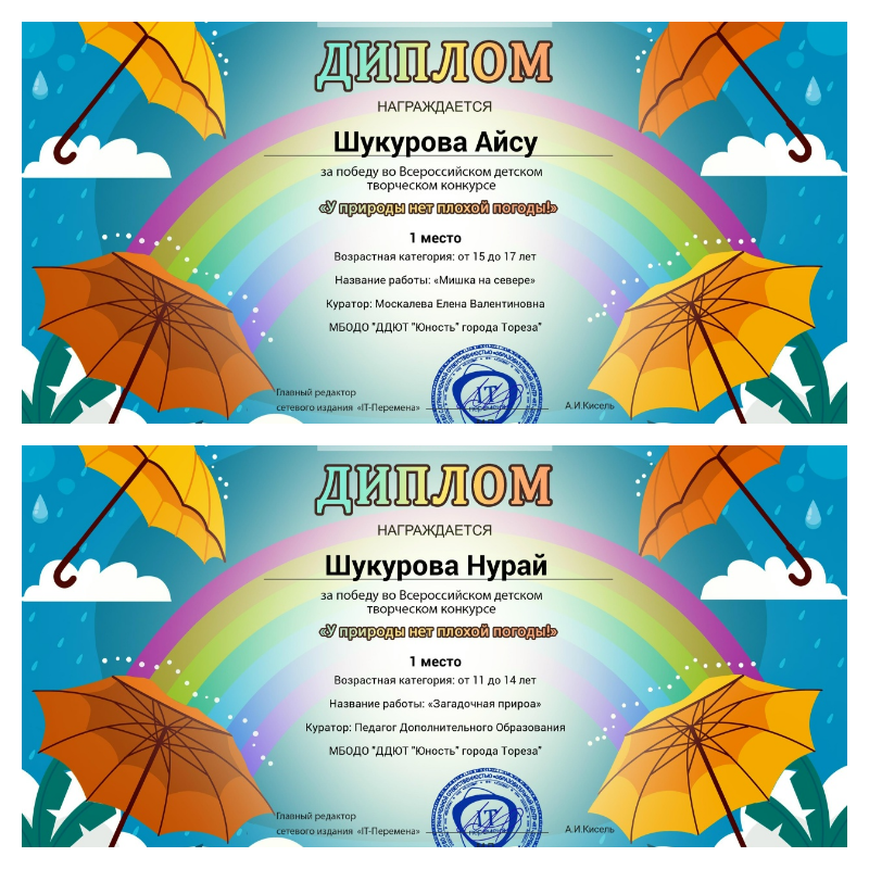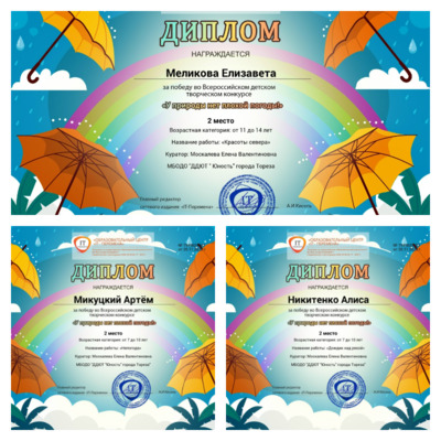 В середине ноября 2025 года обучающиеся образцового художественного коллектива «Школа красоты» (педагог Москалева Е.В.) приняли участие во Всероссийском детском творческом конкурсе «У природы нет плохой погоды (ИТ-Перемена, г. Курган). А вы замечали, как преображается мир в лучах заходящего солнца или в густом утреннем тумане? Наш творческий конкурс «У природы нет плохой погоды!» — это приглашение остановить мгновение и разглядеть всю палитру красок, скрытую в стихии. Юные художники запечатлели их самое любимое или самое загадочное природное явление —танец сверкающих снежинок, мощь летней грозы, невесомость пушистого облака или радость солнечного зайчика на стене. Вдохновение можно найти в любой погоде! Итоги конкурса – 11 первых и 3 вторых места! 1-е место –Гладченко Александра, Доброва Арина, Дуброва Мария, Коркина Ульяна, Коршикова Карина, Крушельницкая Кира, Лукьянчикова Валерия, Полторацкая Дарья, Починко Ярослава, Шукурова Айсу, Шукурова Нурай. 2-е место –Меликова Елизавета, Микуцкий Артём, Никитенко Алиса. Педагог награждена благодарственным письмом. Поздравляем! Желаем творческих успехов!