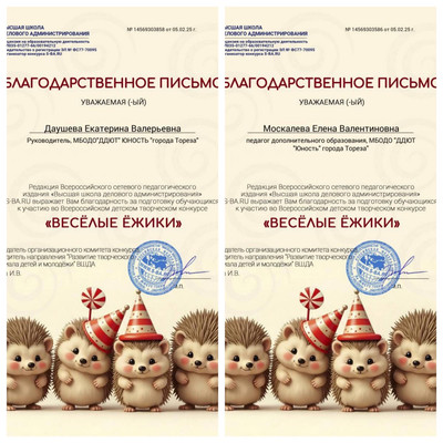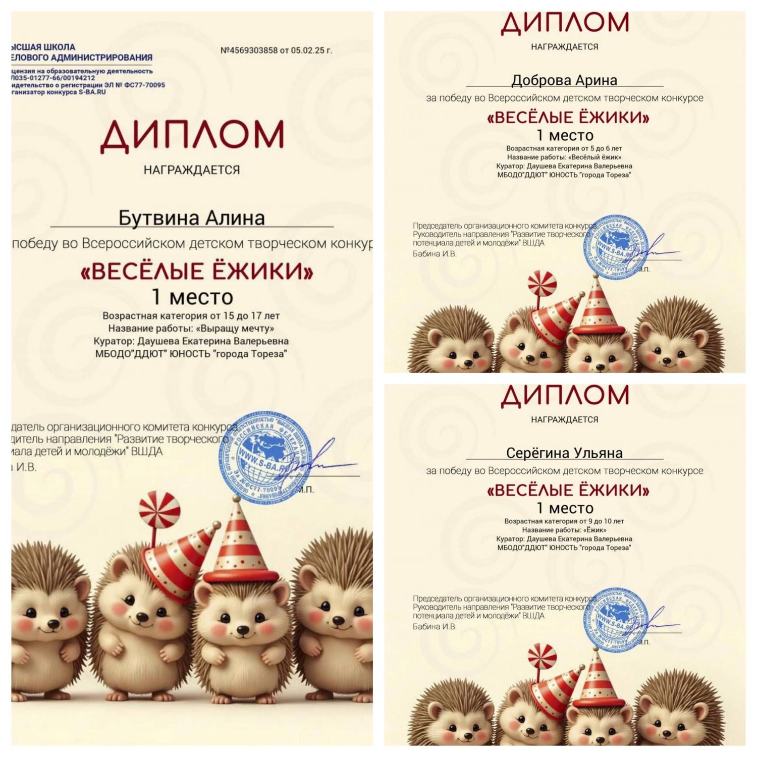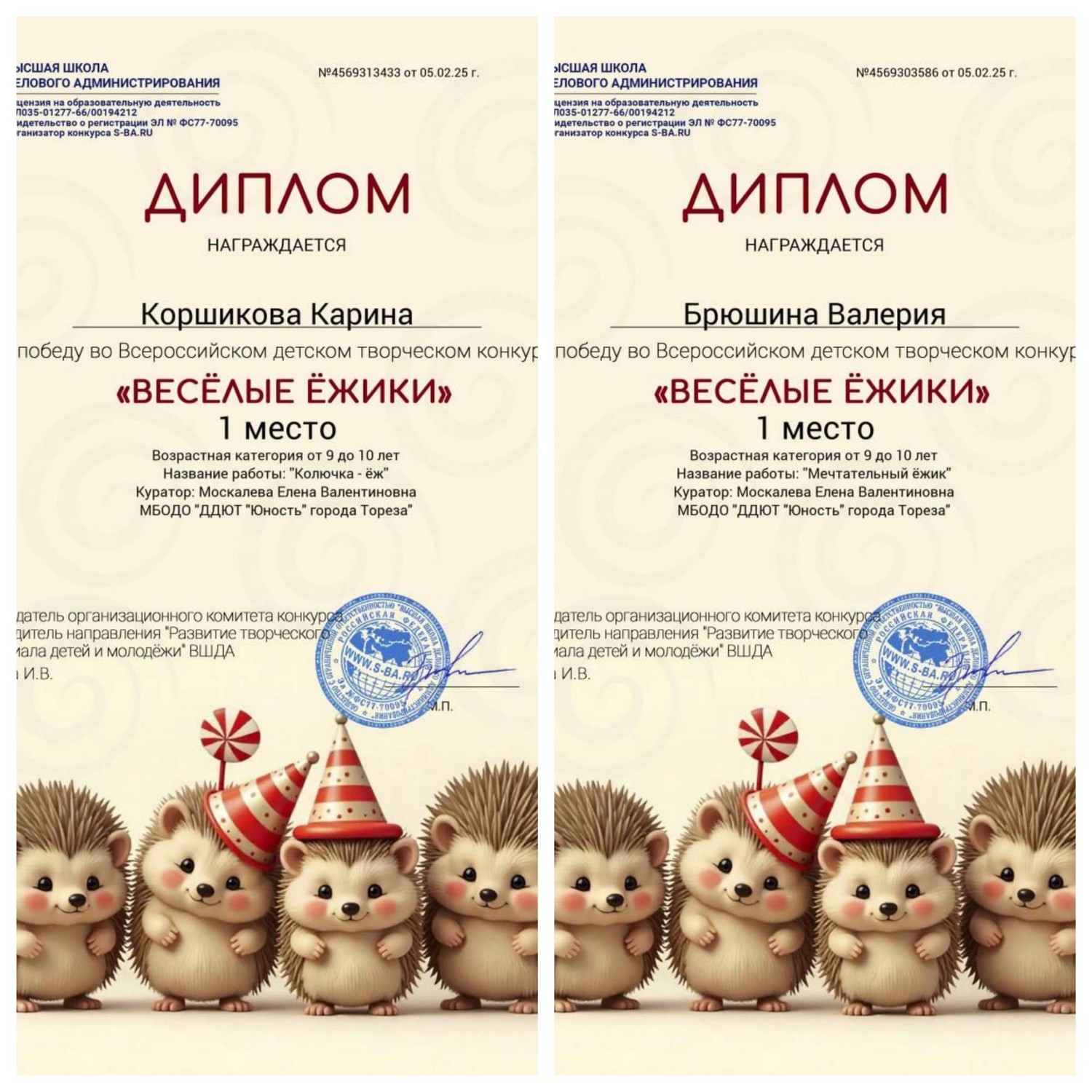 С 30 января по 4 февраля 2025 обучающиеся образцового художественного коллектива «Школа красоты» (педагог Москалева Е.В.) и народного художественного коллектива «Живопись и графика» (педагог Даушева Е.В.) приняли участие во Всероссийском детском творческом конкурсе «Весёлые ёжики» (ВШДА, г. Екатеринбург). А вы знали, что ежики – тоже хвостатые? Просто их хвост очень маленький, буквально до 3-х сантиметров в длину, и из-за иголок его просто-напросто не видно. Почему мы вдруг решили рассказать про ежей? Потому что пора их поздравлять! 2 февраля отмечается Международный день ежей. В старину люди примерно в это время будили колючих зверьков и пытались по их поведению понять, какой будет весна, и составляли прогноз погода. Цель конкурса: предоставление возможности демонстрации творческих способностей в конкурсной форме. Задачи конкурса: • конкурс направлен на стимулирование творческой деятельности; • выявление, сопровождение и поддержку талантливых участников конкурса в области декоративно-прикладного творчества. Итоги конкурса – 5 первых мест! Народный художественный коллектив «Живопись и графика» (педагог Даушева Е.В.) – 3 первых места: 1-е место –Доброва Арина, Бутвина Алина, Серёгина Ульяна. Образцовый художественный коллектив «Школа красоты» (педагог Москалева Е.В.) – 2 первых места: 1-е места – Брюшина Валерия, Коршикова Карина. Педагоги награждены благодарственными письмами. Молодцы!
