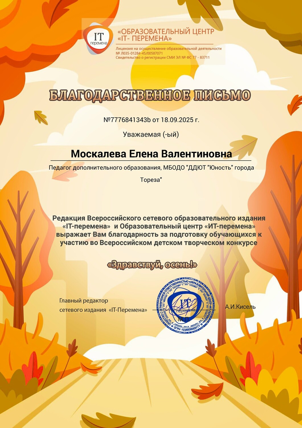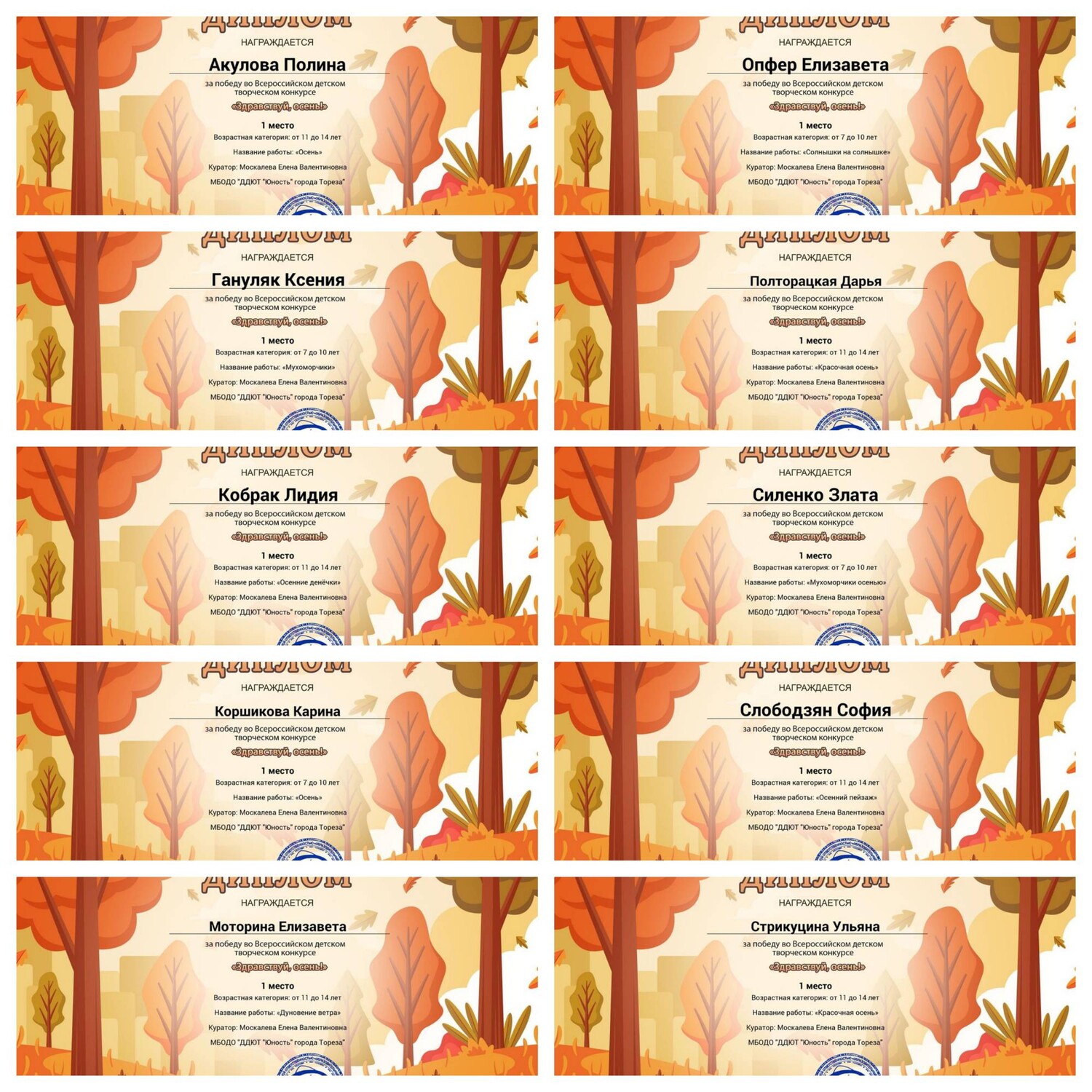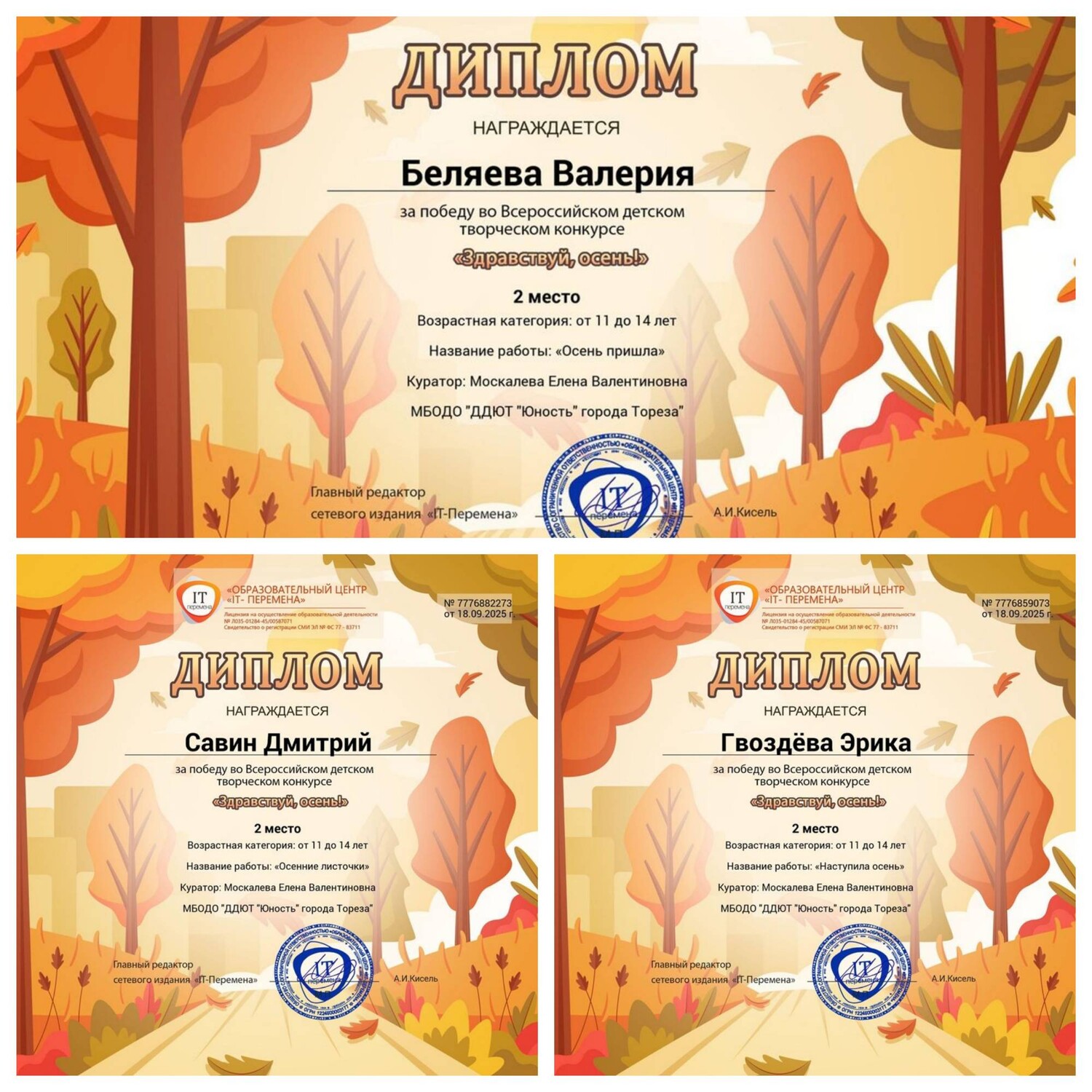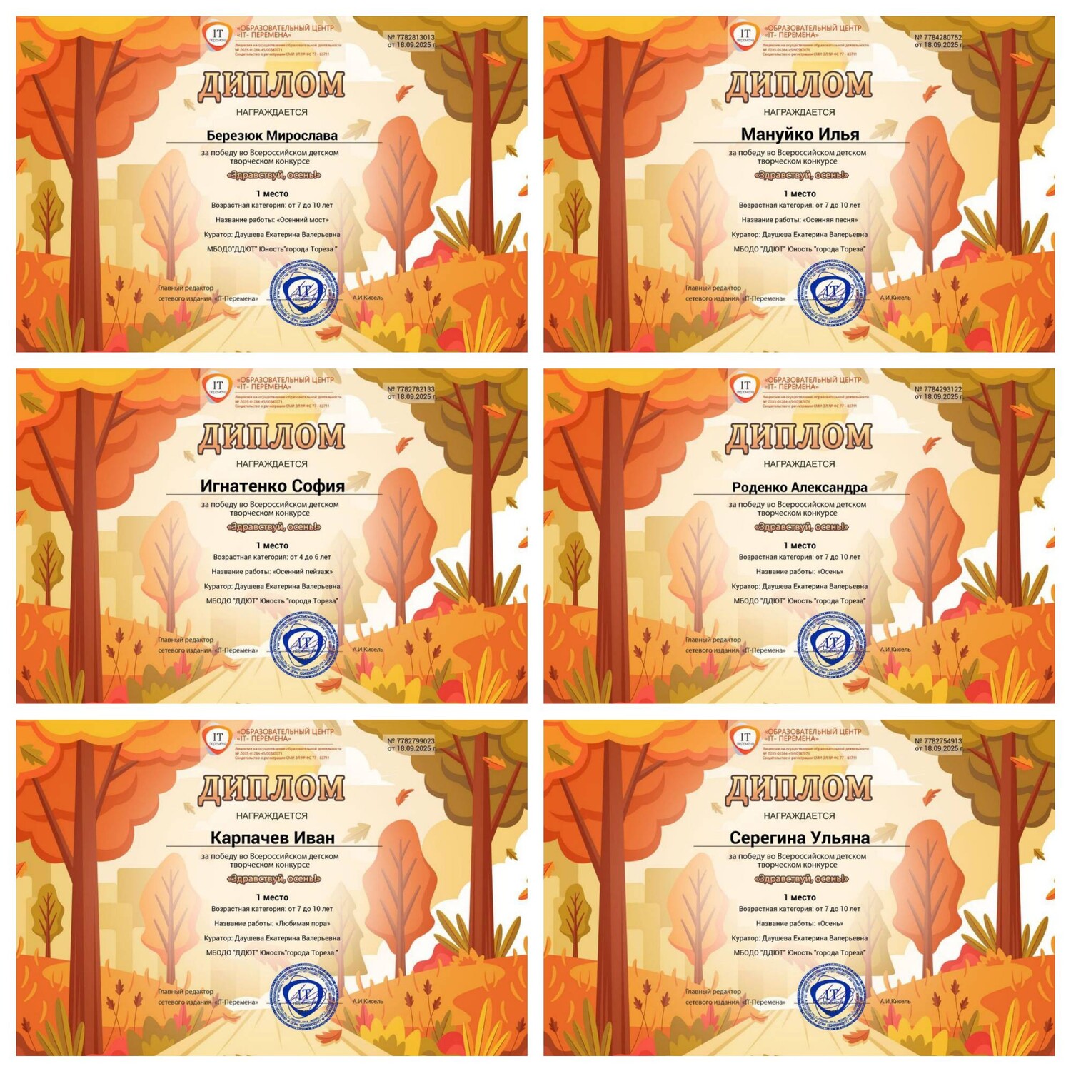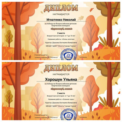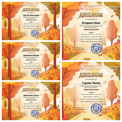 С 11 по 17 сентября 2025 года обучающиеся образцового художественного коллектива «Школа красоты» (педагог Москалева Е.В.) приняли участие во Всероссийском детском творческом конкурсе «Здравствуй, осень!» (ИТ-Перемена, г. Курган). Осень дарит нам яркие краски, шорох листвы и уютные мгновения, вы можете передать своё настроение в рисунках, поделках или других творческих работах. Здесь каждый сможет показать, как он чувствует осень: радость первых дождей, красоту аллеи в листопаде или аромат тёплых яблок. Итоги конкурса – 21 первое и 5 вторых места! Образцовый художественный коллектив «Школа красоты» - 15 первых и 3 вторых места: 1-е место – Гануляк Ксения, Акулова Полина, Гурова Лилия, Кобрак Лидия, Коршикова Карина, Моторина Елизавета, Опфер Елизавета, Полторацкая Дарья, Силенко Злата, Слободзян София, Стрикуцина Ульяна, Трутяк Виктория, Шамкина Мария, Шевченко Саша, Ягодина Ника. 2-е место –Беляева Валерия, Гвоздёва Эрика, Савин Дмитрий. Народный художественный коллектив «Живопись и графика» - 6 первых и 2 вторых места: 1-е место – Серёгина Ульяна, Игнатенко София, Карпачёв Иван, Березюк Мирослава, Мануйко Илья, Роденко Мирослава. 2-е места – Игнатенко Николай, Хорошун Ульяна. Педагоги награждены благодарственными письмами. Поздравляем! Желаем творческих успехов! | |