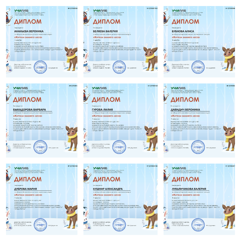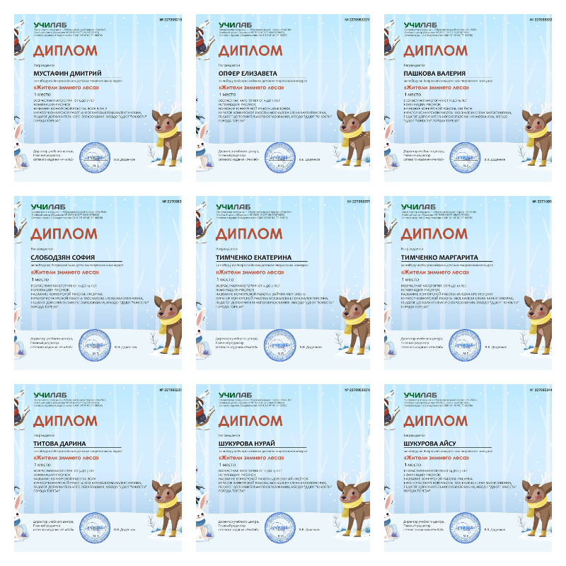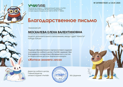 Зима — волшебное время года, когда природа одевается в белоснежный наряд, а леса становятся особенно загадочными. Приглашаем к участию во Всероссийском детском творческом конкурсе «Жители зимнего леса», чтобы вместе погрузиться в атмосферу зимней сказки и рассказать о ее обитателях! Итоги конкурса – 18 первых мест! 1 места – Тимченко Маргарита, Тимченко Екатерина, Титова Дарина, Шукурова Айсу, Шукурова Нурай, Опфер Елизавета, Пашкова Валерия, Слободзян София, Мустафин Дмитрий, Ананьева Вероника, Беляева Валерия, Бубнова Алиса, Быкадорова Варвара, Гурова Лилия, Давидич Вероника, Дуброва Мария, Кушнир Александра, Лукьянчикова Валерия, Педагог награждена благодарственным письмом. Поздравляем!