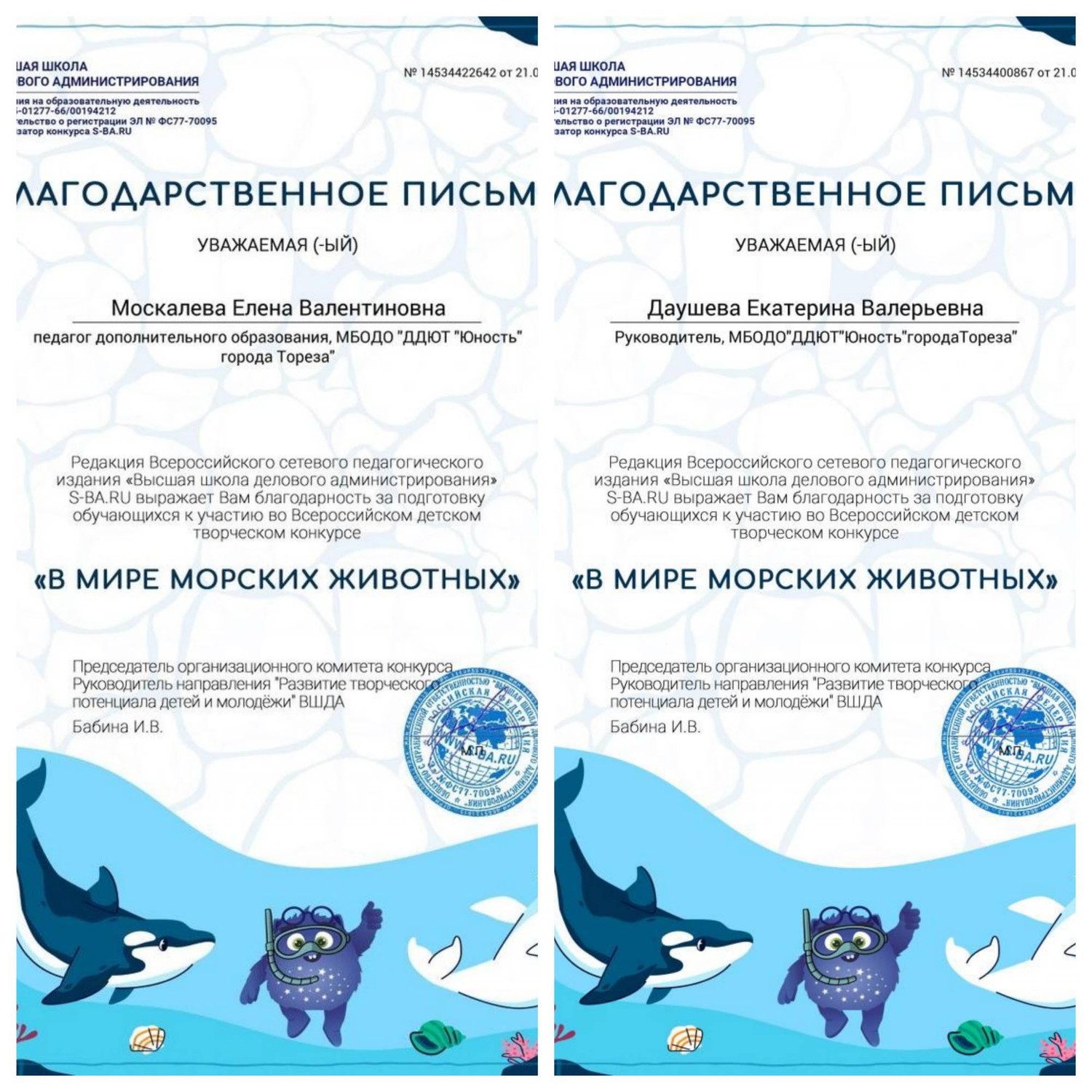 С 15 по 20 февраля 2024 обучающиеся образцового художественного коллектива «Школа красоты» (педагог Москалева Е.В.) и народного художественного коллектива «Живопись и графика» (педагог Даушева Е.В.) приняли участие во Всероссийском детском творческом конкурсе «В мире морских животных» (ВШДА, г. Екатеринбург). 19 февраля во всём мире отмечается День защиты морских млекопитающих. А их немало! Сюда относятся и киты, и тюлени, и моржи, и выдры, и даже – на минутку – белые медведи. Основные цели и задачи Конкурса: • всестороннее содействие развитию детского изобразительного и декоративно-прикладного творчества; • предоставление участникам возможности в состязательной форме развить и продемонстрировать свои творческие способности; • расширение знаний о морских млекопитающих, нуждающихся в защите; • приобщение к экологическим идеям. Итоги конкурса – 2 первых и 1 второе место! Образцовый художественный коллектив «Школа красоты» (педагог Москалева Е.В.) – 1 первое и 1 второе место: 1-е место –Слободзян София. 2-е место – Полторацкая Дарья. Народный художественный коллектив «Живопись и графика» (педагог Даушева Е.В.) – 1 первое место: 1 –е место – Ананченко Василиса. Педагоги награждены благодарственными письмами. Молодцы! Продолжайте нас радовать!