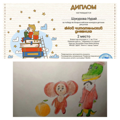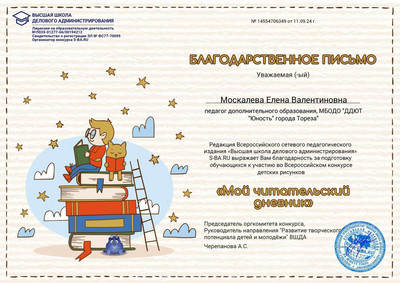 Обучающиеся образцового художественного коллектива «Школа красоты» (педагог Москалева Е.В.) с 05.09 по 10.09.2024 приняли участие во Всероссийском конкурсе детских рисунков «Мой читательский дневник» (ВШДА, г. Екатеринбург). За время каникул можно было не только хорошенько наиграться на солнце, но и ознакомиться с новыми интересными книгами. Итоги конкурса: 1-е место – Шукурова Айсу, 2-е место – Шукурова Нурай. Педагог награждена благодарственным письмом. Молодцы! Так держать! | |