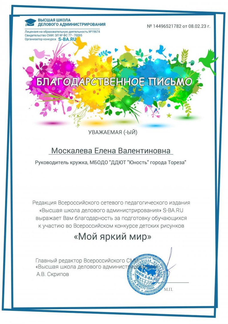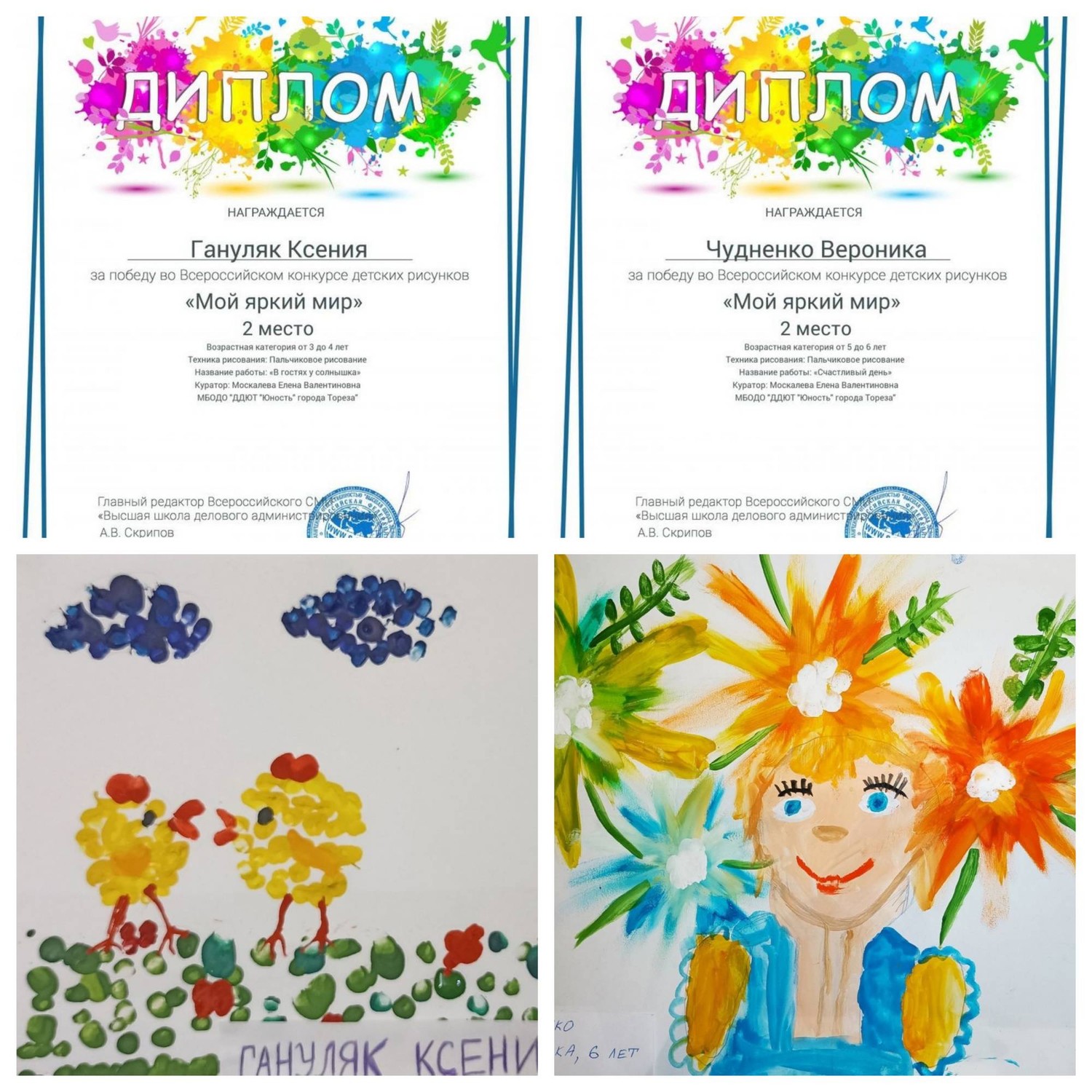 С 31 января по 7 февраля обучающиеся образцового художественного коллектива «Школа красоты» (педагог Москалева Е.В.) приняли участие во Всероссийском конкурсе детских рисунков «Мой яркий мир» от Высшей школы делового администрирования (г. Екатеринбург). Рисование – это процесс познания и выражения себя, поэтому так важно не ставить перед ребенком строгие рамки и определенные шаблоны, а дать возможность творить. Рисование необычными материалами и методами развивает креативное мышление и воображение. Это отличный способ увлечь ребенка и показать ему, насколько необычным может быть творчество. На конкурс принимались рисунки на свободную тему, выполненные исключительно в таких техниках рисования как: • Пальчиковое рисование • Кляксография • Монотипия • Ниткография • Пластилинография По итогам конкурса 2-е места заняли юные художницы – Чудненко вероника и Гануляк Ксения. Педагог награждена благодарственным письмом. Молодцы! | |