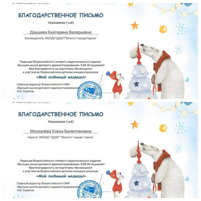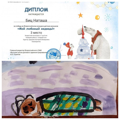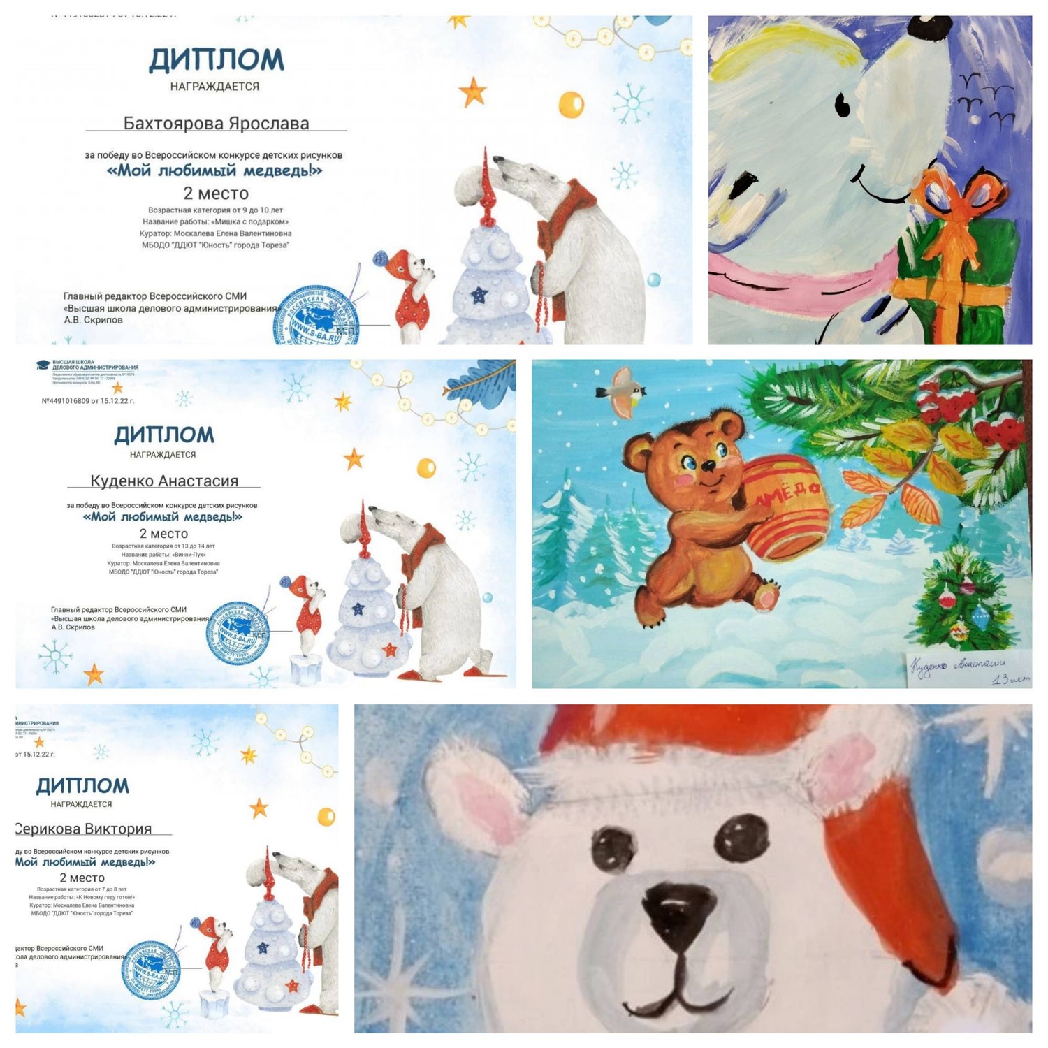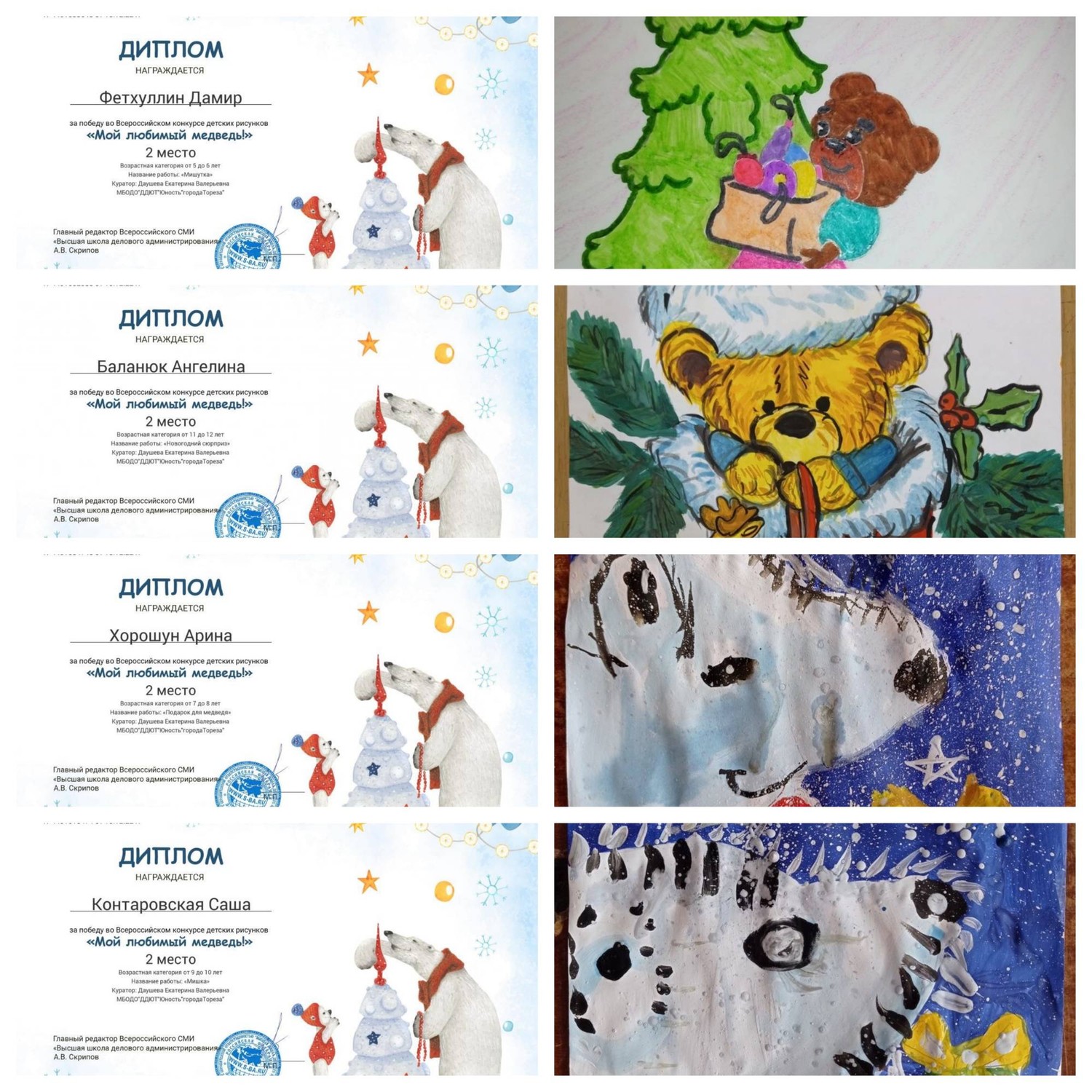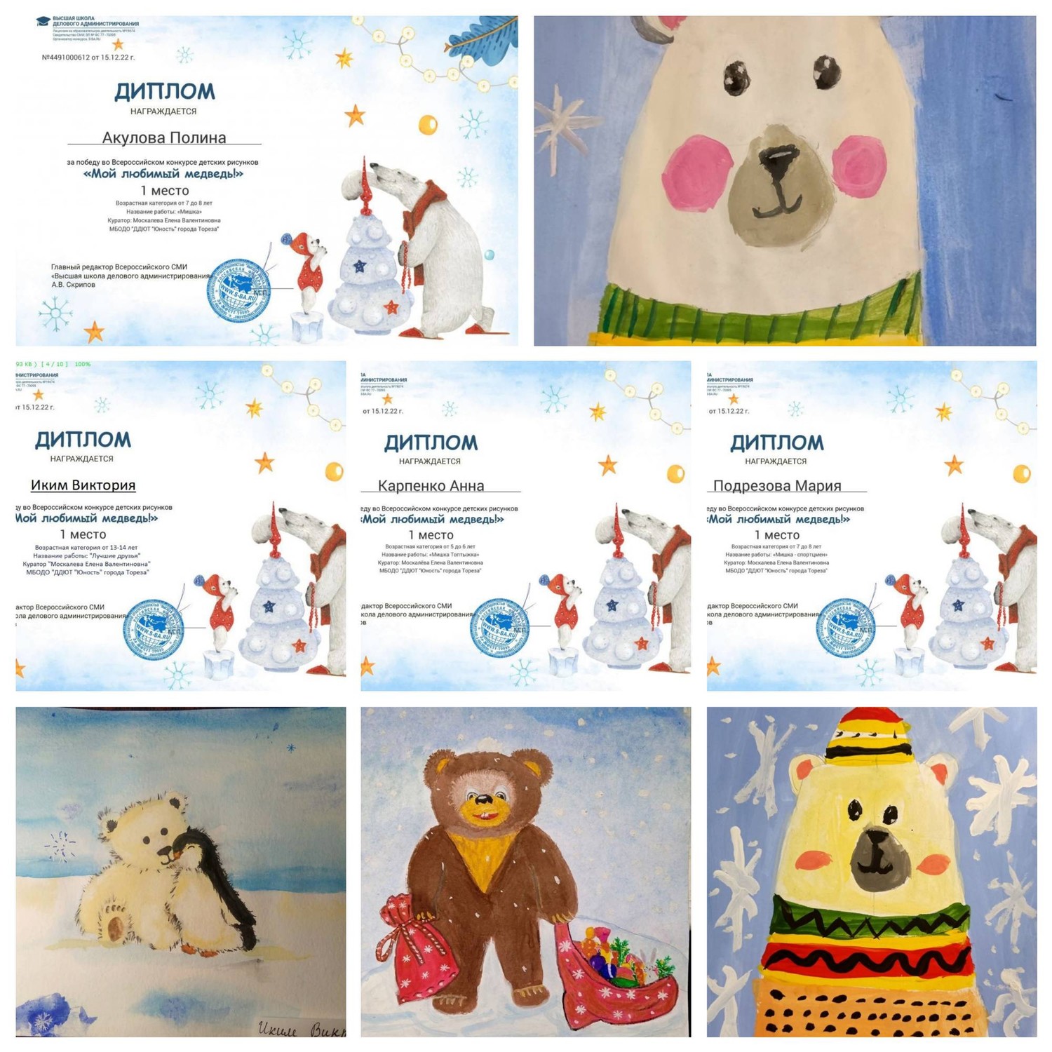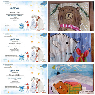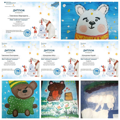 День медведя отмечается ежегодно 13 декабря во многих регионах России. Праздник, посвященный этому животному, не случайно появился в календаре – ведь медведь издавна почитается русскими людьми и считается символом России за свою силу и мощь. Дата же выбрана с связи с тем, что 13 декабря, как принято считать, все косолапые окончательно устраиваются в берлогах на зимнюю спячку и не выходят до весны. С 9 по 14 декабря обучающиеся творческих коллективов приняли участие во Всероссийском конкурсе детских рисунков «Мой любимый медведь» от Высшей школы делового администрирования (г. Екатеринбург). Итоги конкурса – 4 первых, 14 вторых и 1 третье место. Народный художественный коллектив «Живопись и графика» (педагог Даушева Е.В.) – 7 вторых и 1 третье место. 2 место – Клыпа София, Коновалова Вероника, Фетхуллин Дамир, Самущик София, Хорошун Арина, Контаровская Александра, Баланюк Ангелина; 3 место – Биц Наталья. Образцовый художественный коллектив «Школа красоты» (педагог Москалева Е.В.) – 4 первых, 7 вторых мест. 1-е место – Иким Виктория, Акулова Полина, Подрезова Мария, Карпенко Анна; 2-е место – Шукурова Нурай, Шукурова Айсу, Тимченко Екатерина, Тимченко Маргарита, Серикова Виктория, Куденко Анастасия, Бахтоярова Ярослава. Педагоги награждены благодарственными письмами за подготовку участников конкурса. Молодцы! | |