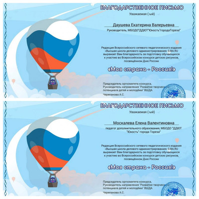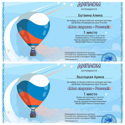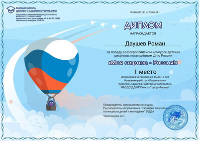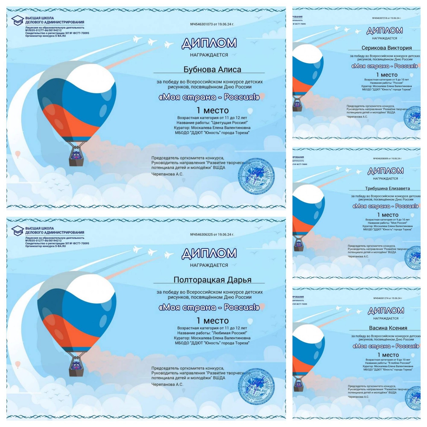 С 13 по 18 июня 2024 обучающиеся образцового художественного коллектива «Школа красоты» (педагог Москалева Е.В.) и народного художественного коллектива «Живопись и графика» (педагог Даушева Е.В.) приняли участие во Всероссийском конкурсе детских рисунков, посвящённым Дню России «Моя страна – Россия!» (ВШДА, г. Екатеринбург). Каждый год 12 июня мы всей страной празднуем День России! Именно в этот день более 30-ти лет назад был признан суверенитет нашей страны, и после появилась уже знакомая всем государственная символика Основные цели и задачи Конкурса: • всестороннее содействие развитию детского изобразительного и декоративно-прикладного творчества; • предоставление участникам возможности в состязательной форме развить и продемонстрировать свои творческие способности; • популяризация значимых национальных праздников, приобщение к национальной культуре; • воспитание патриотизма среди детей, обучающихся в дошкольных и школьных учреждениях. Итоги конкурса – 8 первых мест! Образцовый художественный коллектив «Школа красоты» (педагог Москалева Е.В.) – 5 первых мест: 1 место – Бубнова Алиса, Васина Ксения, Полторацкая Дарья, Серикова Виктория, Трибушина Елизавета. Народный художественный коллектив «Живопись и графика» (педагог Даушева Е.В.) – 3 первых места: 1 место – Высоцкая Арина, Даушев Роман и Бутвина Алина. Педагоги награждены благодарственными письмами. Поздравляем!