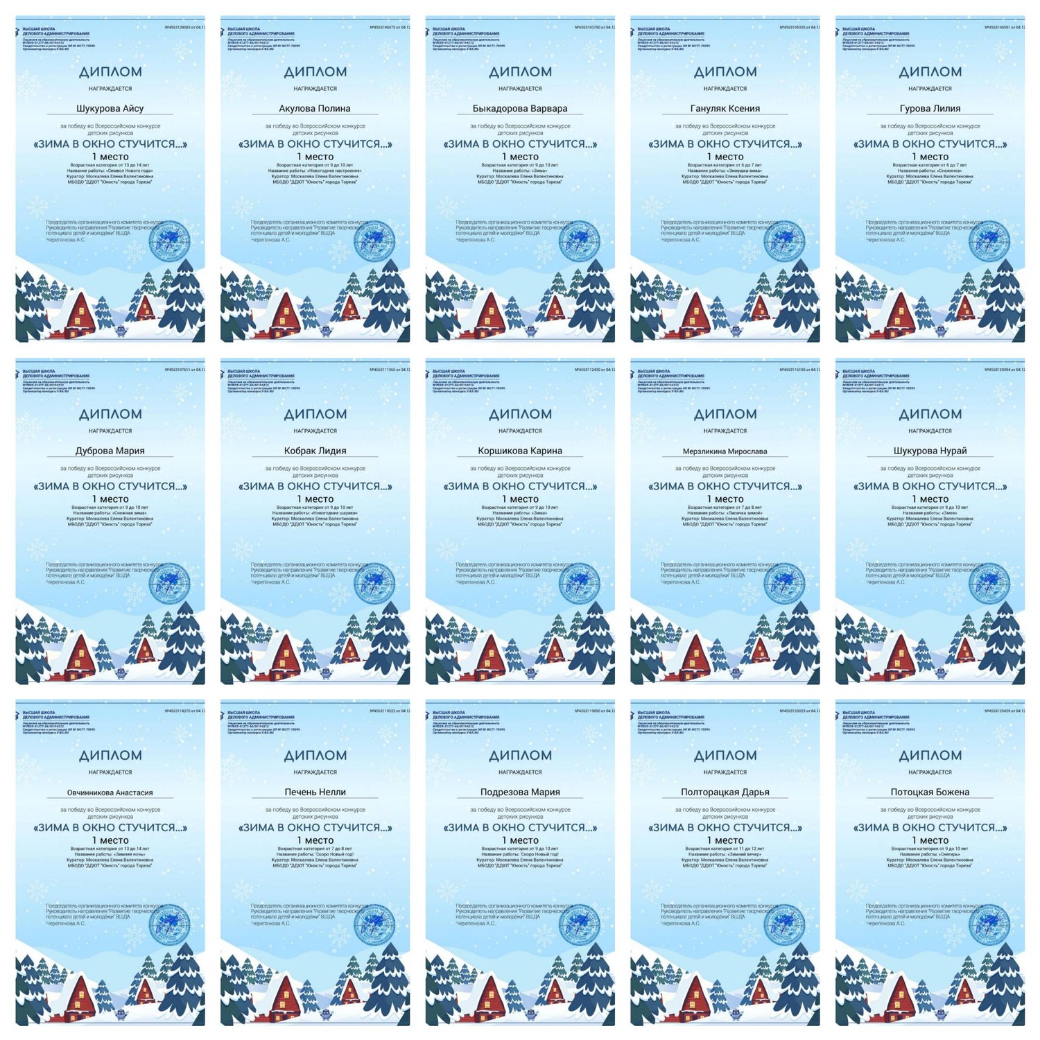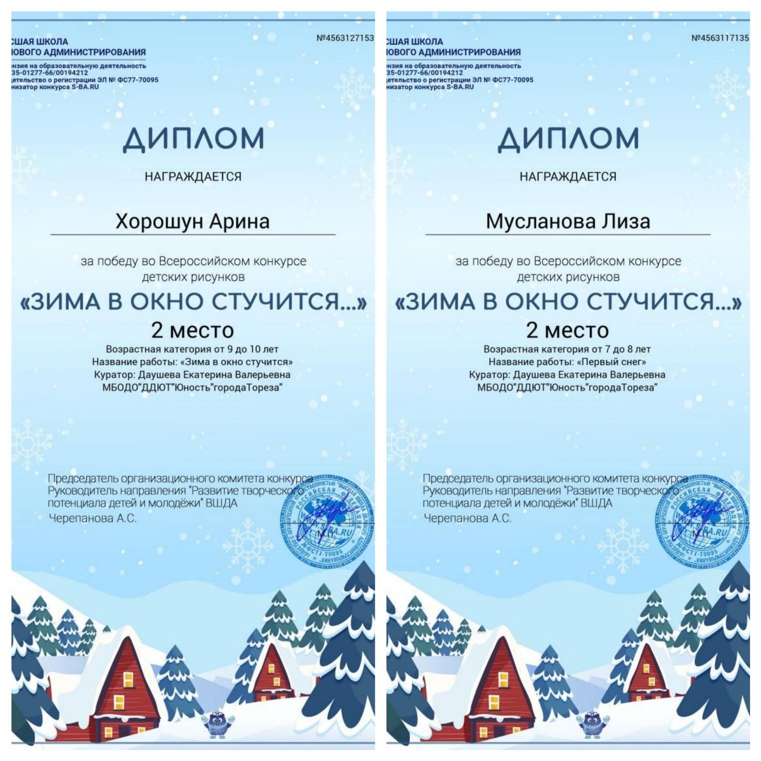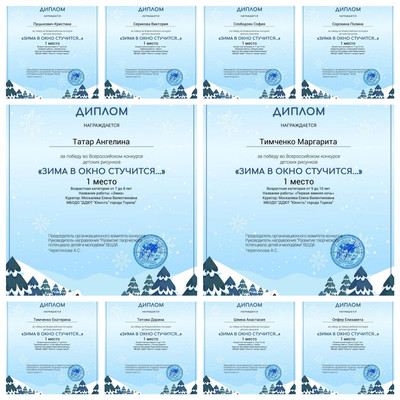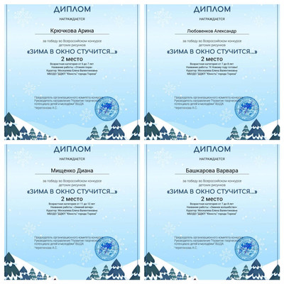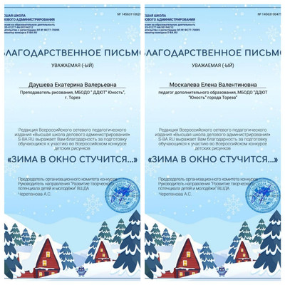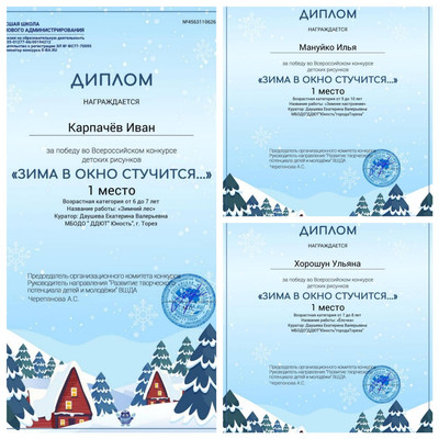 С 28 ноября по 3 декабря 2024 обучающиеся образцового художественного коллектива «Школа красоты» (педагог Москалева Е.В.) и народного художественного коллектива «Живопись и графика» (педагог Даушева Е.В.) приняли участие во Всероссийском конкурсе детских рисунков «Зима в окно стучится…» (ВШДА, г. Екатеринбург). Зима приближается к нам своей величавой морозной поступью, и никуда от неё не деться. А на и не хочется, ведь всё вокруг теперь искрится и сверкает! Уже взяли в руки кисть? Тогда пора рисовать красивые зимние пейзажи! Итоги конкурса – 28 первых и 6 вторых мест! Народный художественный коллектив «Живопись и графика» (педагог Даушева Е.В.) –3 первых и 2 вторых места: 1-е место –Карпачёв Иван, Мануйко Илья, Хорошун Ульяна. 2 место – Мусланова Лиза, Хорошун Арина. Образцовый художественный коллектив «Школа красоты» (педагог Москалева Е.В.) – 25 первых мест и 4 вторых: 1-е место – Акулова Полина, Быкадорова Варвара, Гануляк Ксения, Гурова Лилия, Дуброва Мария, Кобрак Лидия, Коршикова Карина, Мерзликина Мирослава, Овчинникова Анастасия, Опфер Елизавета, Печень Нелли, Подрезова Мария, Полторацкая Дарья, Потоцкая Божена, Пуцыкович Кристина, Серикова Виктория, Слободзян София, Сорокина Полина, Татар Ангелина, Тимченко Екатерина, Тимченко Маргарита, Титова Дарина, Шеина Анастасия, Шукурова Нурай, Шукурова Айсу. 2-е место – Башкарова Варвара, Крючкова Алина, Любовенков Александр, Мищенко Диана. Педагоги награждены благодарственными письмами. Так держать! Молодцы! | |
