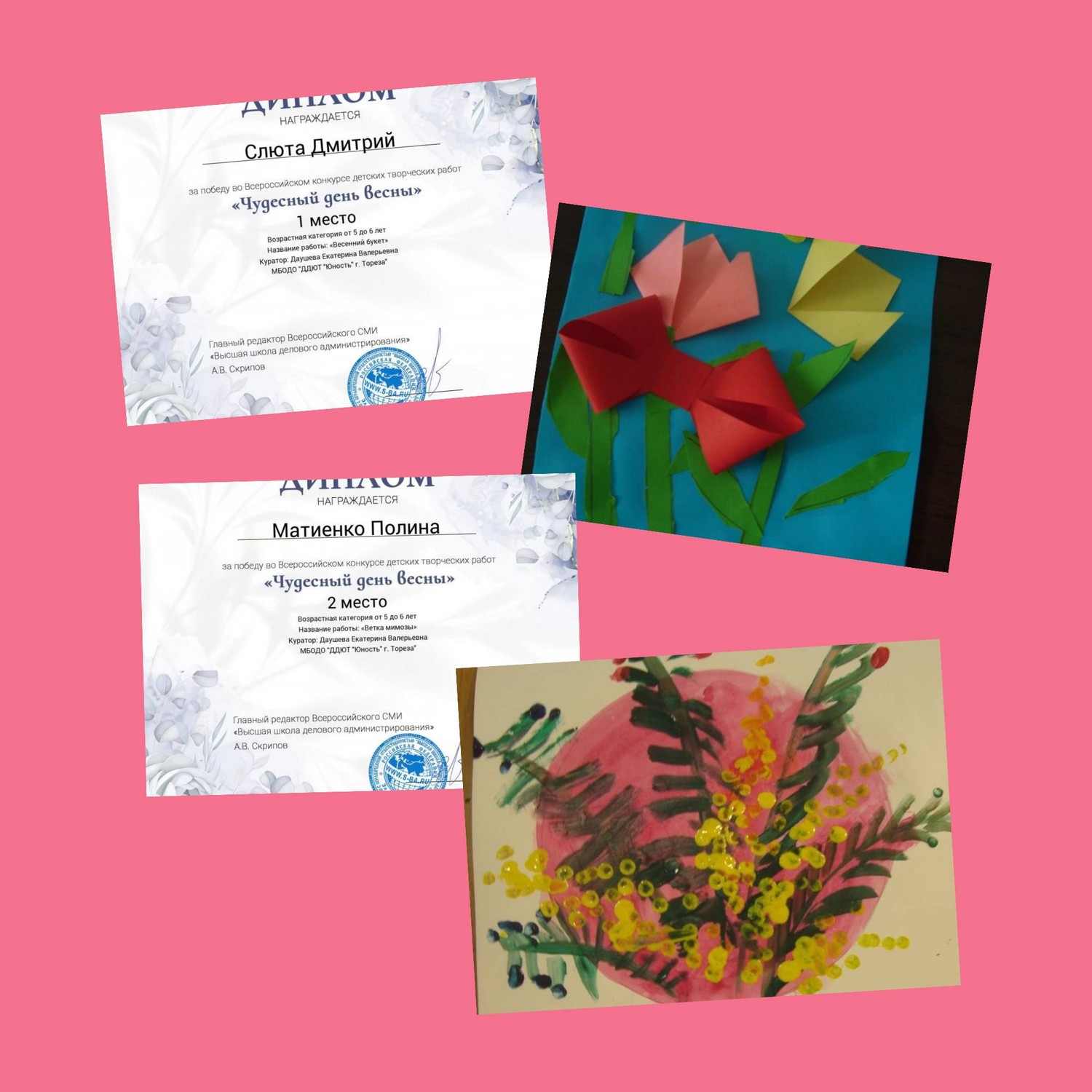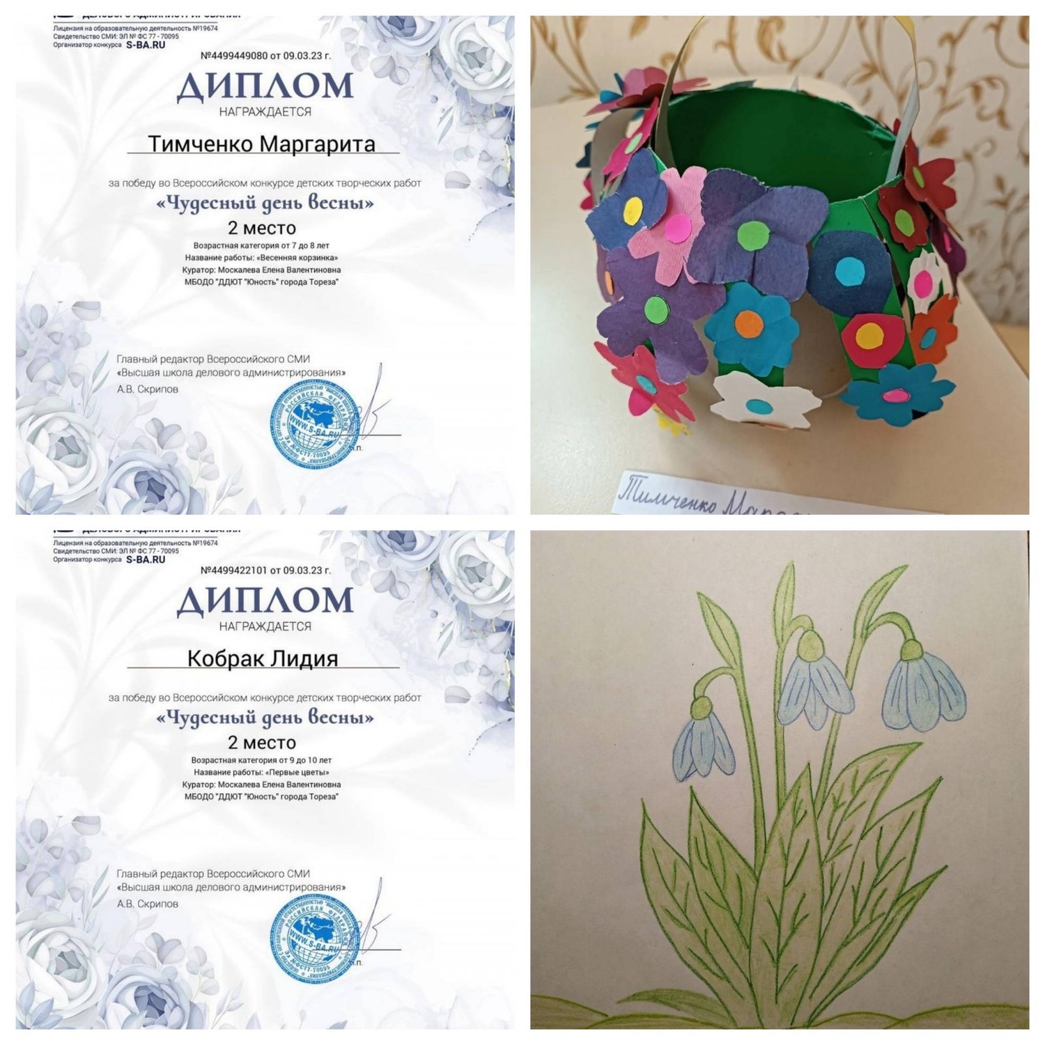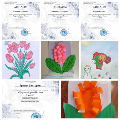 Я подарок маме Начал рисовать, Выглянуло солнце И зовёт гулять… Солнце, Солнце, Не сердись! Лучше рядышком садись. Мамин праздник раз в году, Нарисую и пойду! Улыбается солнце, совсем скоро зажурчат ручьи. Своим весёлым пением птицы напоминают нам о том, что пришла весна, а вместе с ней и главный замечательный праздник – Международный женский День 8 Марта. С 3 по 8 марта обучающиеся ТО МБОДО «ДДЮТ «Юность» приняли участие во Всероссийском конкурсе детских творческих работ «Чудесный день весны» (г. Екатеринбург) от Высшей школы делового администрирования. Цель Конкурса — развитие творческого мышления, фантазии и воображения; расширение кругозора детей. На конкурс надо было представить рисунок или поделку по теме. Итоги конкурса – 9 первых и 5 вторых мест. Народный художественный коллектив «Живопись и графика» (педагог Даушева Е.В.) – 4 первых и 2 вторых места: 1-е места – Болдарева Дарья, Баланюк Ангелина, Бутвина Алина, Мульченко Полина; 2-е места – Клыпа София и Красовская Ева. Школы раннего развития «Город друзей» и «Супер детки» (педагог направления «Изобразительное искусство» Даушева Е.В.) – 1 первое и 1 второе места: 1-е место – Слюта Дмитрий, 2-е место - Матиенко Полина. Образцовый художественный коллектив «Школа красоты» (педагог Москалева Е.В.) – 4 первых и 2 вторых места: 1-е места – Савченко Дарина, Тимченко Екатерина, Карпенко Анна, Трутяк Виктория; 2-е места – Тимченко Маргарита, Кобрак Лидия. Педагоги награждены благодарственными письмами. Молодцы!