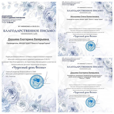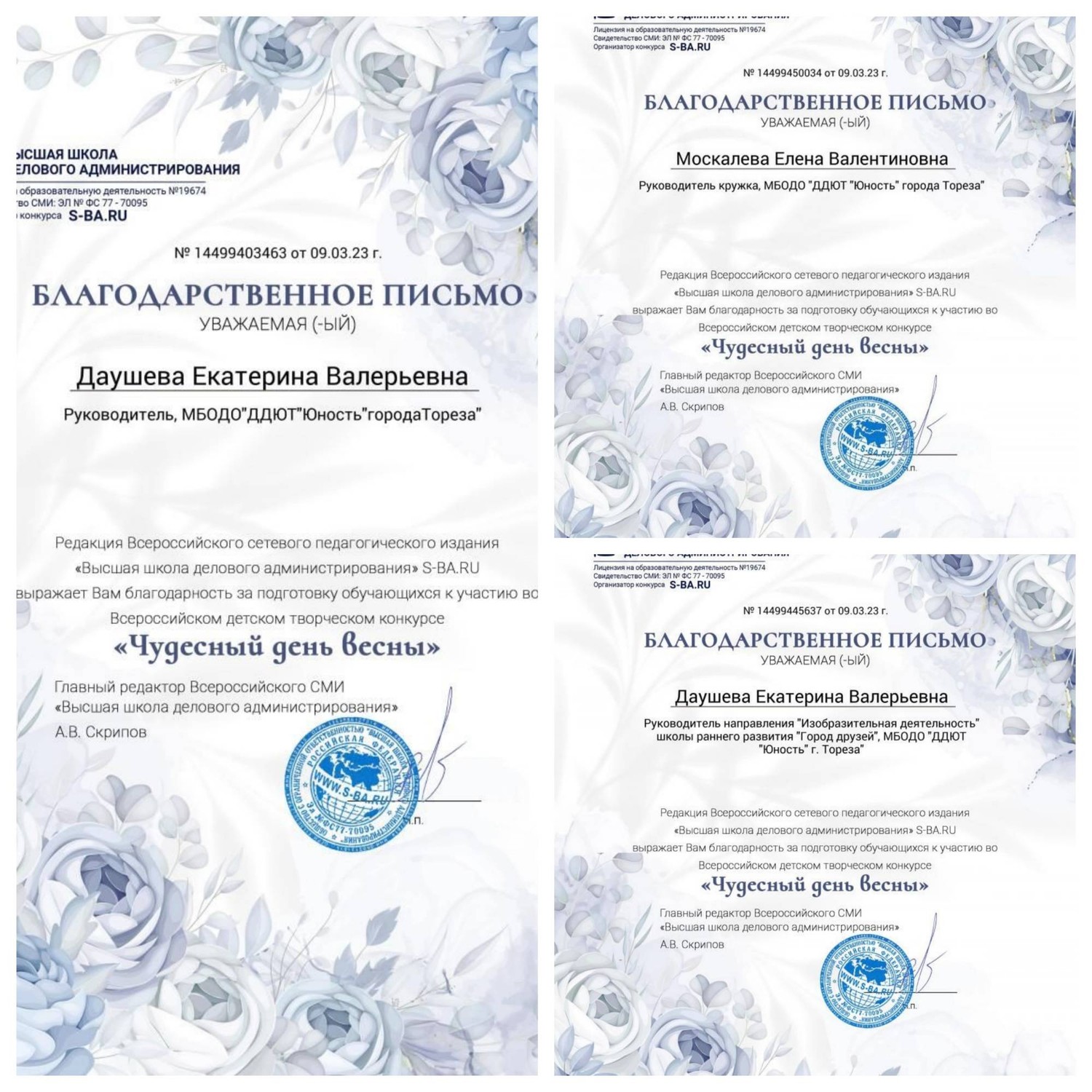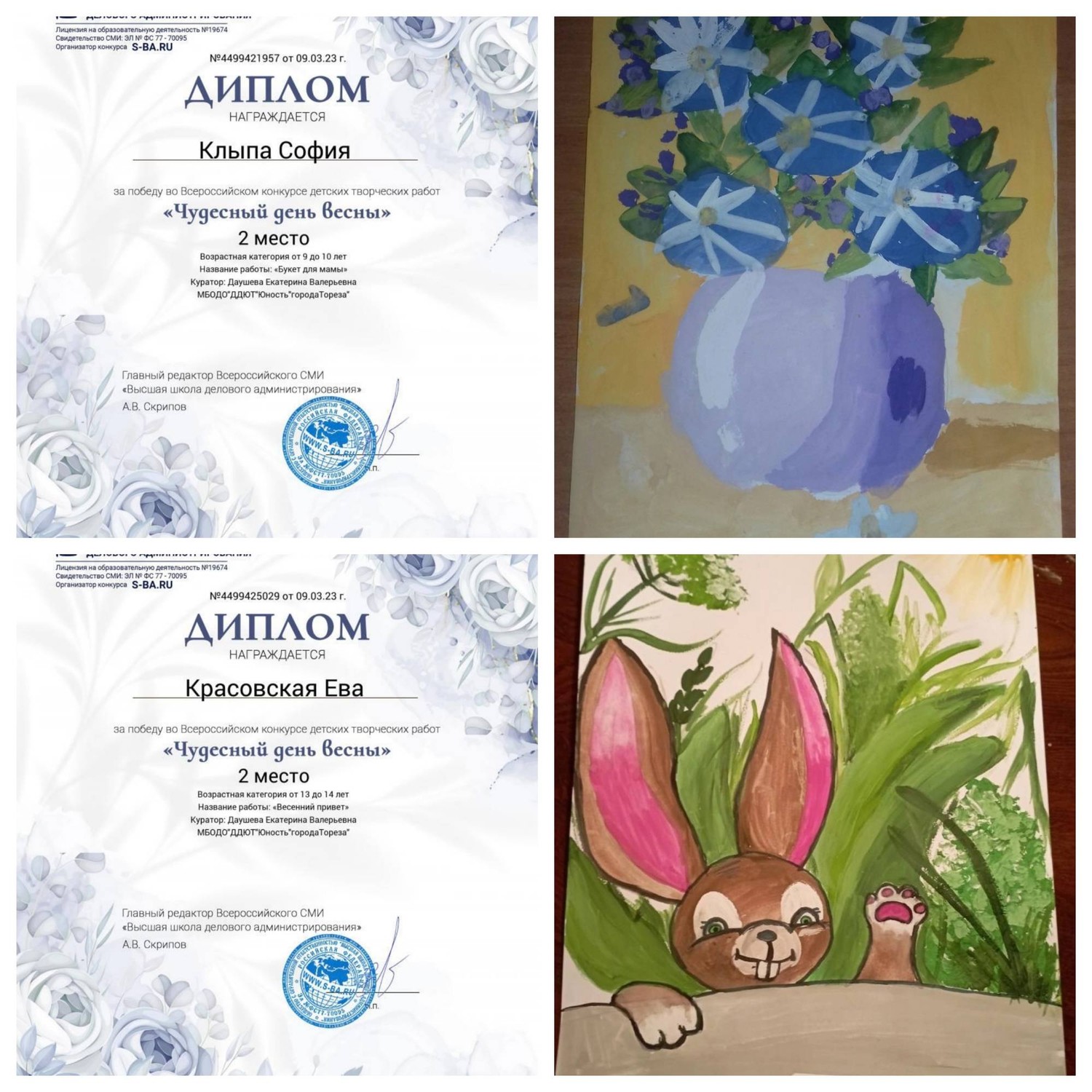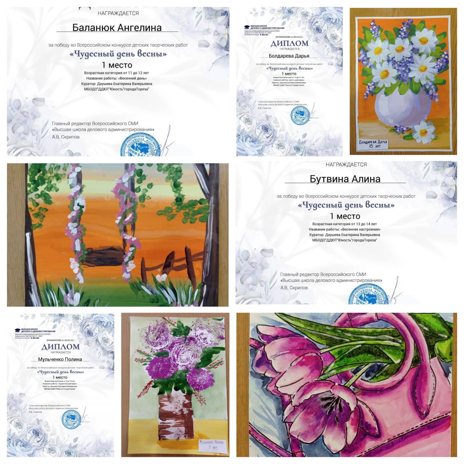 Я подарок маме Начал рисовать, Выглянуло солнце И зовёт гулять… Солнце, Солнце, Не сердись! Лучше рядышком садись. Мамин праздник раз в году, Нарисую и пойду! Улыбается солнце, совсем скоро зажурчат ручьи. Своим весёлым пением птицы напоминают нам о том, что пришла весна, а вместе с ней и главный замечательный праздник – Международный женский День 8 Марта. С 3 по 8 марта обучающиеся ТО МБОДО «ДДЮТ «Юность» приняли участие во Всероссийском конкурсе детских творческих работ «Чудесный день весны» (г. Екатеринбург) от Высшей школы делового администрирования. Цель Конкурса — развитие творческого мышления, фантазии и воображения; расширение кругозора детей. На конкурс надо было представить рисунок или поделку по теме. Итоги конкурса – 9 первых и 5 вторых мест. Народный художественный коллектив «Живопись и графика» (педагог Даушева Е.В.) – 4 первых и 2 вторых места: 1-е места – Болдарева Дарья, Баланюк Ангелина, Бутвина Алина, Мульченко Полина; 2-е места – Клыпа София и Красовская Ева. Школы раннего развития «Город друзей» и «Супер детки» (педагог направления «Изобразительное искусство» Даушева Е.В.) – 1 первое и 1 второе места: 1-е место – Слюта Дмитрий, 2-е место - Матиенко Полина. Образцовый художественный коллектив «Школа красоты» (педагог Москалева Е.В.) – 4 первых и 2 вторых места: 1-е места – Савченко Дарина, Тимченко Екатерина, Карпенко Анна, Трутяк Виктория; 2-е места – Тимченко Маргарита, Кобрак Лидия. Педагоги награждены благодарственными письмами. Молодцы!