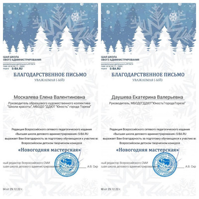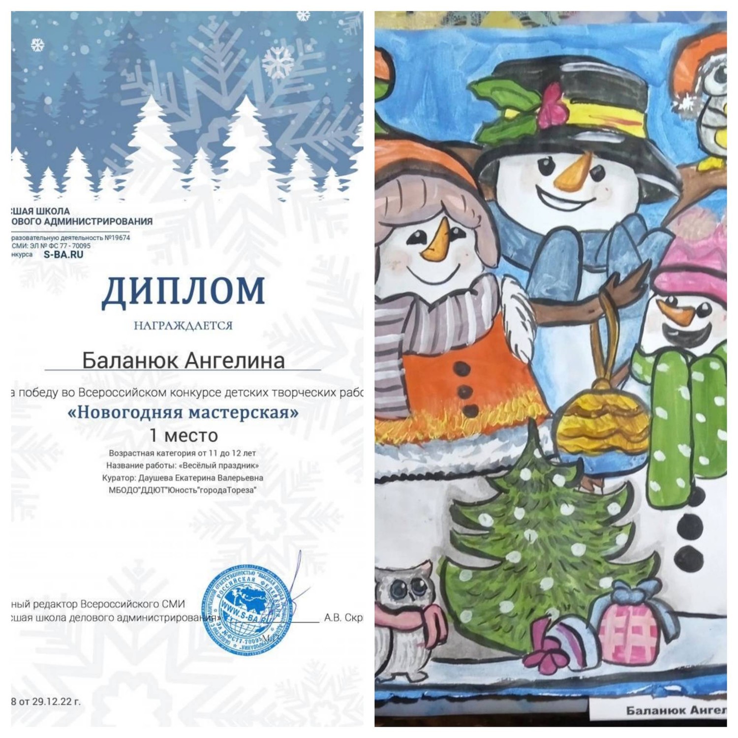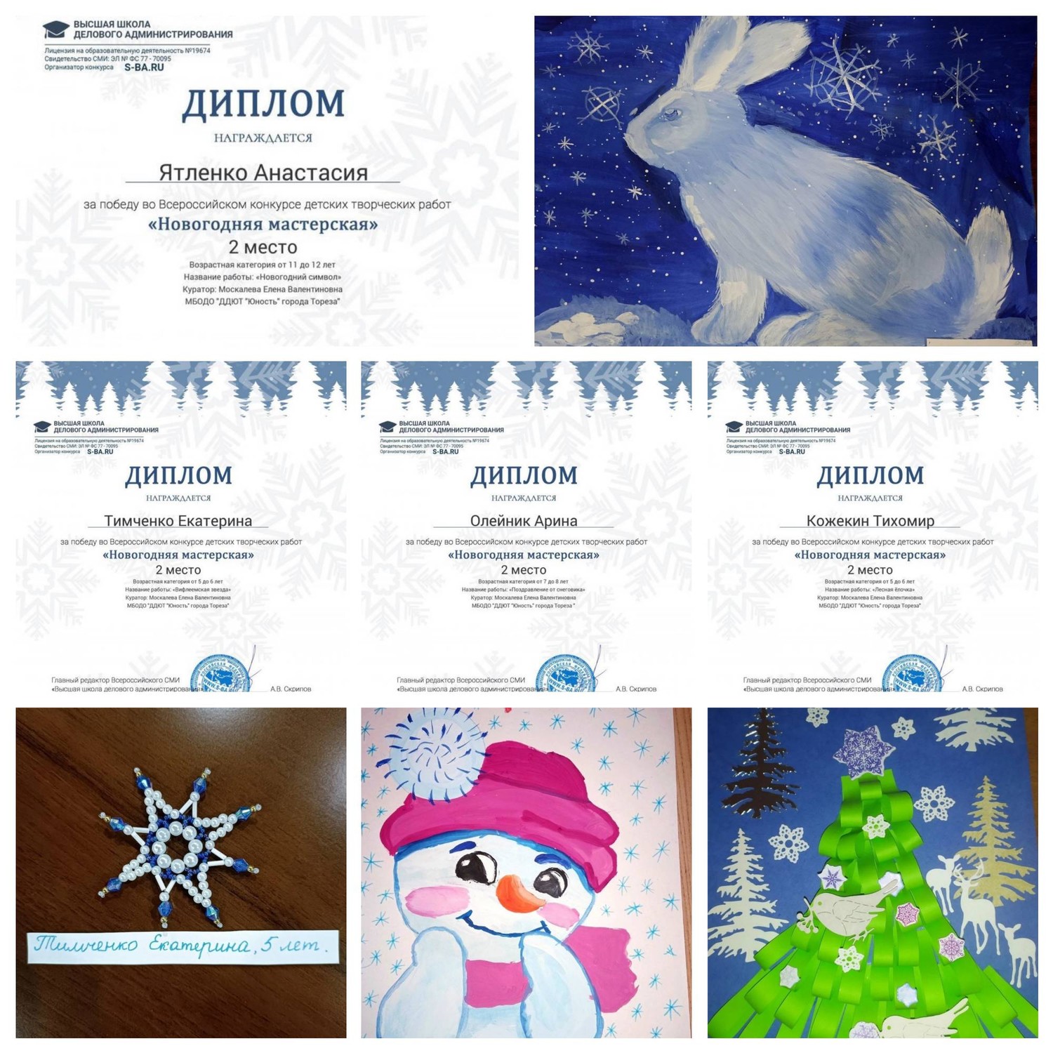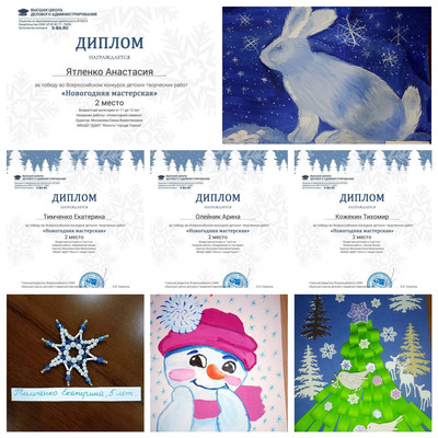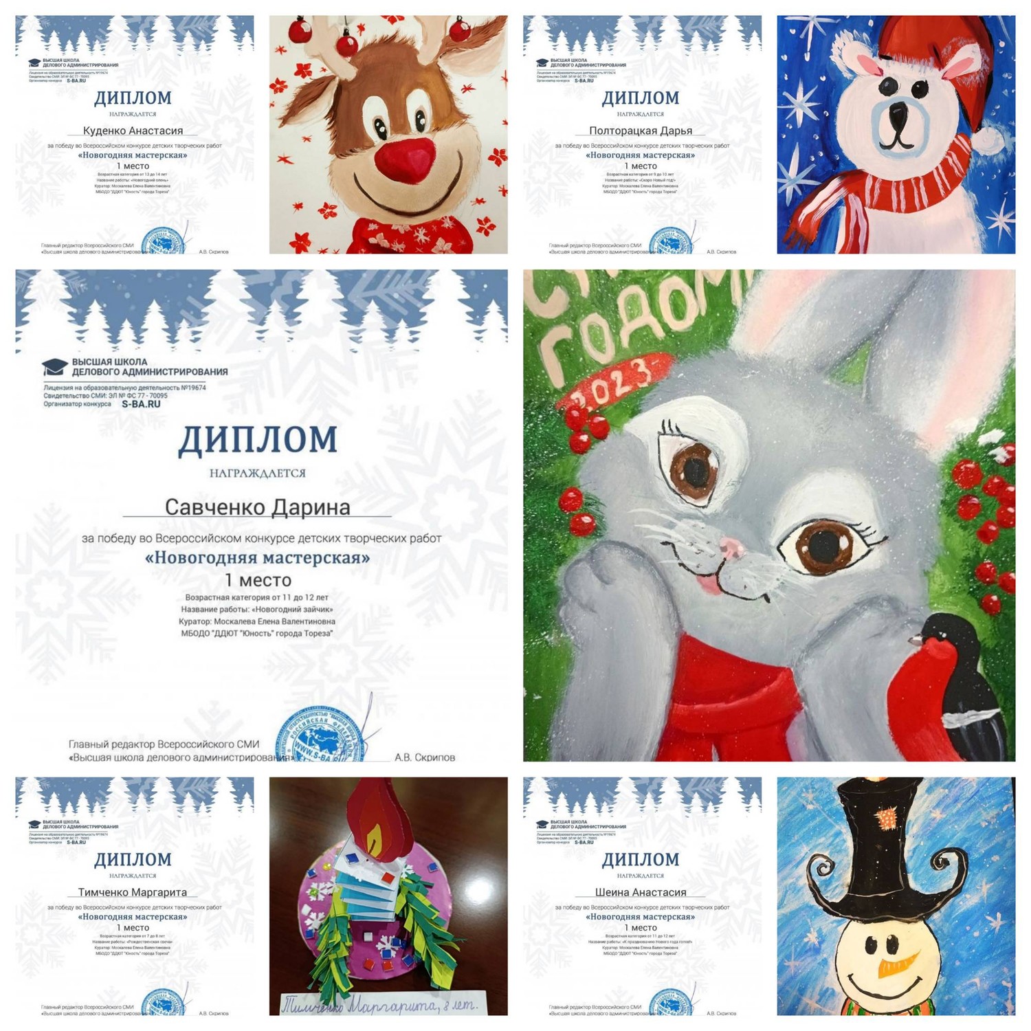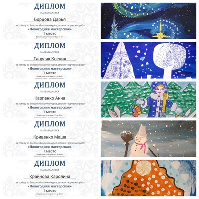 Новый год является главным праздником в календаре, его ждут, в него верят, загадывают желания. Новый год - для детей это праздник, которого они всегда с нетерпением ждут. Каждый ребёнок верит в чудеса и в исполнение желаний. В доме снова пахнет елкой, готовятся разноцветные украшения для лесной гостьи. С 23 декабря 2022 года – 28 декабря 2022 года обучающиеся творческих объединений приняли участие во Всероссийском конкурсе детских творческих работ «Новогодняя мастерская» Цель Конкурса — развитие творческого мышления, фантазии и воображения; расширение кругозора детей. Итоги конкурса – 11 первых и 4 вторых места! Образцовый художественный коллектив «Школа красоты» (педагог Москалева Е.В.) – 10 первых и 4 вторых. 1-е места – Савченко Дарина, Тимченко Маргарита, Борцова Дарья, Гануляк Ксения, Карпенко Анна, Кривенко Мария, Крайнова Ангелина, Куденко Анастасия, Полторацкая Дарья, Шеина Анастасия; 2-е места – Кожекин Тихомир, Тимченко Екатерина, Ятленко Анастасия, Олейник Арина. Народный художественный коллектив «Живопись и графика» )педагог Даушева Е.В.): 1-е место – Баланюк Ангелина. Руководители награждены благодарственными письмами. Молодцы! | |